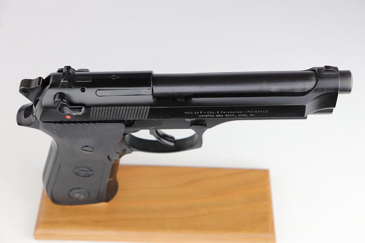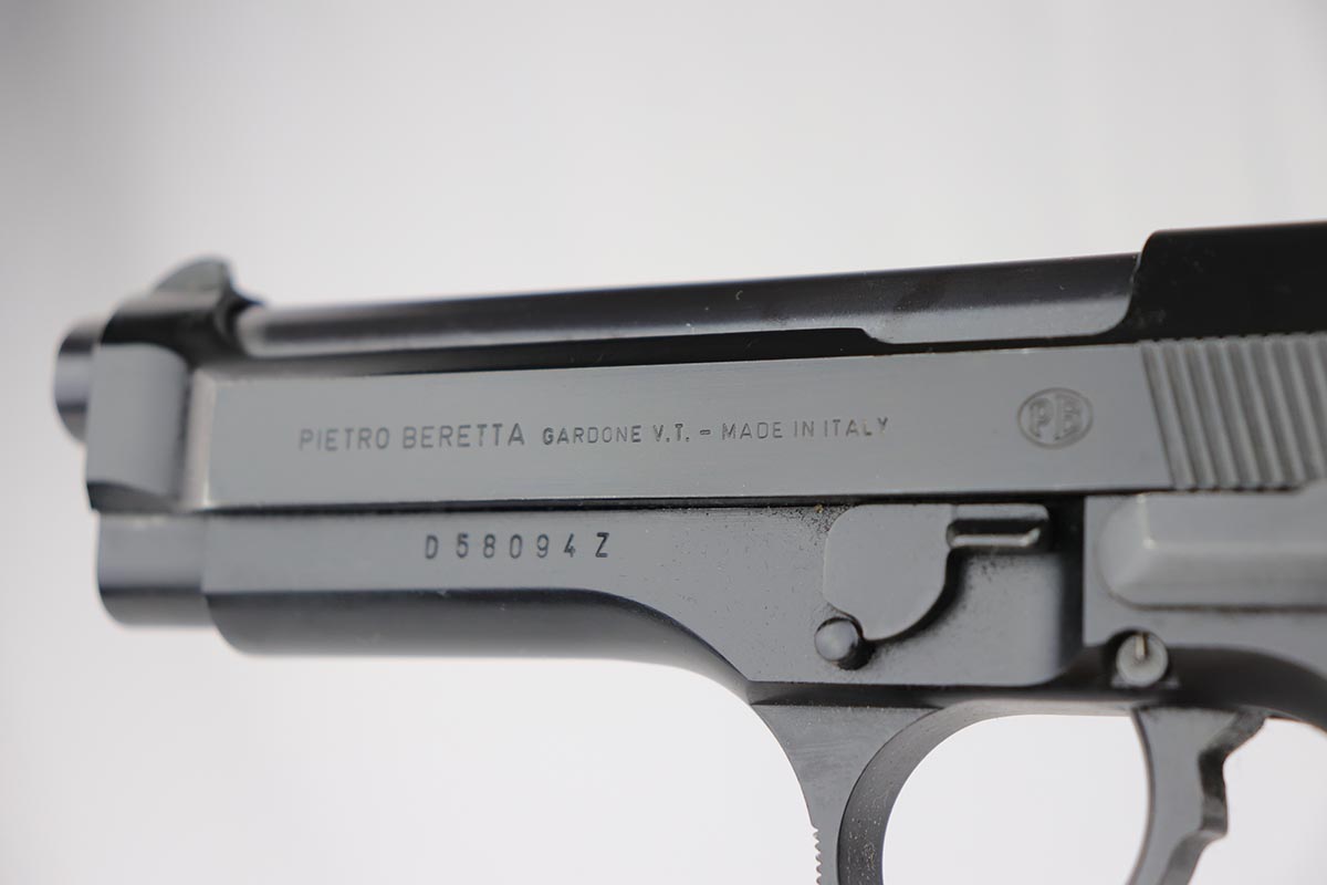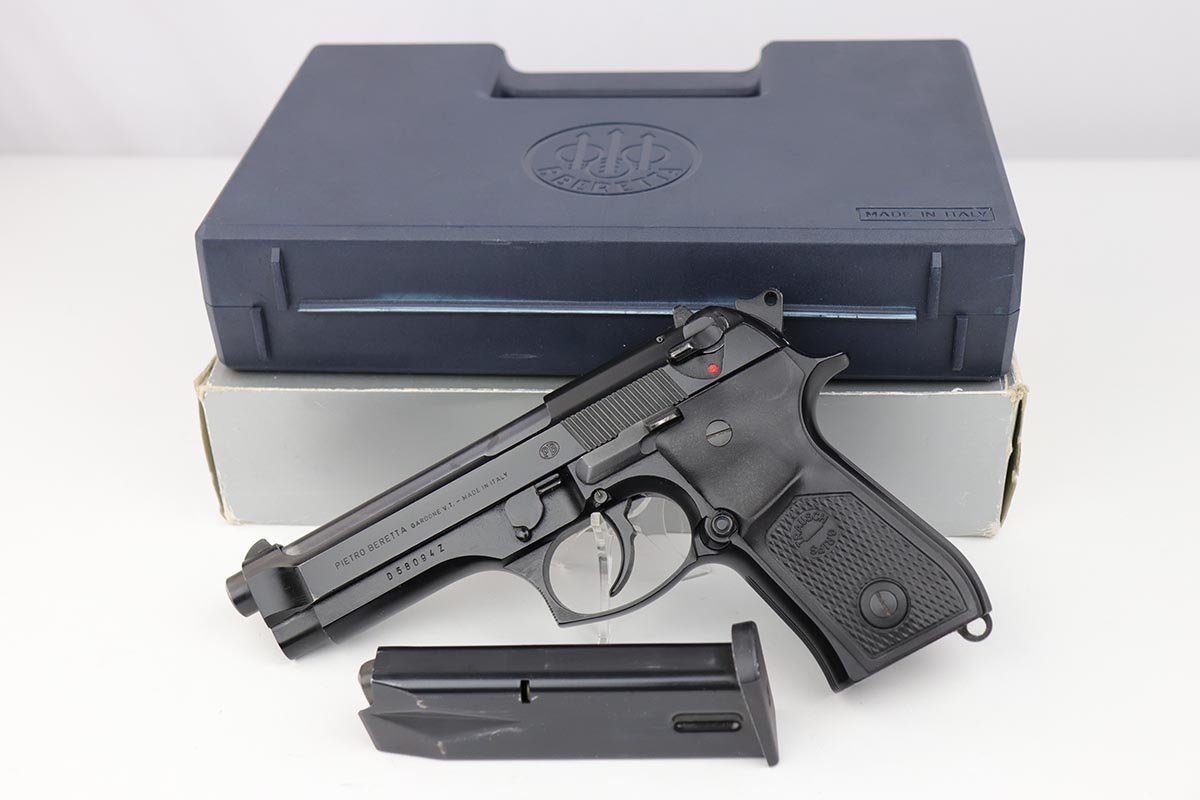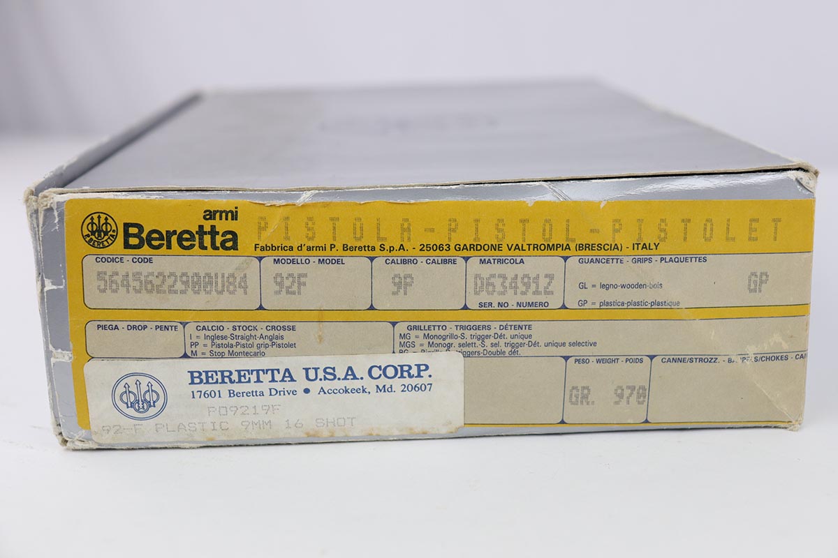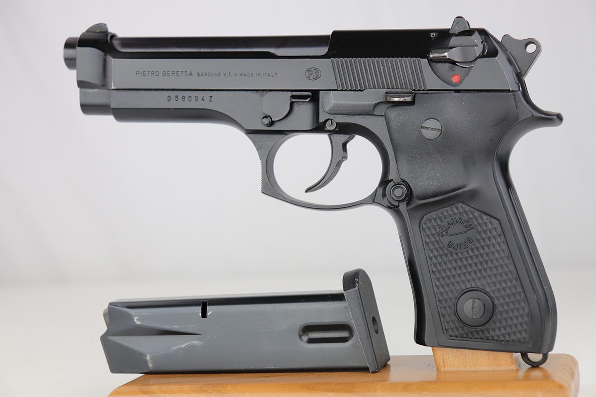 8/22/19 – This is a very nice, all original Beretta 92F in 97% condition. It was made in the late 1980s, complete with its original plastic case and outer carton that is only a couple of thousand digits off the gun’s serial. The gun shows a spot of finish loss on the front strap and some wear on the barrel from being racked. Excellent bore. The grips are very desirable Trausch thin profile grips, that make the gun much easier to handle. They are no longer available. The pair of the original wood grips is included in the sale as well, although not shown in the pictures.