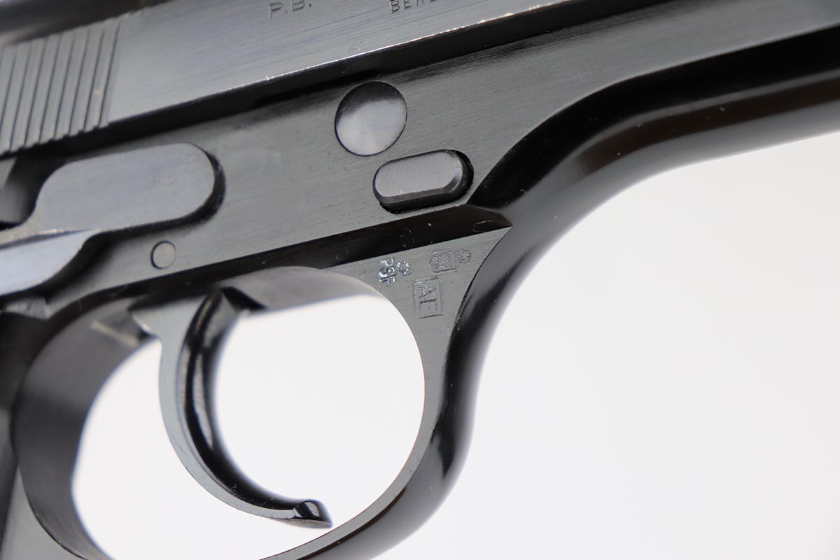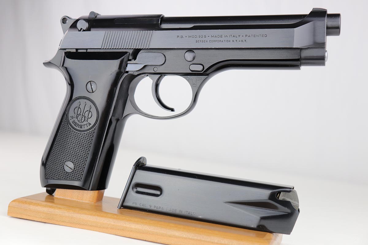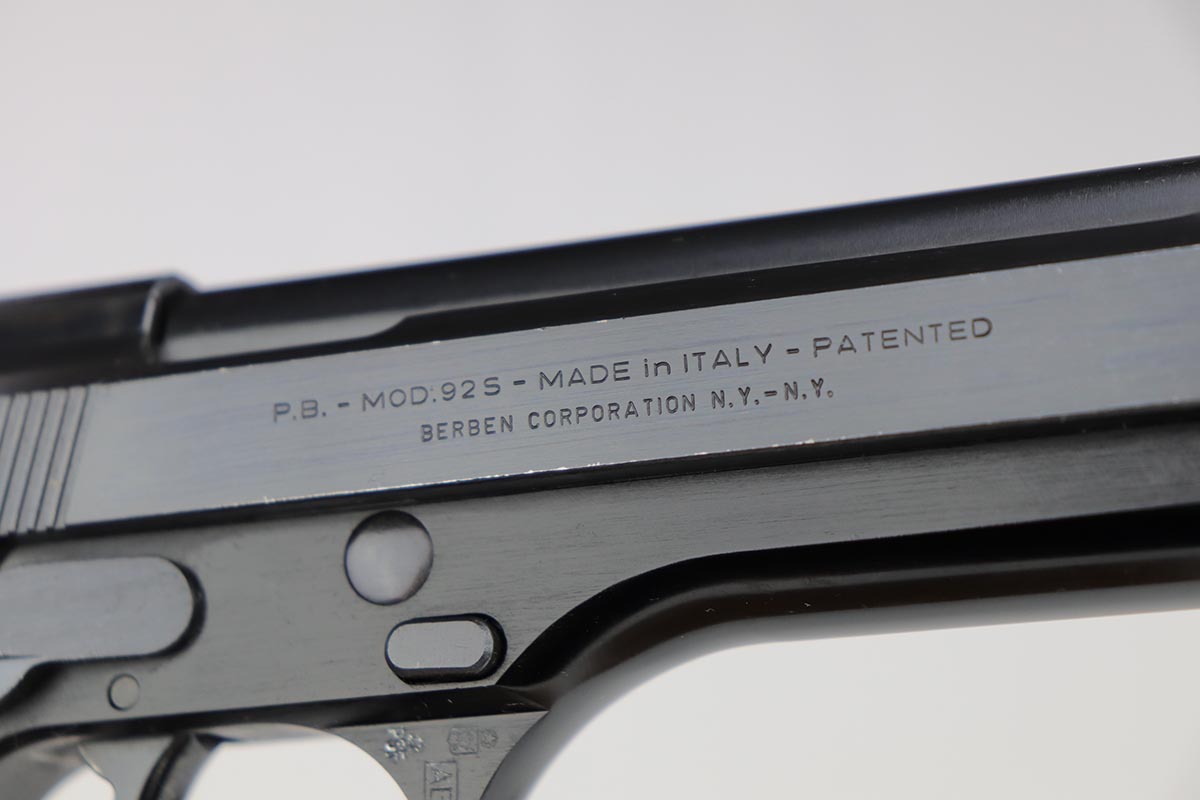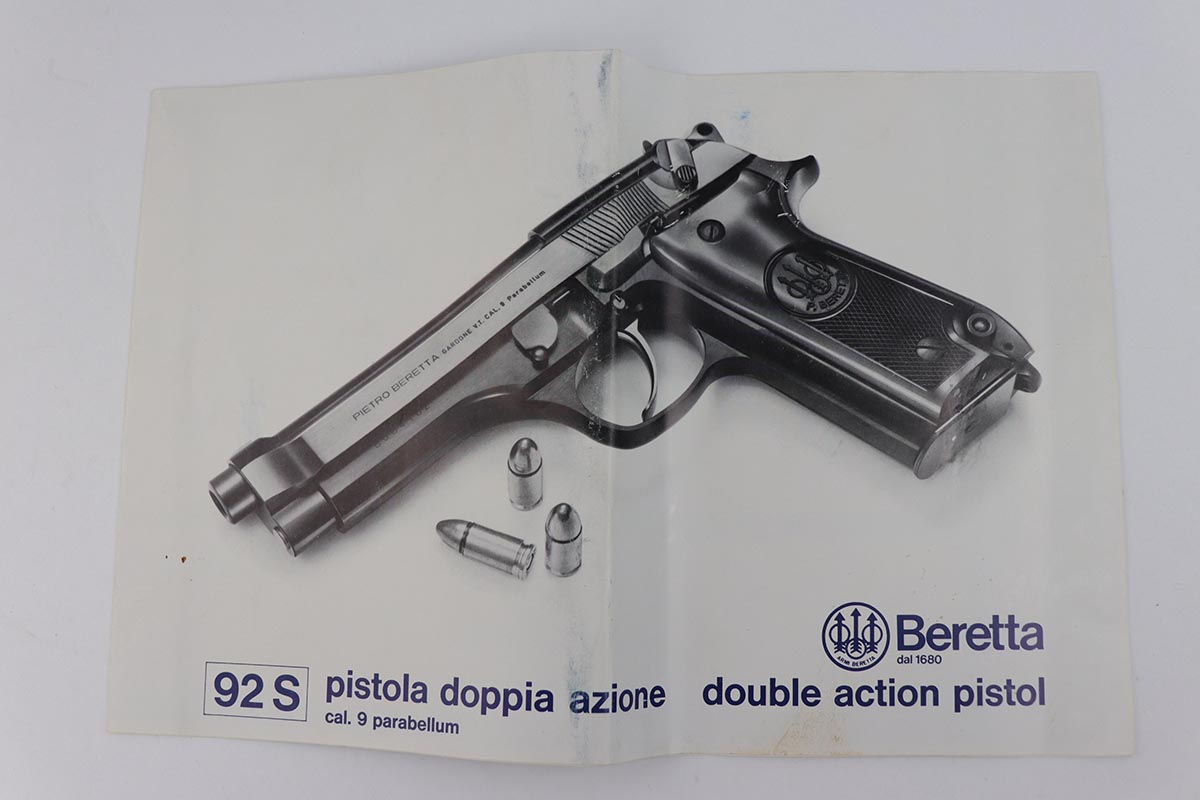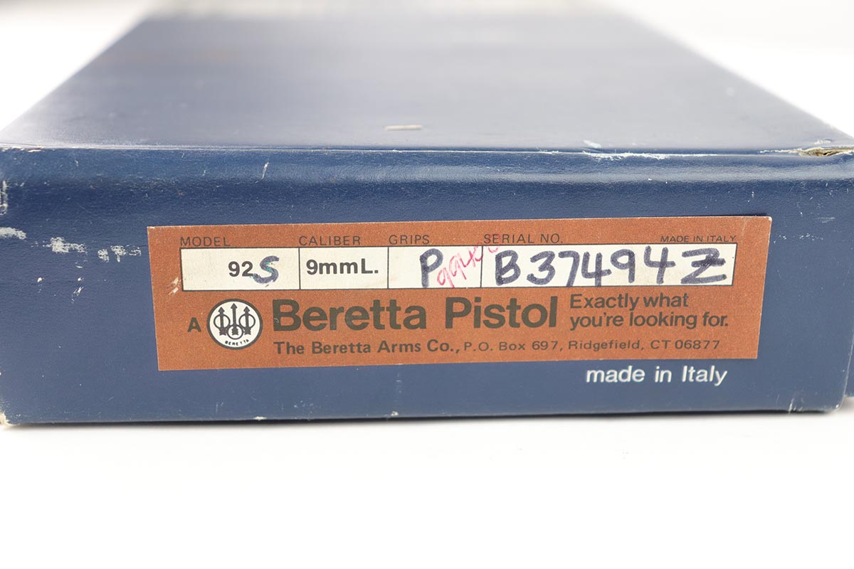 8/22/19 – The Beretta 92S was the first Beretta 92 series gun to have a slide mounted safety. It still retained the bottom magazine release from the original Model 92. This gun was made during US Army trials in the early 1980s, when the change to a slide mounted safety was requested by the US government. This gun is mint and appears unfired. It comes with its original serialized box and manual. It is beautifully finished in high gloss blue, unlike the later 92 series models that were matte.