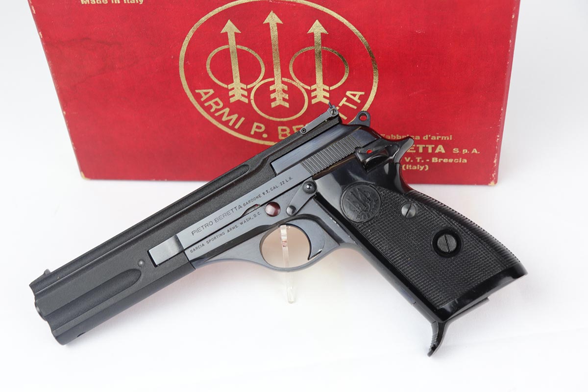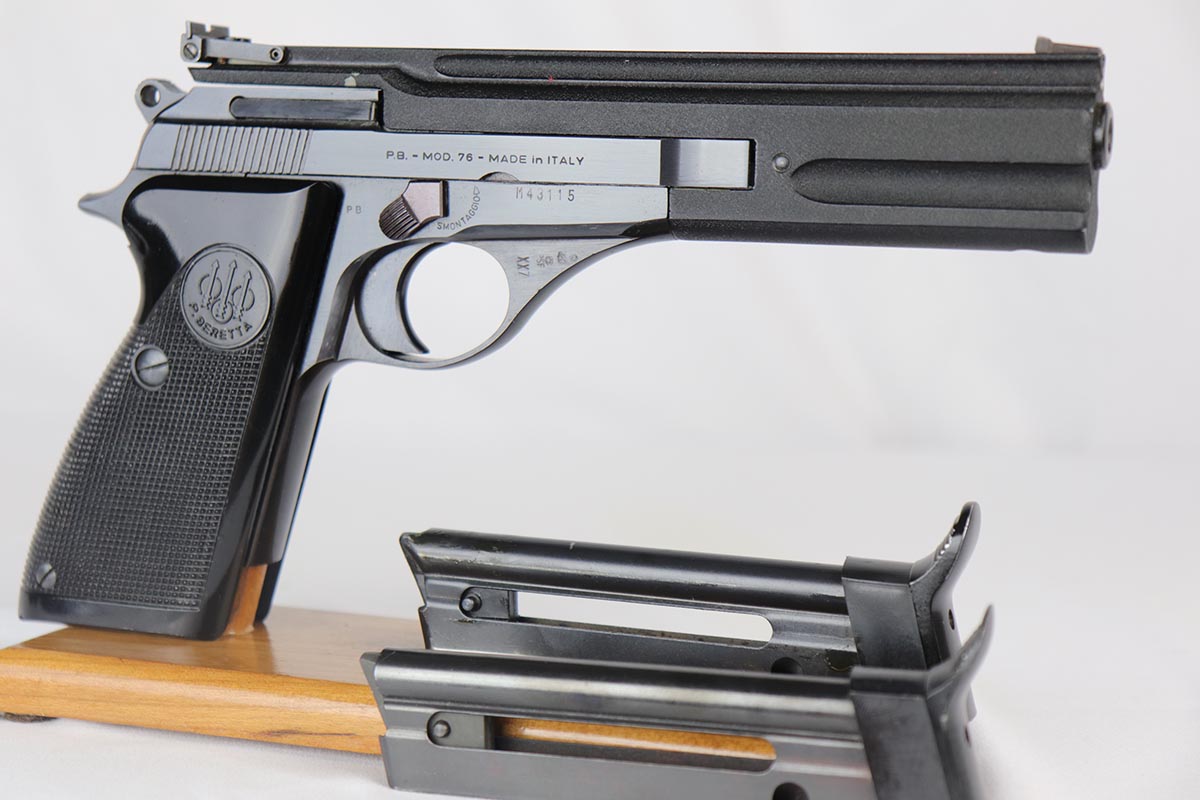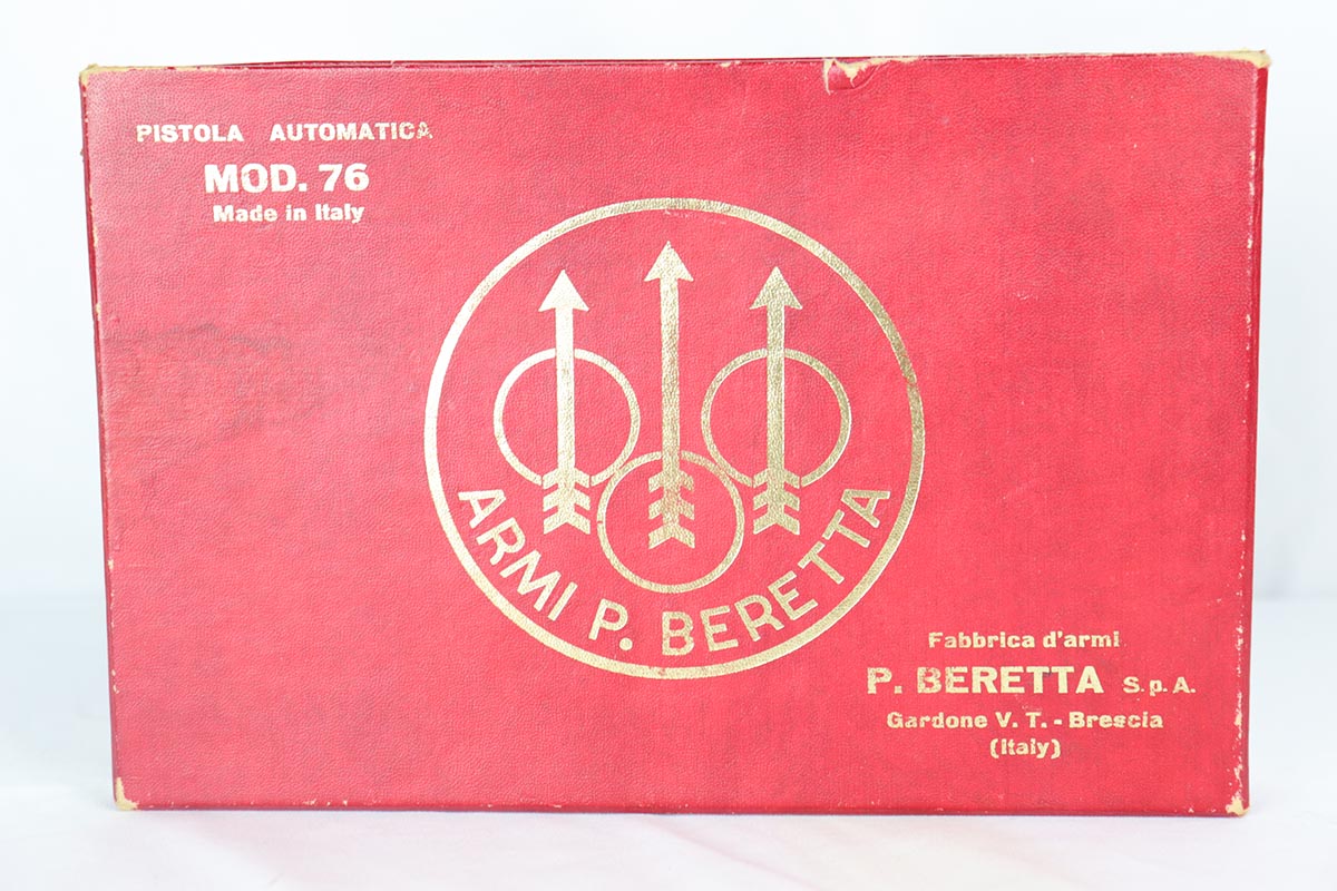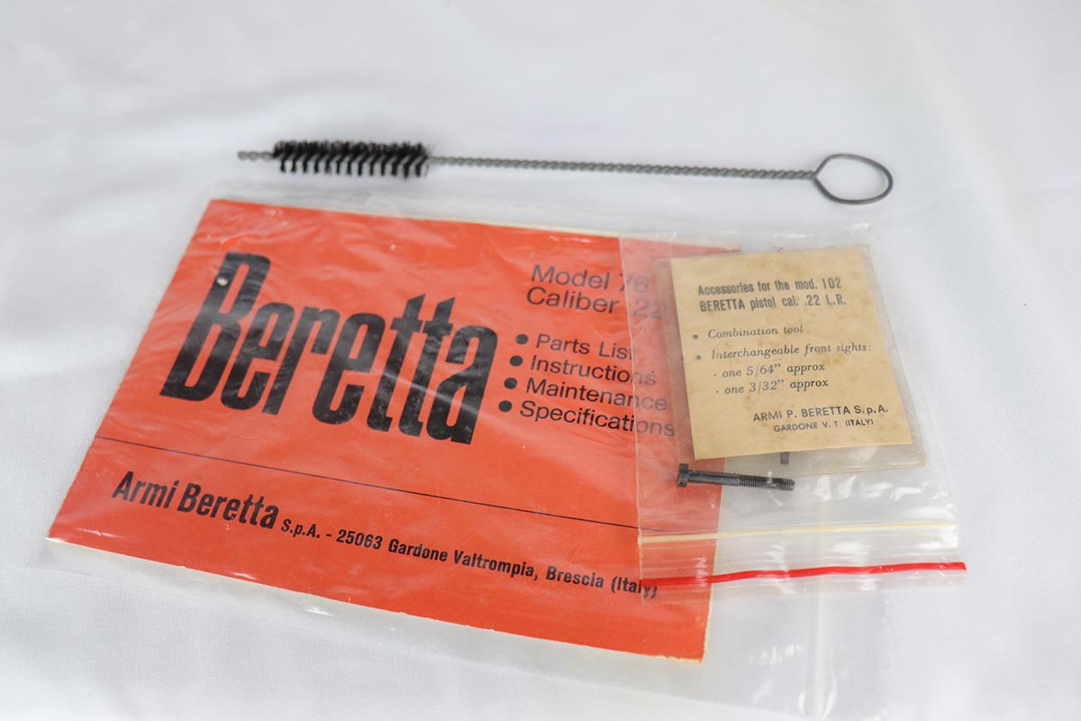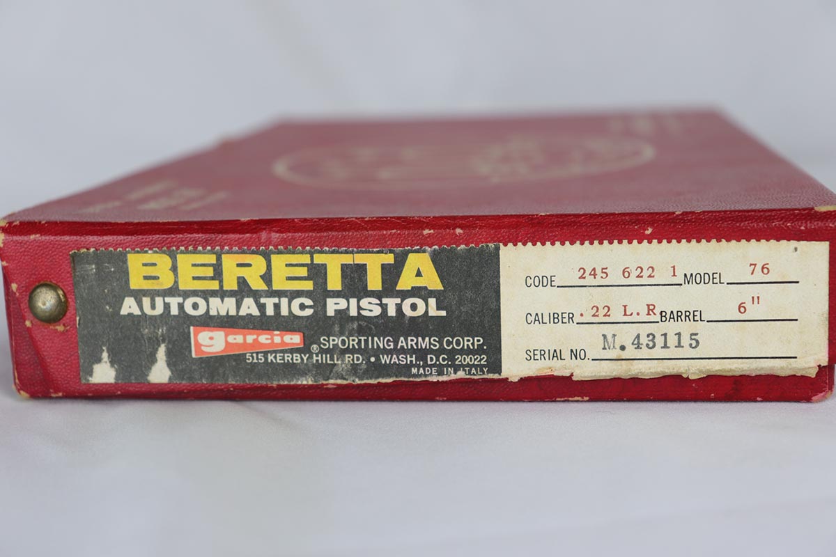 10/10/18 – This is a mint, early Beretta 76 target pistol, chambered in .22LR in an original matching serial numbered red box. Very early M76 berettas had an “M” prefix serial number and are rarely seen today. This particular gun appears unfired with beautiful high polished blue. It has a date code of XX7 and was made in 1971. It is a complete set and comes with 2 magazines, spare set of wood grips, manual, cleaning rod and a factory plastic bag with accessories. An impossible to upgrade set.