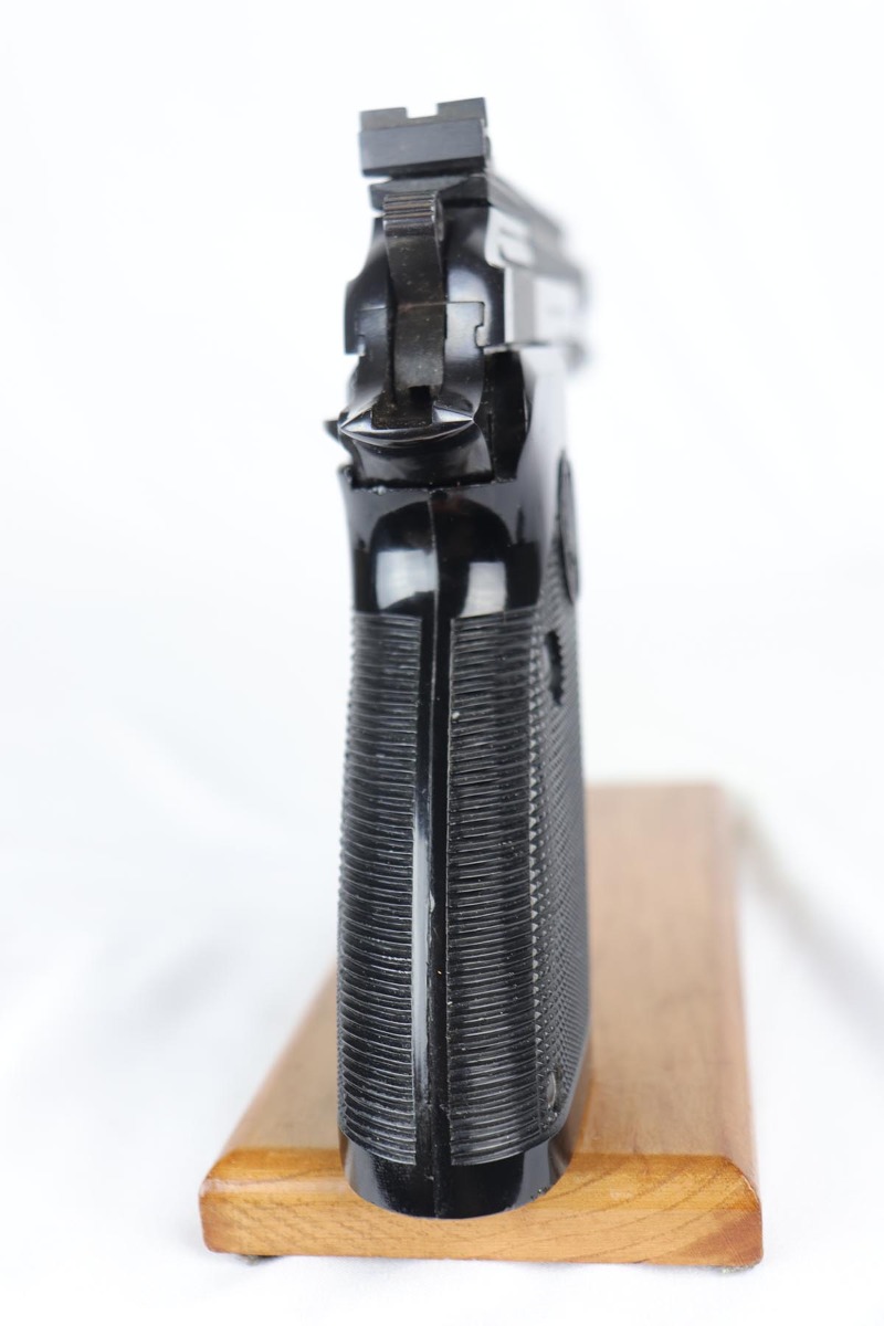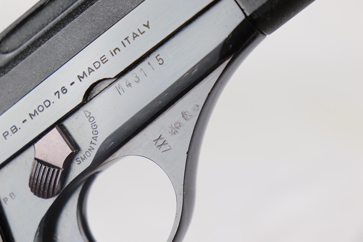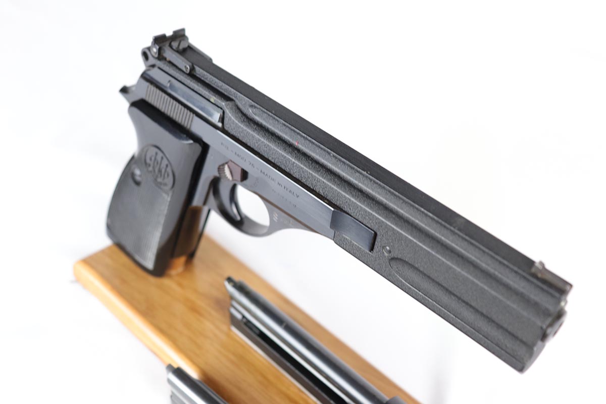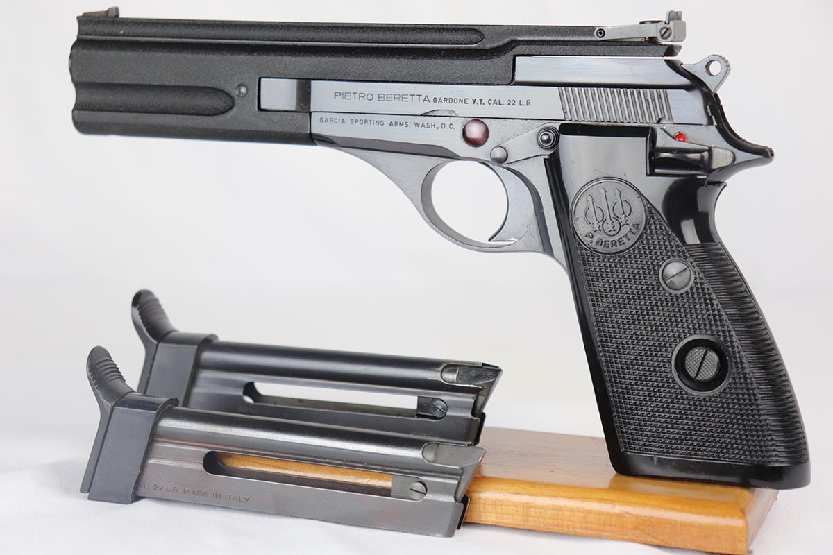 10/10/18 – This is a mint, early Beretta 76 target pistol, chambered in .22LR in an original matching serial numbered red box. Very early M76 berettas had an “M” prefix serial number and are rarely seen today. This particular gun appears unfired with beautiful high polished blue. It has a date code of XX7 and was made in 1971. It is a complete set and comes with 2 magazines, spare set of wood grips, manual, cleaning rod and a factory plastic bag with accessories. An impossible to upgrade set.