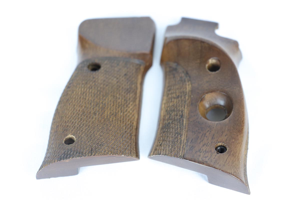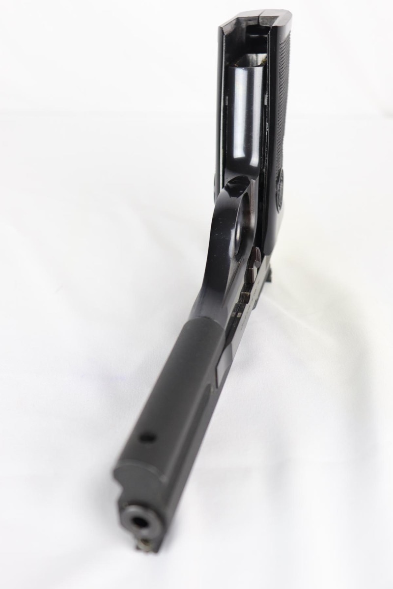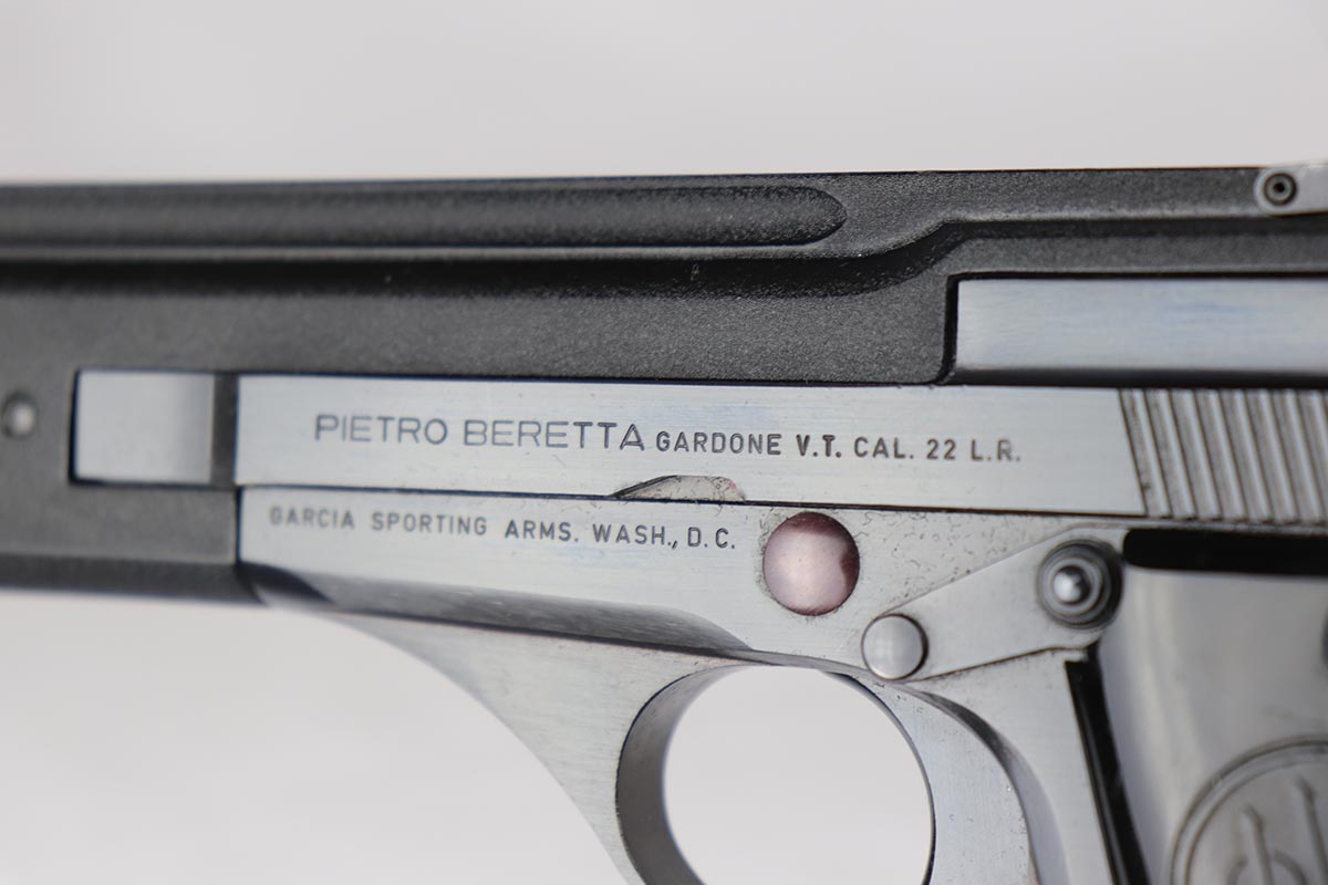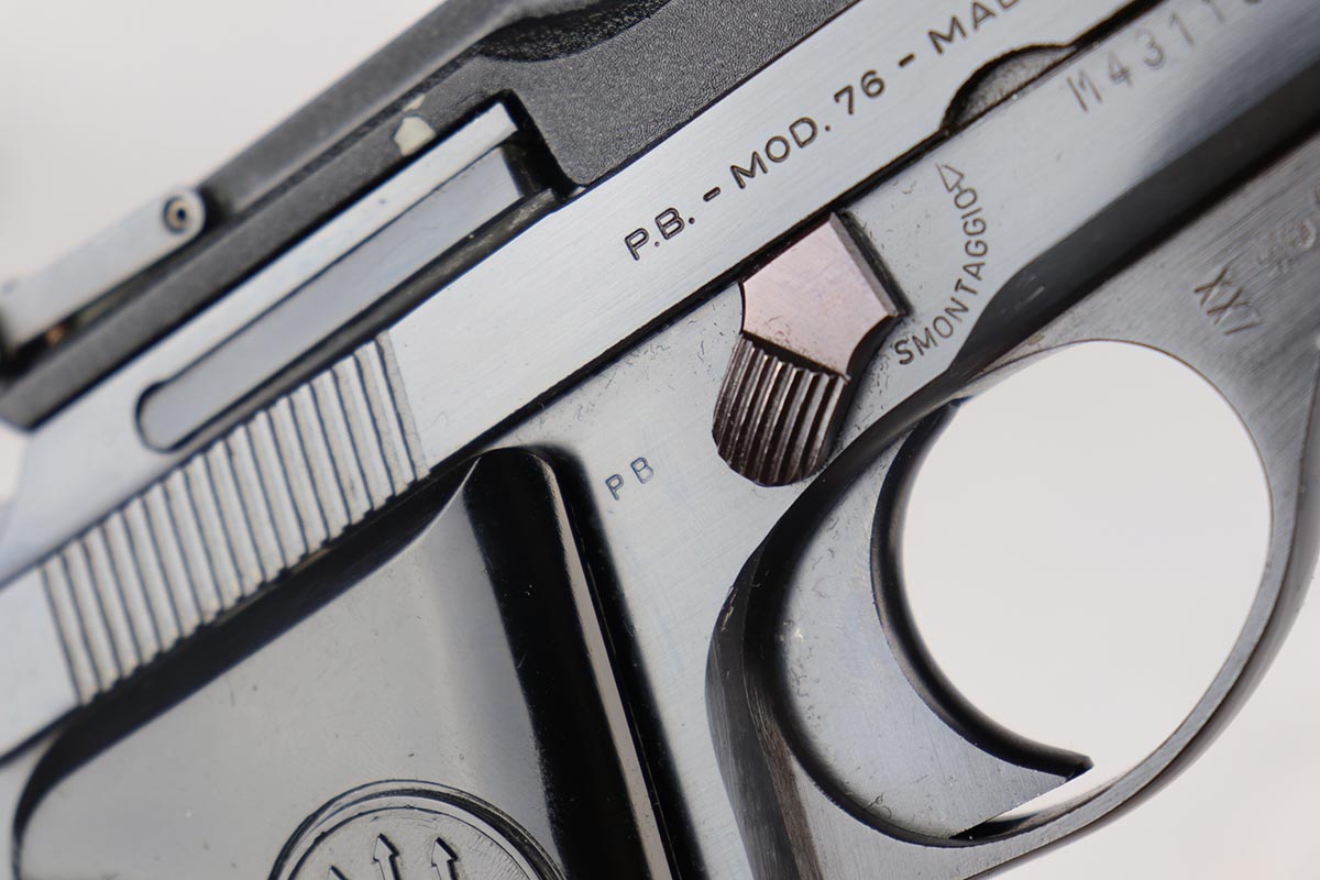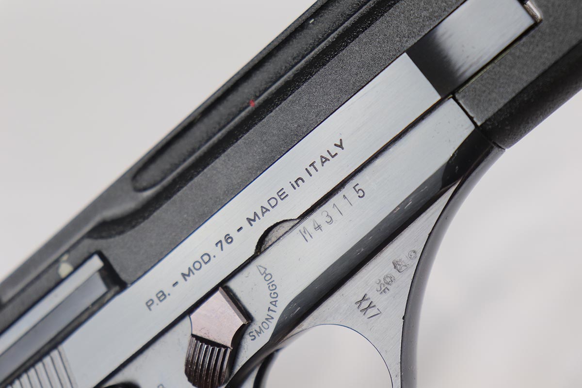 10/10/18 – This is a mint, early Beretta 76 target pistol, chambered in .22LR in an original matching serial numbered red box. Very early M76 berettas had an “M” prefix serial number and are rarely seen today. This particular gun appears unfired with beautiful high polished blue. It has a date code of XX7 and was made in 1971. It is a complete set and comes with 2 magazines, spare set of wood grips, manual, cleaning rod and a factory plastic bag with accessories. An impossible to upgrade set.