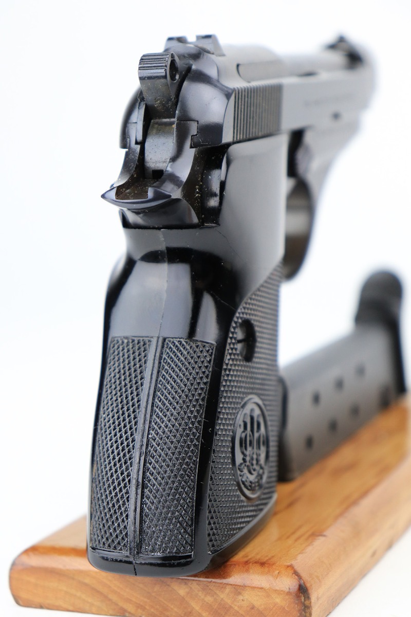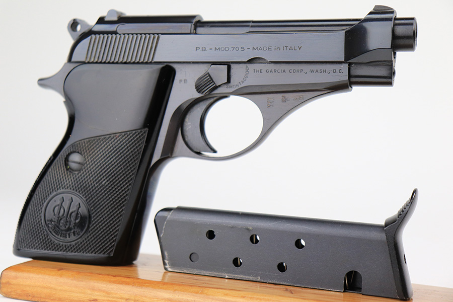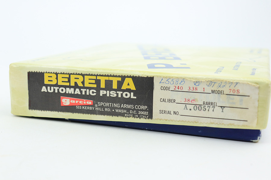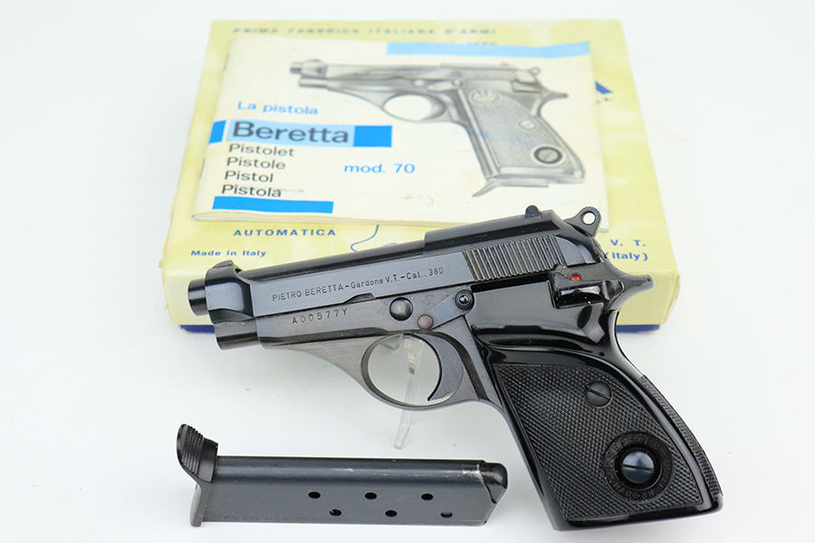 6/1/22 – This is a mint example of a Beretta Model 70S manufactured in 1974. It is all matching and has the proper Italian proofs. It comes with its original matching-numbered box and owners manual. The gun is in mint condition with no obvious signs of wear. Comes with excellent black plastic grips and one finger extension magazine. The bore is near-mint.