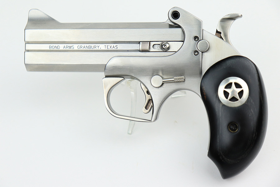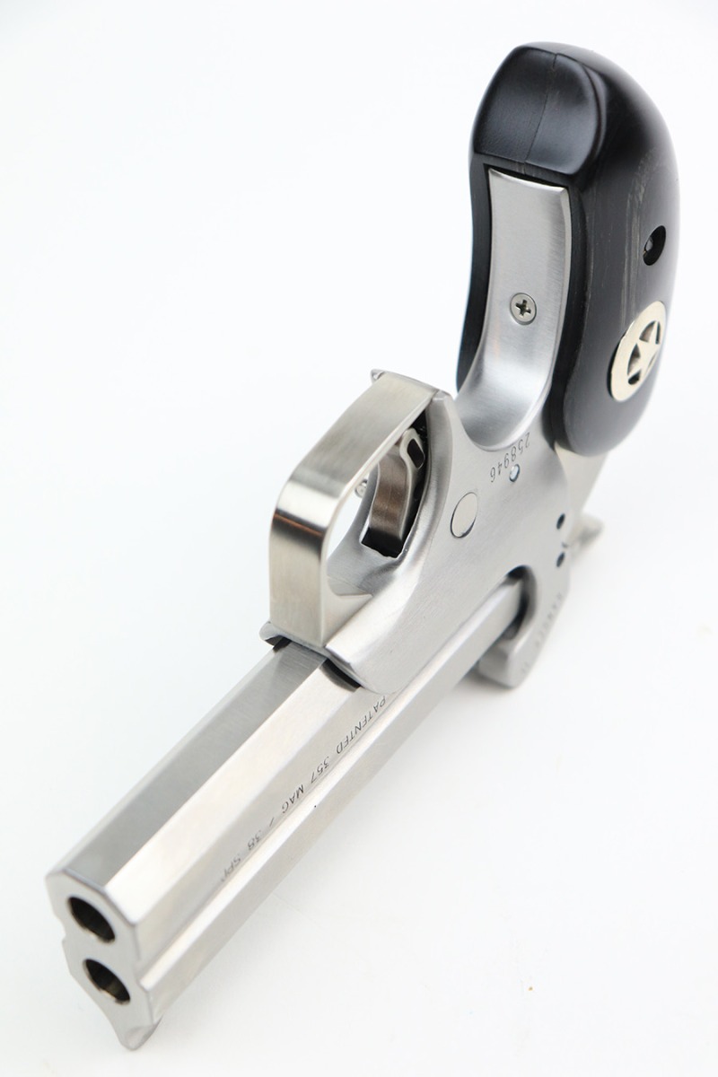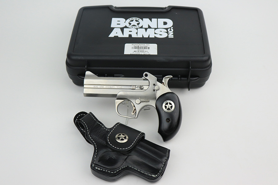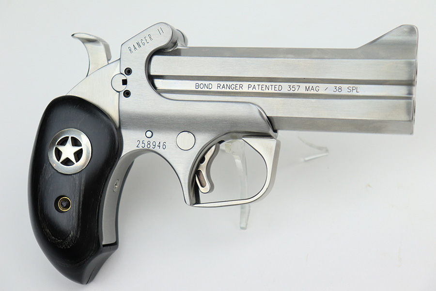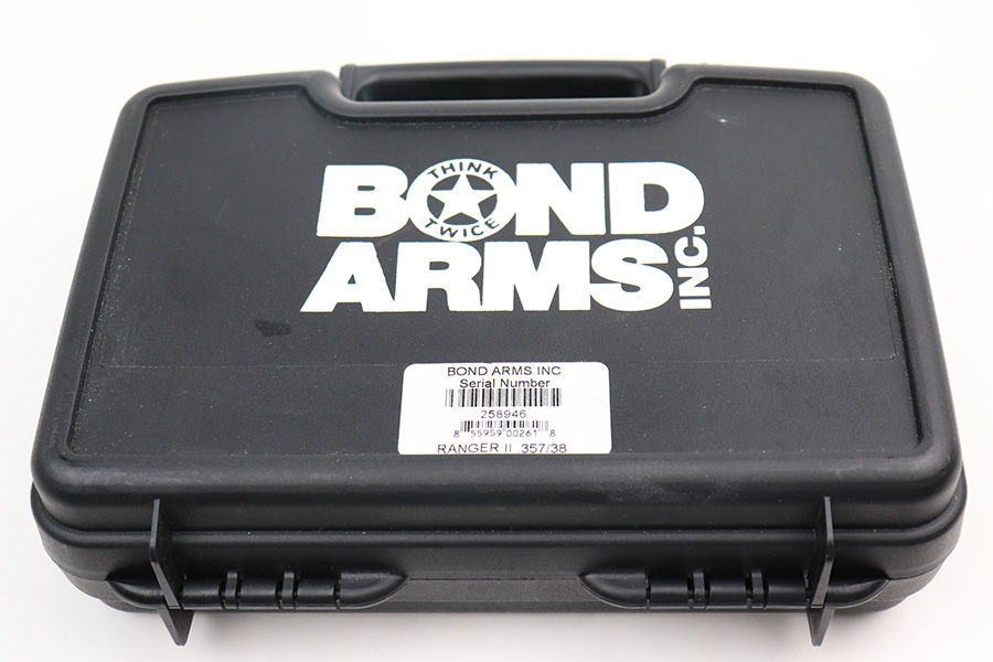 5/31/22 – This is a like-new example of a Bond Arms Ranger II Deringer-style pistol chambered in both .357 Magnum and .38 Special. It comes with its original case, owners manual, and black leather holster. The gun is in like-new condition with no obvious signs of wear. Mint bore.