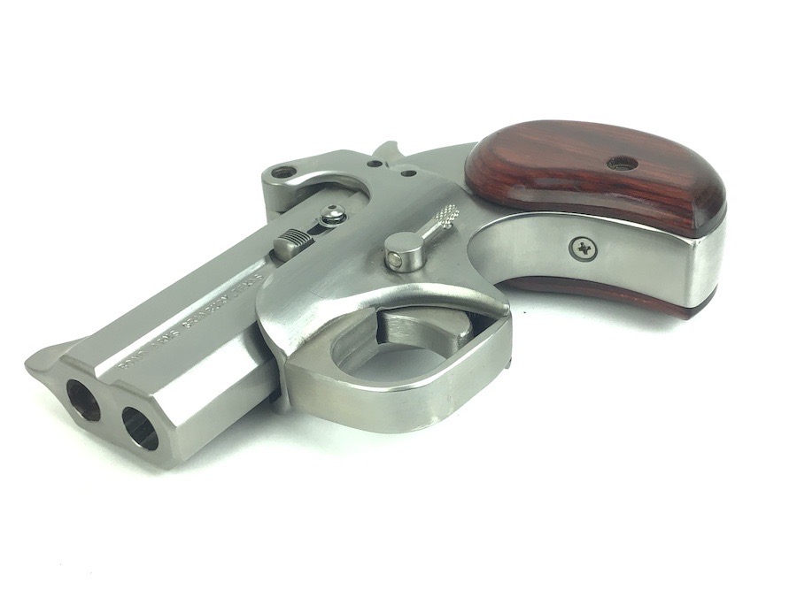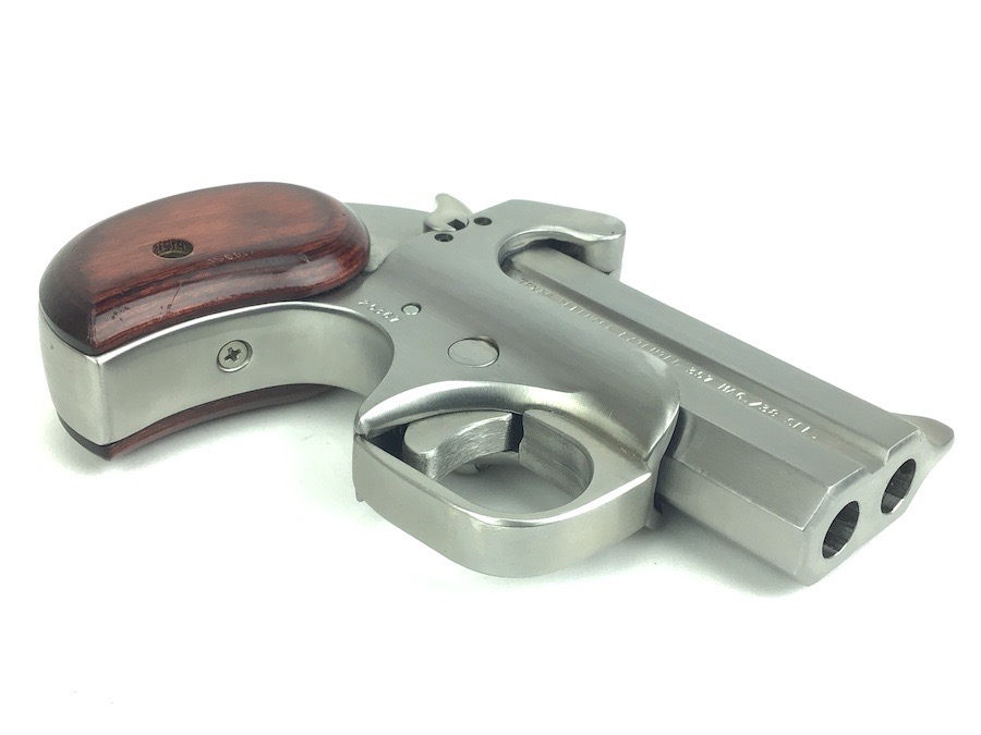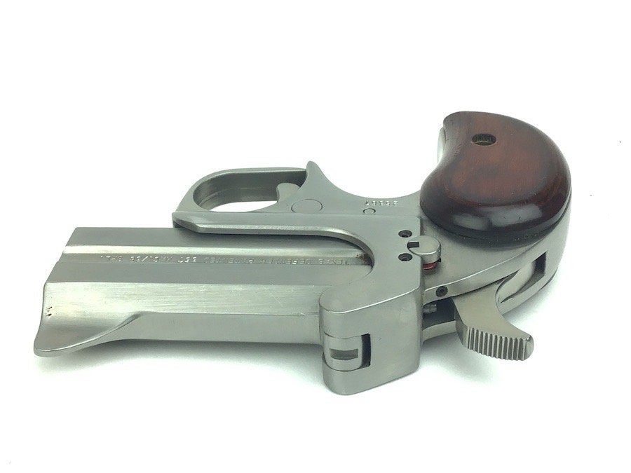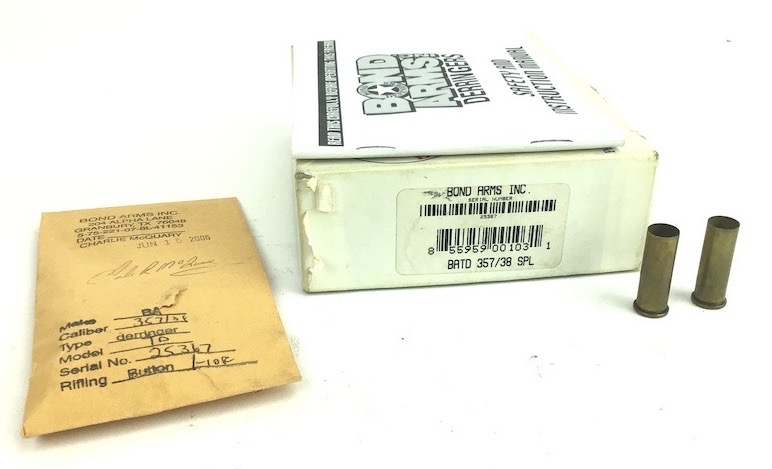 6/4/24 – As new in original box. Bond Arms Texas Defender .357 Magnum/.38 Special, double barrel derringer. Features 3 inch barrels and Stainless Steel construction. Automatic spent casing extractor, a rebounding hammer, and retracting firing pins. You will also notice a cross bolt safety and a spring loaded cammed locking lever. SA design. Includes original box and manual along with the test fire spent cartridges.