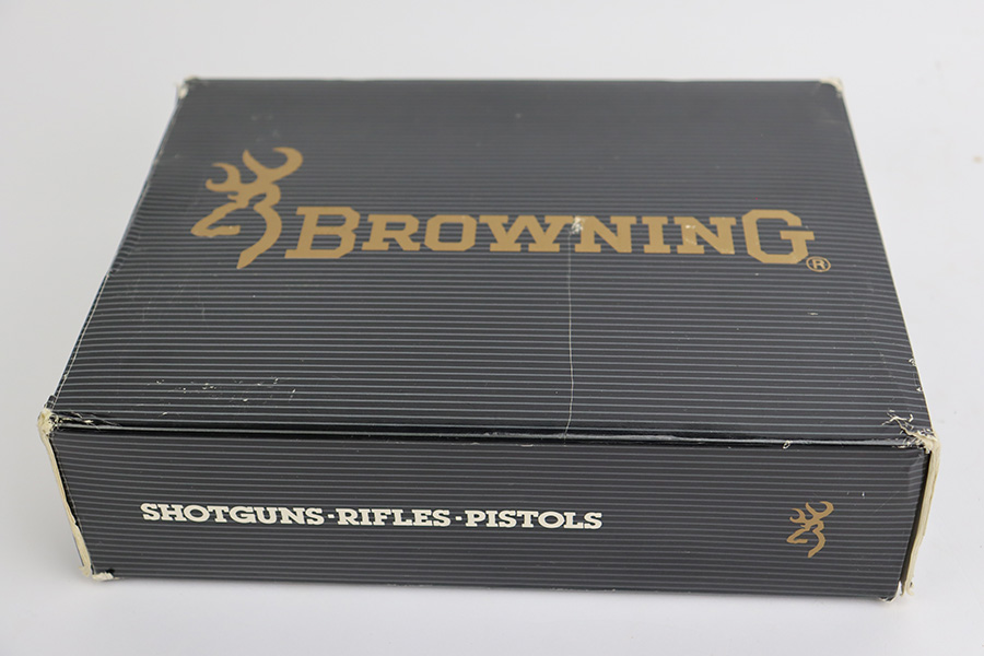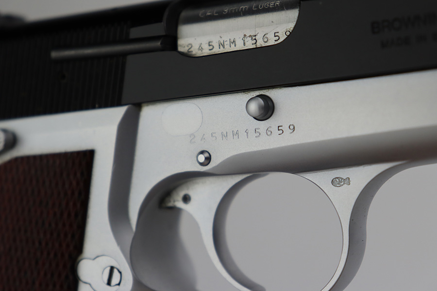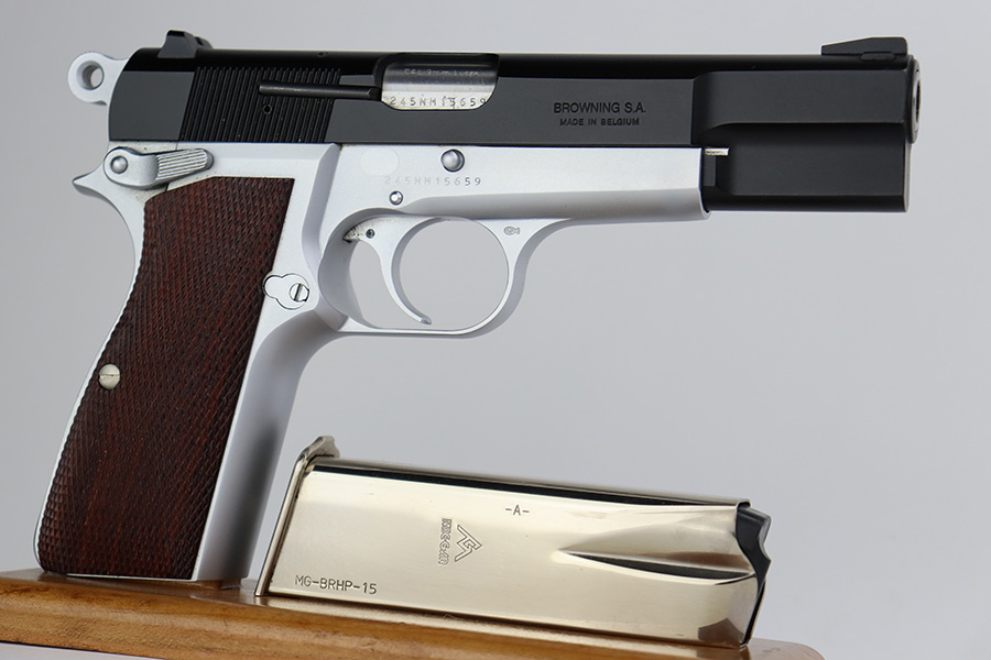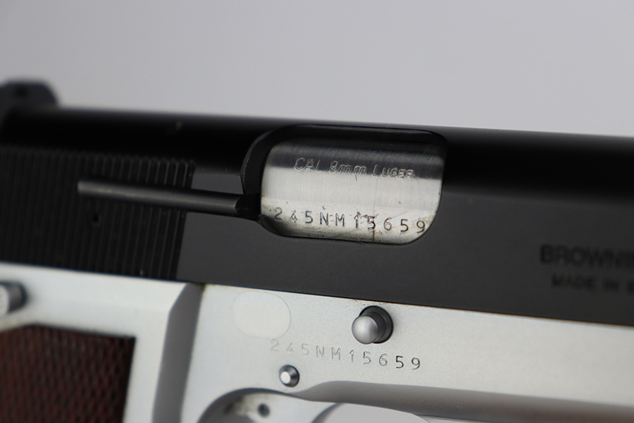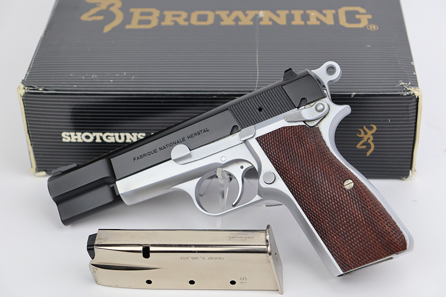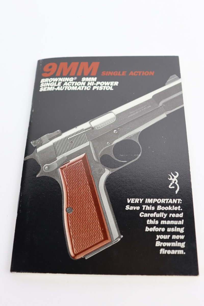 7/14/23 – This is a like-new example of a Browning Hi Power, manufactured in 1990 and chambered in 9mm Luger. It has a blued slide and a flat stainless frame. Fitted with beautiful wood grips. The gun is mint with no apparent signs of wear or use. Mint bore. The gun comes with its original matching-numbered box, owners manual, cleaning rod, and one magazine.