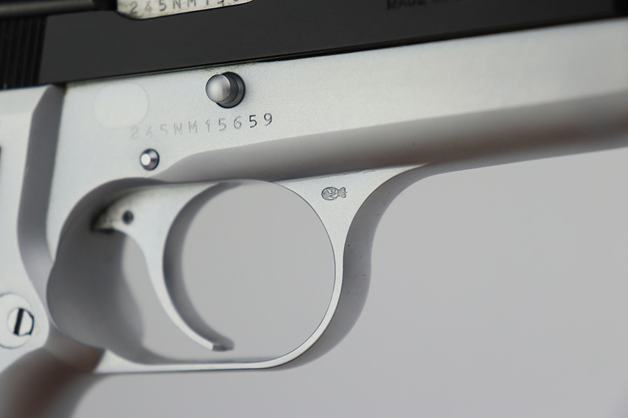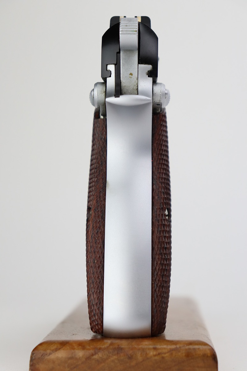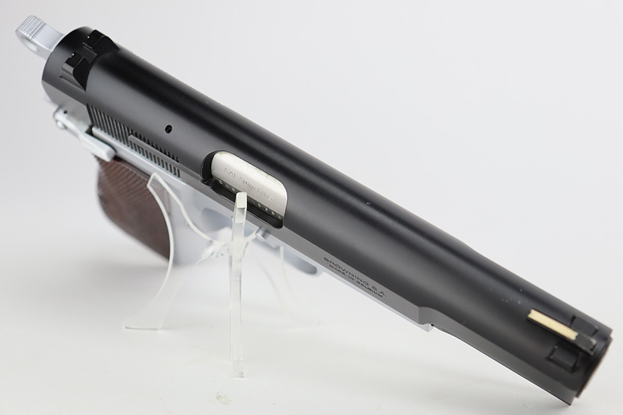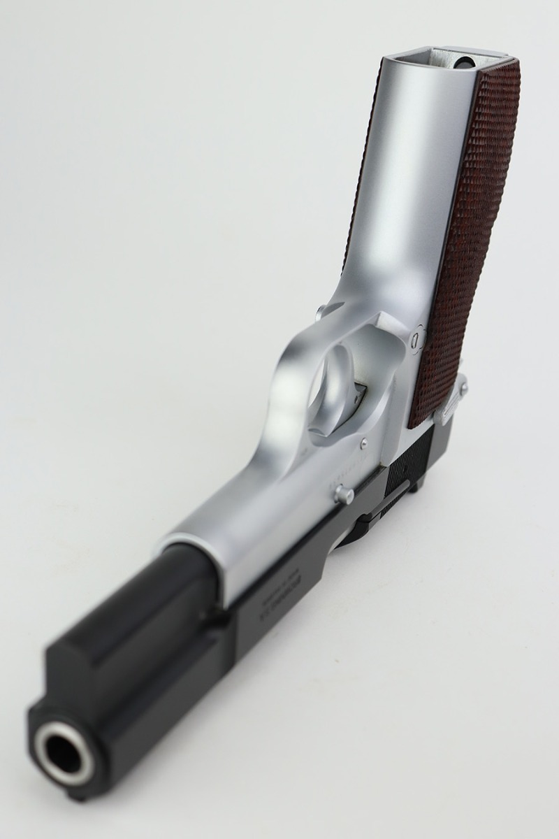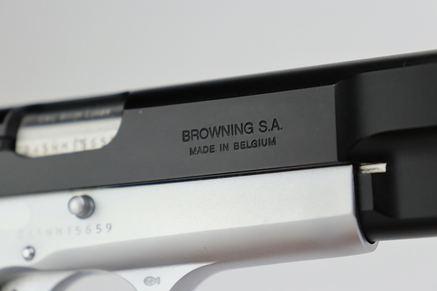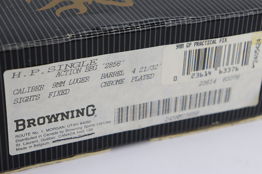7/14/23 – This is a like-new example of a Browning Hi Power, manufactured in 1990 and chambered in 9mm Luger. It has a blued slide and a flat stainless frame. Fitted with beautiful wood grips. The gun is mint with no apparent signs of wear or use. Mint bore. The gun comes with its original matching-numbered box, owners manual, cleaning rod, and one magazine.