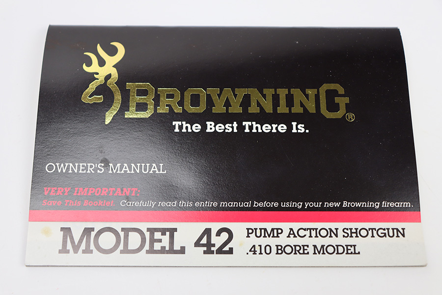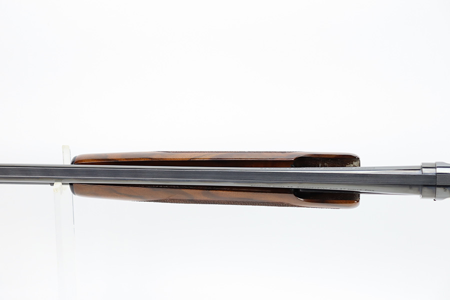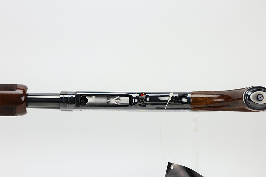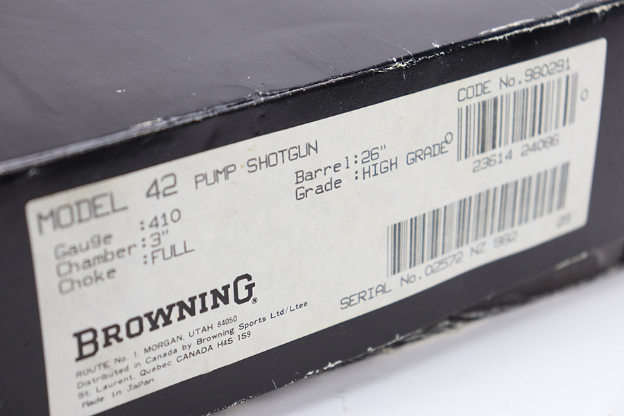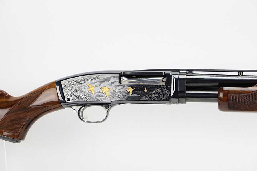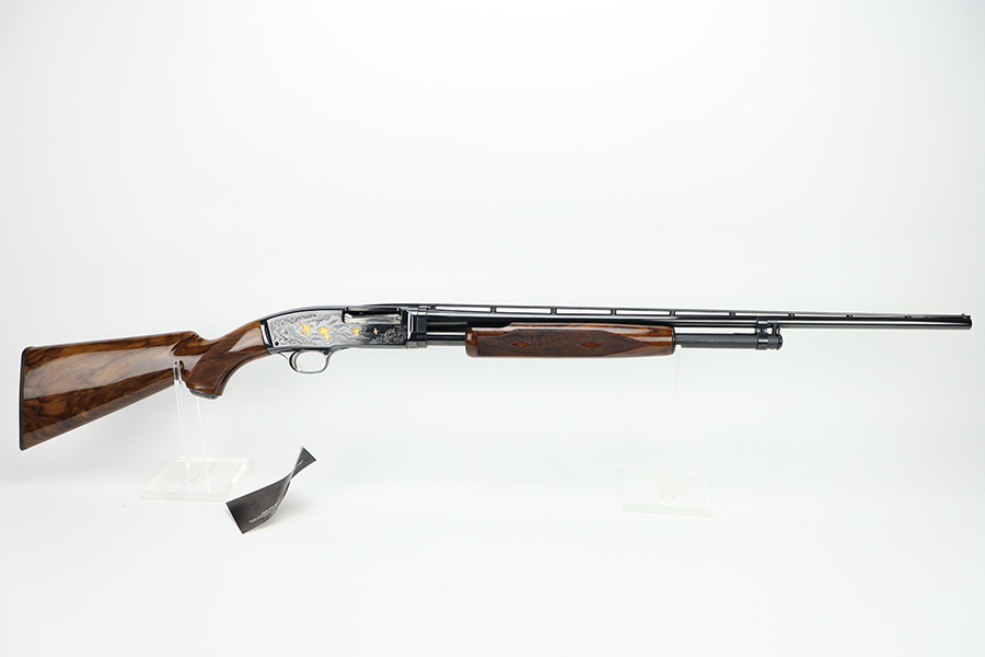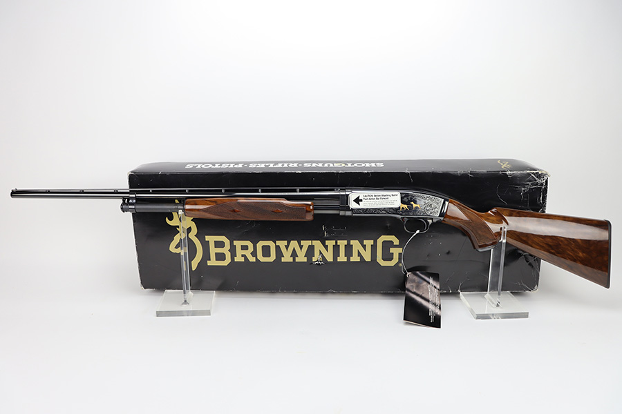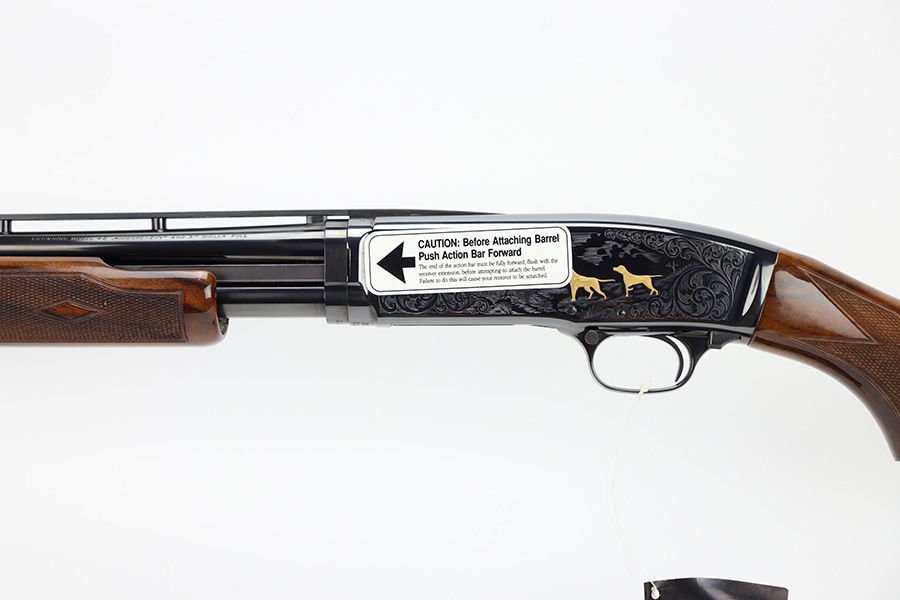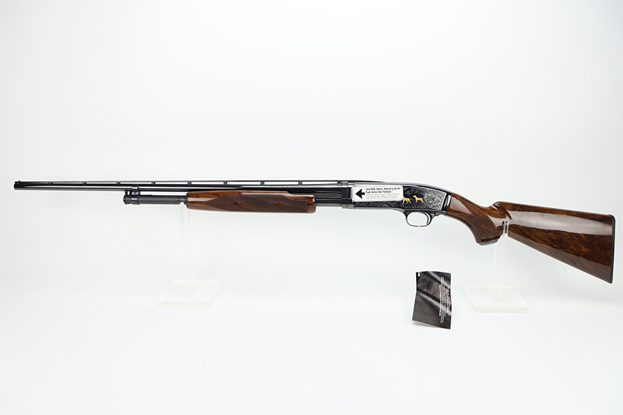 12/19/23 – This is a like-new example of a Browning Model 42 Pump action shotgun, Grade V limited edition. Chambered in .410. It comes with its original matching-numbered box and owners manual. Both sides of the receiver feature beautiful engravings of dogs, quail, and ducks. The silhouettes of the animals are highlighted in gold. The gun is stone-mint with no signs of wear or use – the original hang tag is still attached to the trigger guard! Beautiful wood furniture. Mint bore.