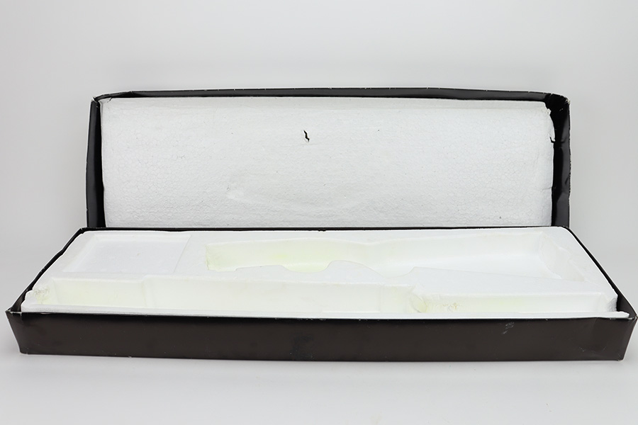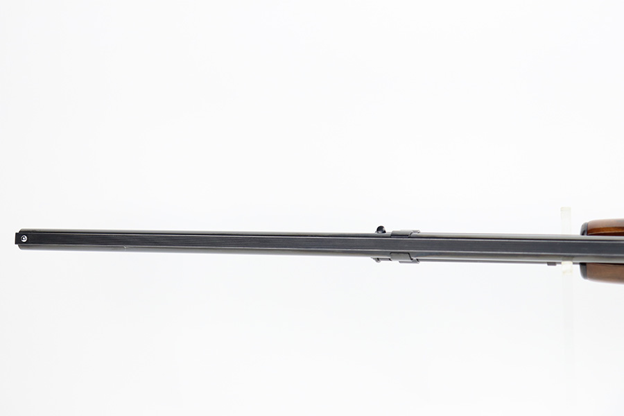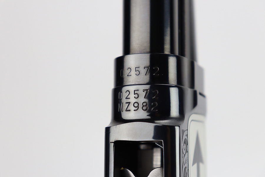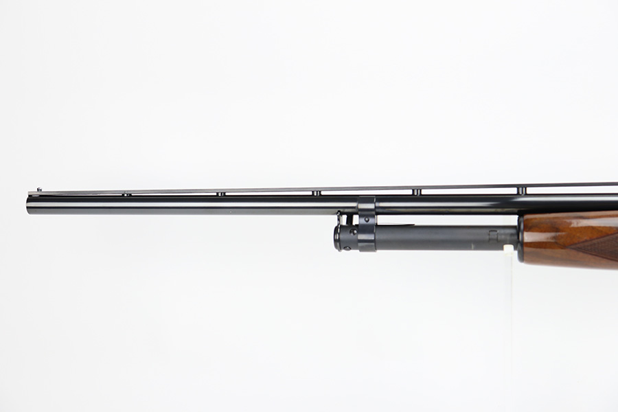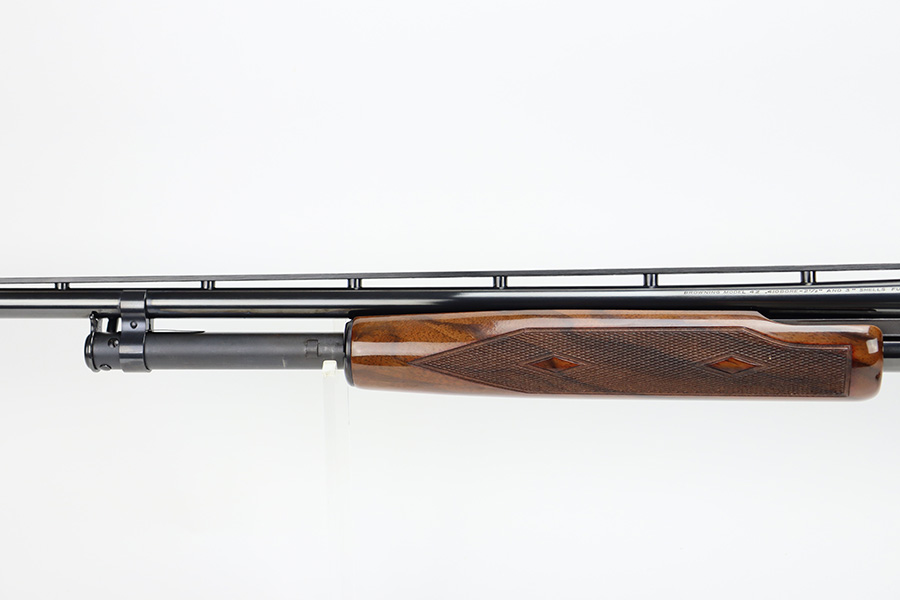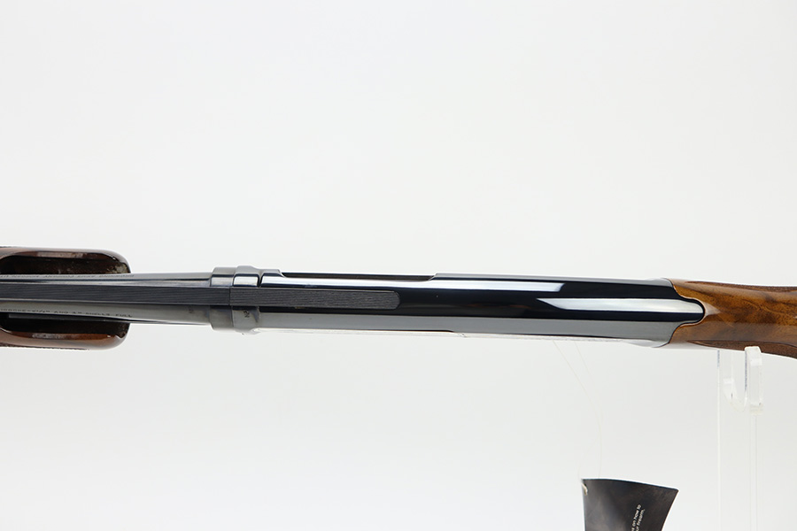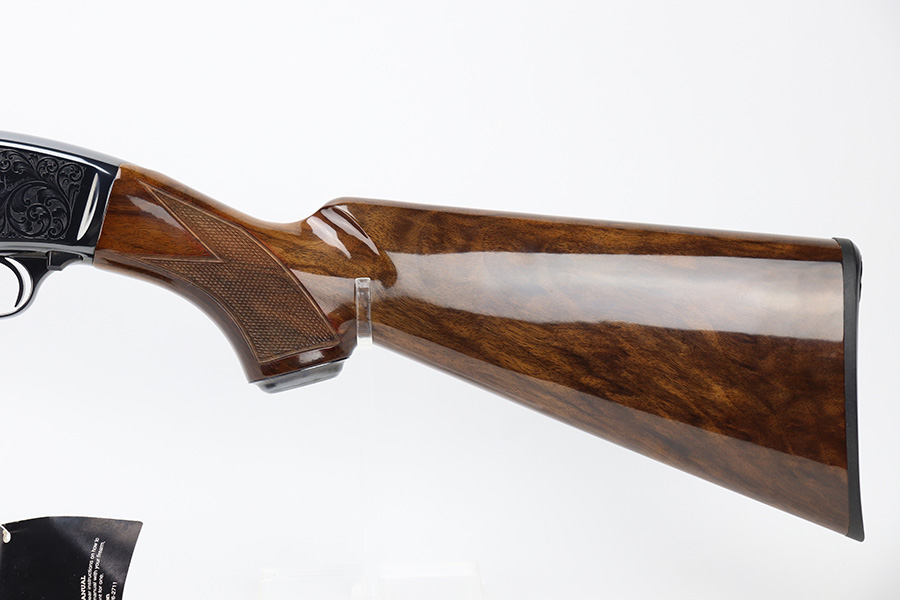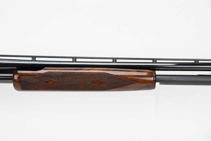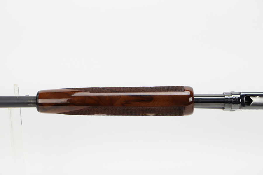 12/19/23 – This is a like-new example of a Browning Model 42 Pump action shotgun, Grade V limited edition. Chambered in .410. It comes with its original matching-numbered box and owners manual. Both sides of the receiver feature beautiful engravings of dogs, quail, and ducks. The silhouettes of the animals are highlighted in gold. The gun is stone-mint with no signs of wear or use – the original hang tag is still attached to the trigger guard! Beautiful wood furniture. Mint bore.