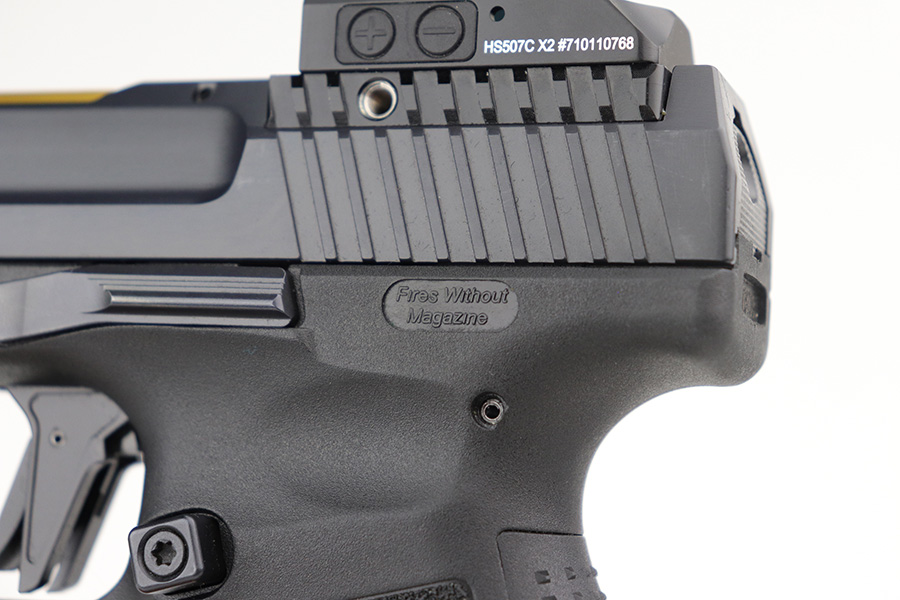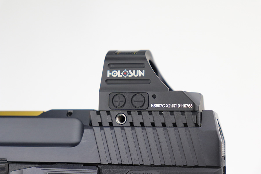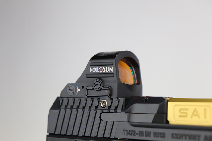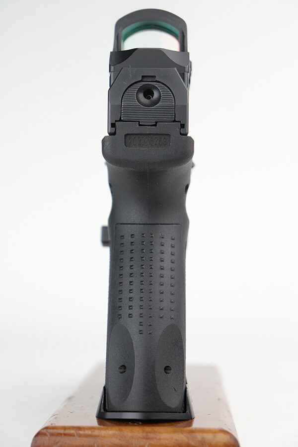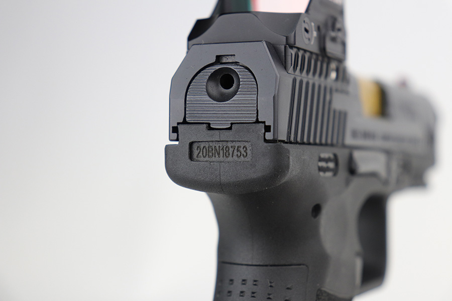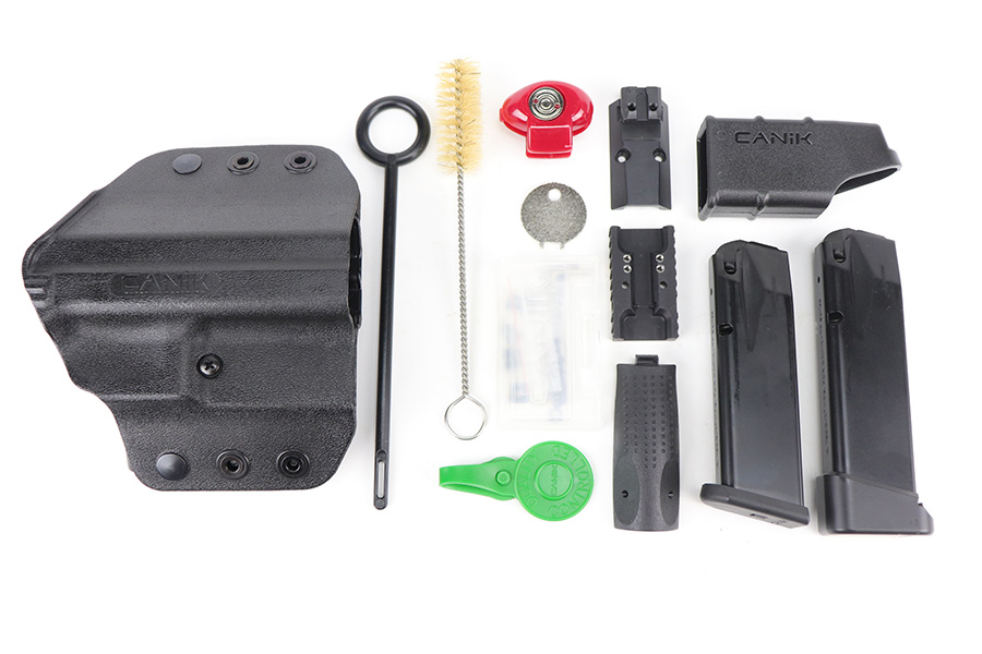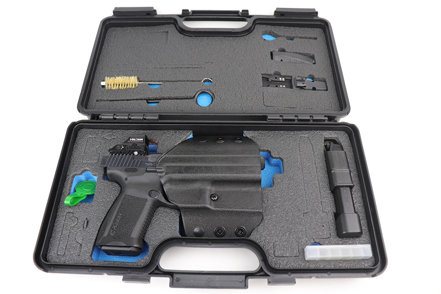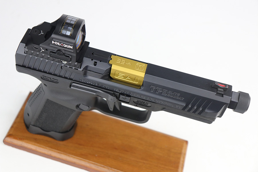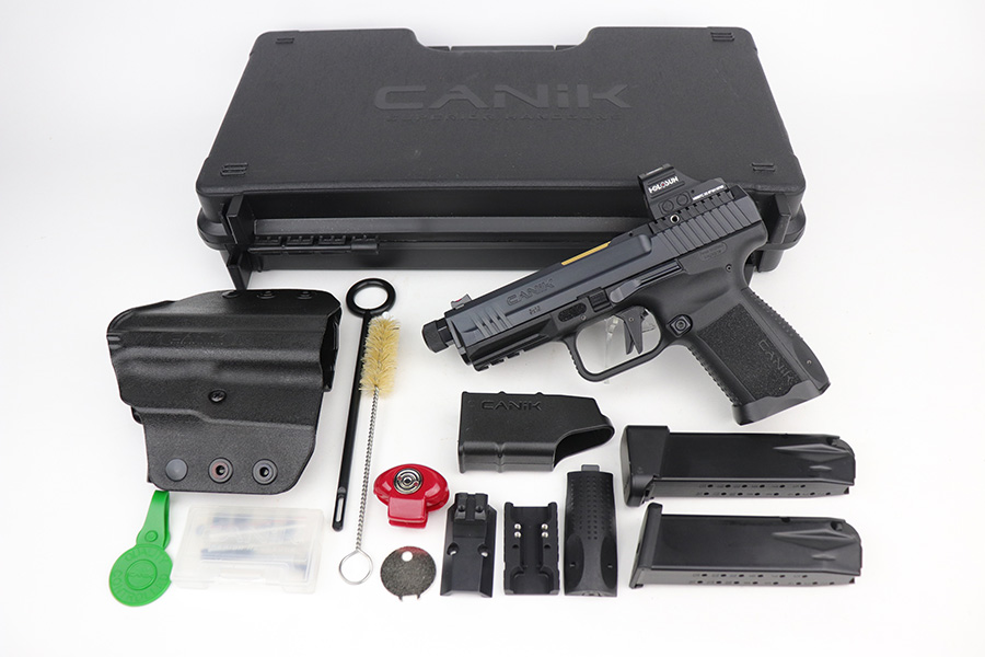 9/27/21 – This is a like-new example of a CANIK TP9 Elite Combat semi-auto pistol, chambered in 9mm Luger. It comes with the original matching-numbered hard case, conceal carry holster, cleaning rods, two 15-rd mags, a speed loader, a small tool kit, a spare rear sight rail, and a spare rear grip module. It comes equipped with a Holosun red dot scope and a gold barrel that is threaded at the end to receive a suppressor. The gun is in like-new condition with no obvious signs of wear. The bore is mint.
