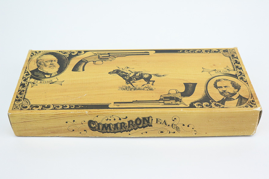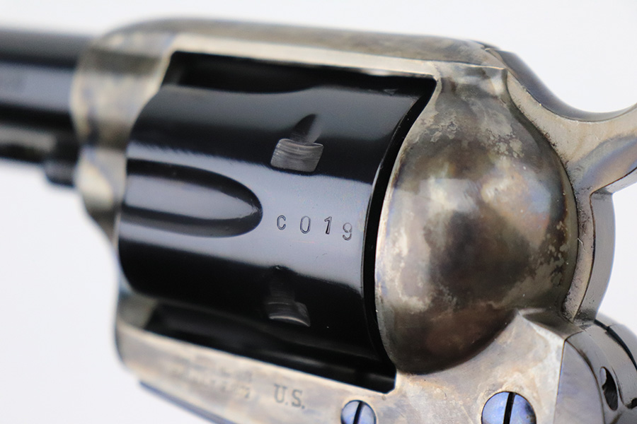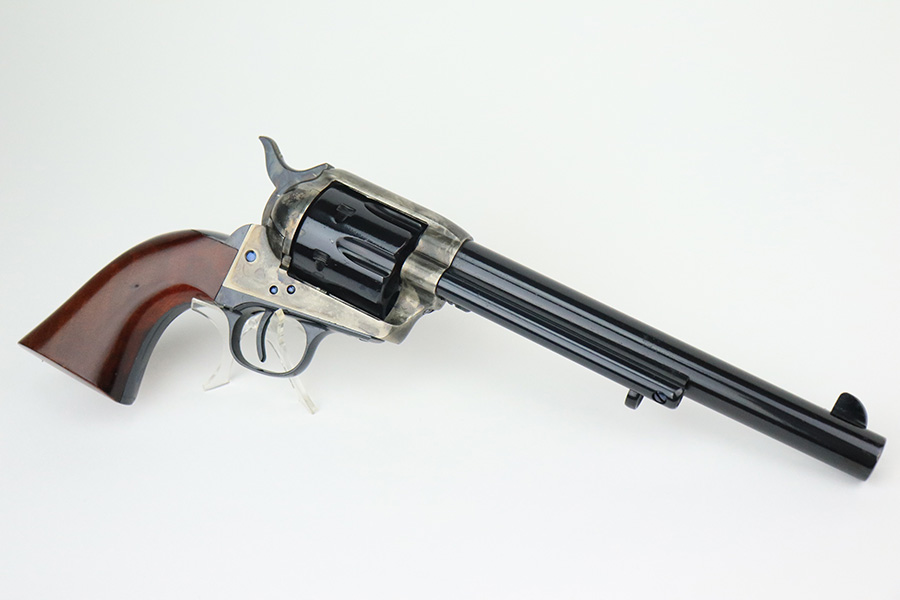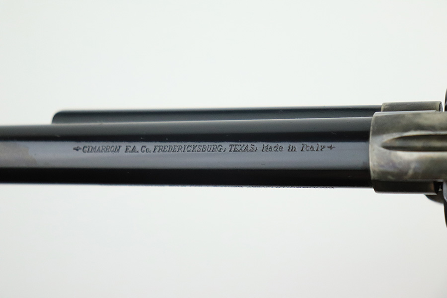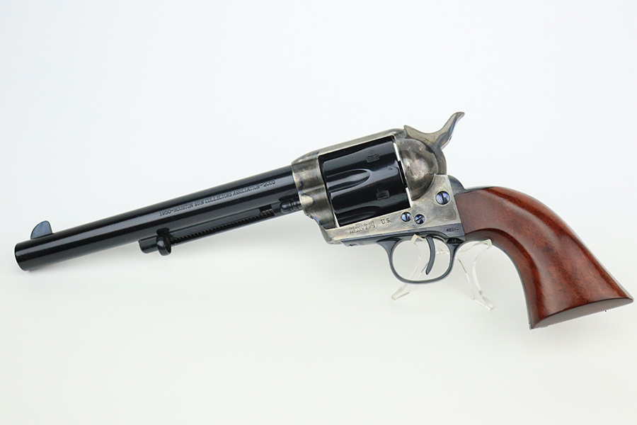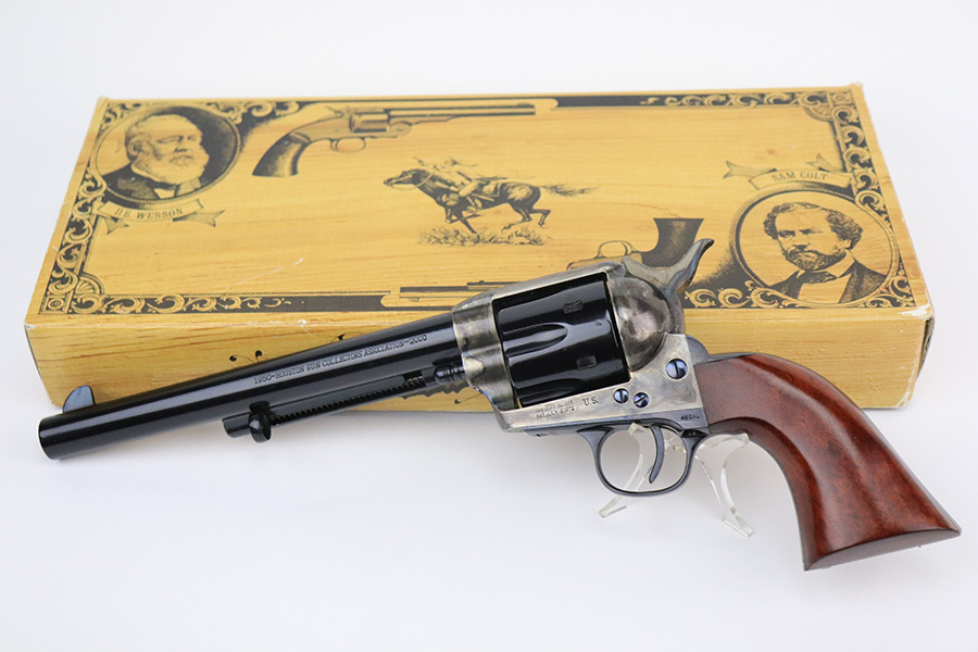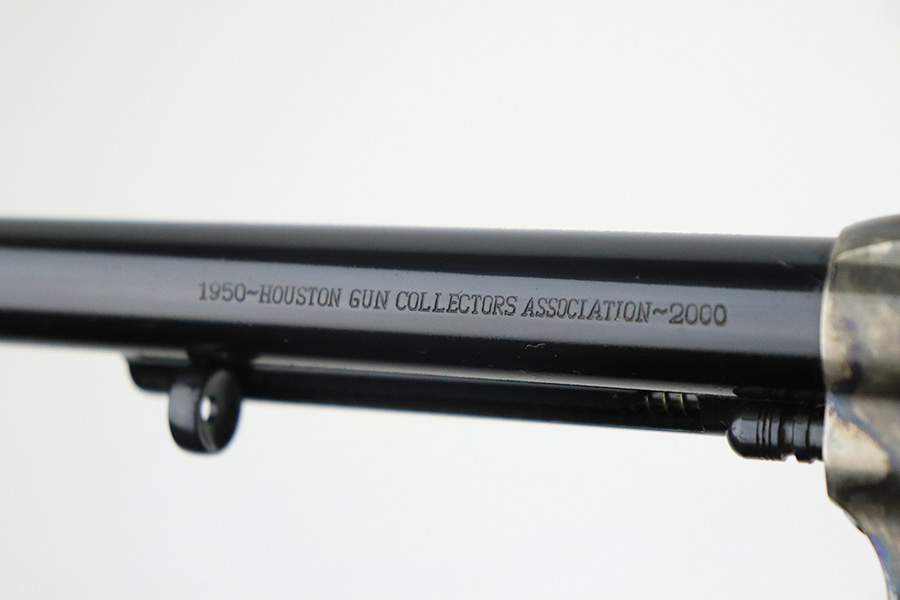 7/8/22 – This is a like-new example of a Cimarron/Uberti-made Colt Single Action Army revolver. Chambered in .45 Caliber and has a 7.5″ barrel. It comes with its original matching-numbered box and owners manual. This particular gun has a “1950 ~ Houston Gun Collectors Association ~ 2000” marking on the left side of the barrel. The bluing is very nice with beautiful case-hardening on the frame. Excellent wood grips. The gun is in mint condition with the only sign of wear being a few extremely light scratches here and there along the barrel. Mint bore.
