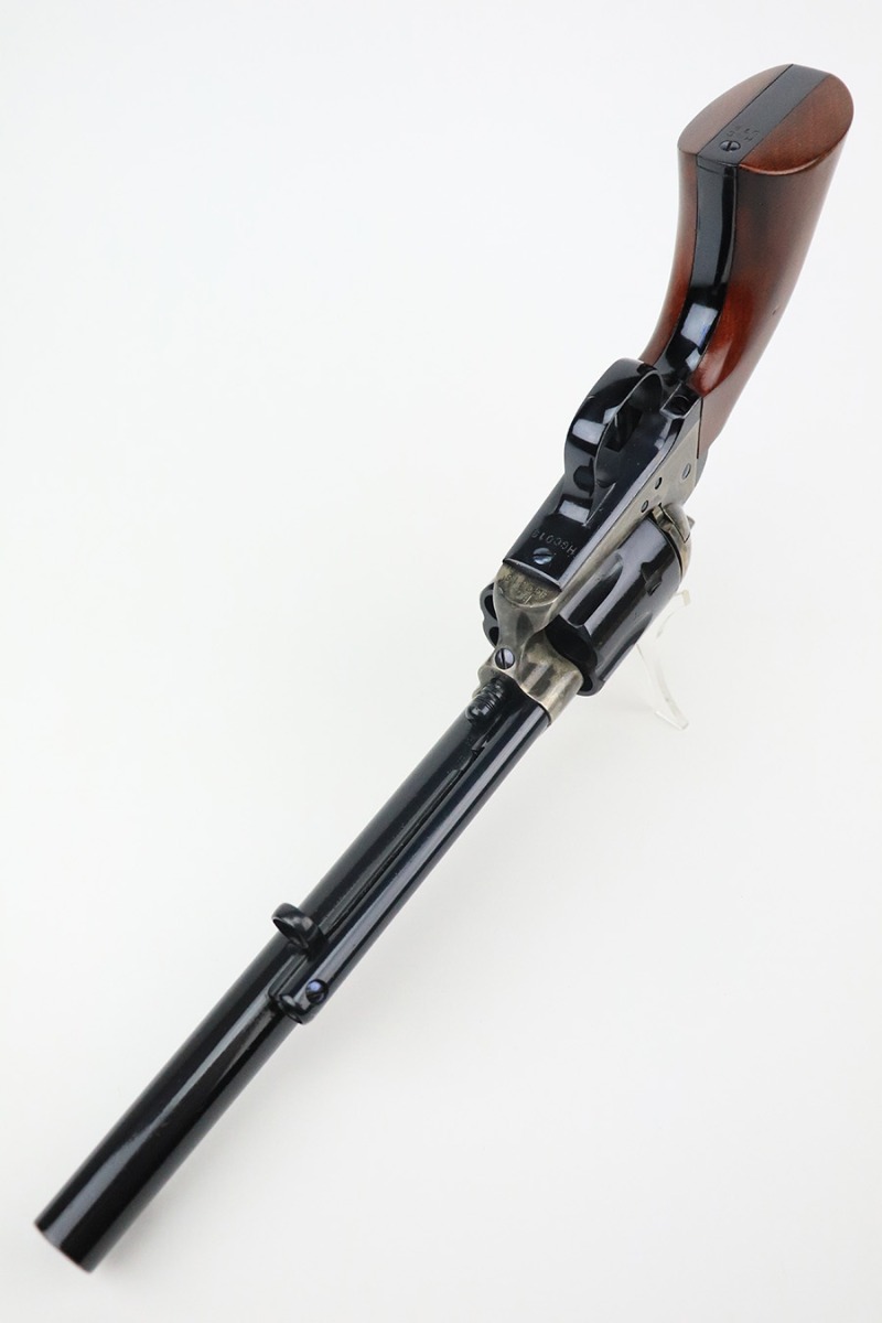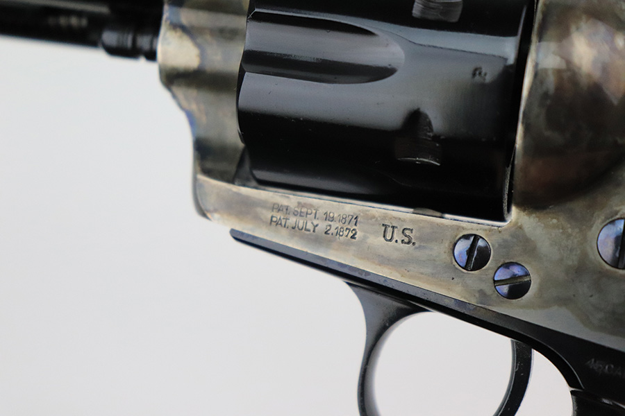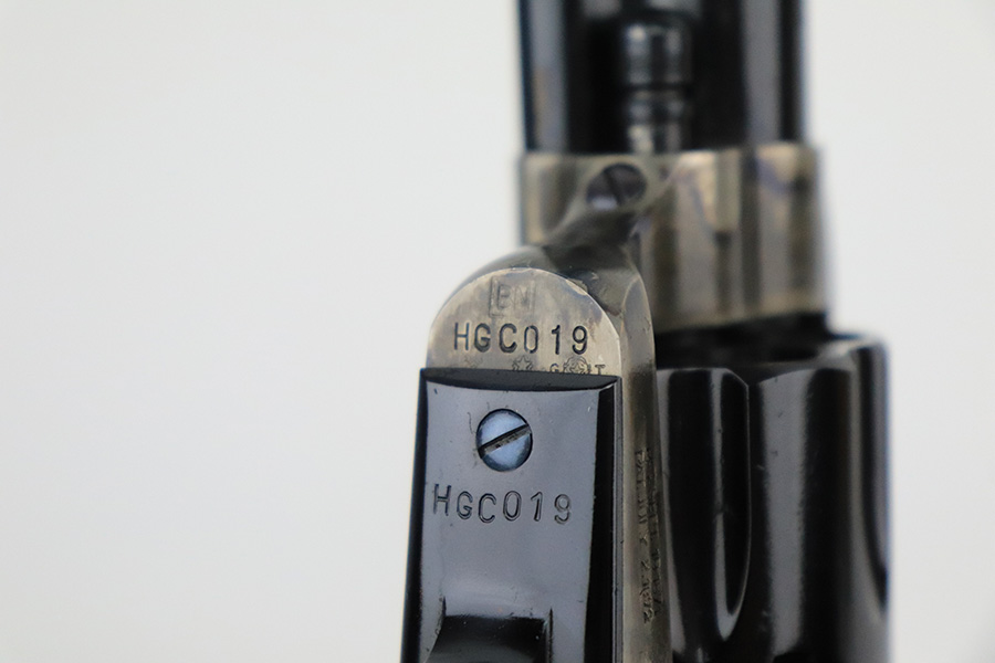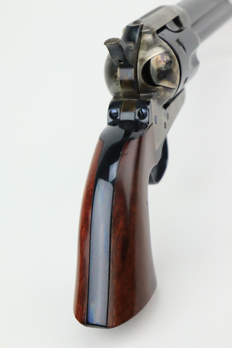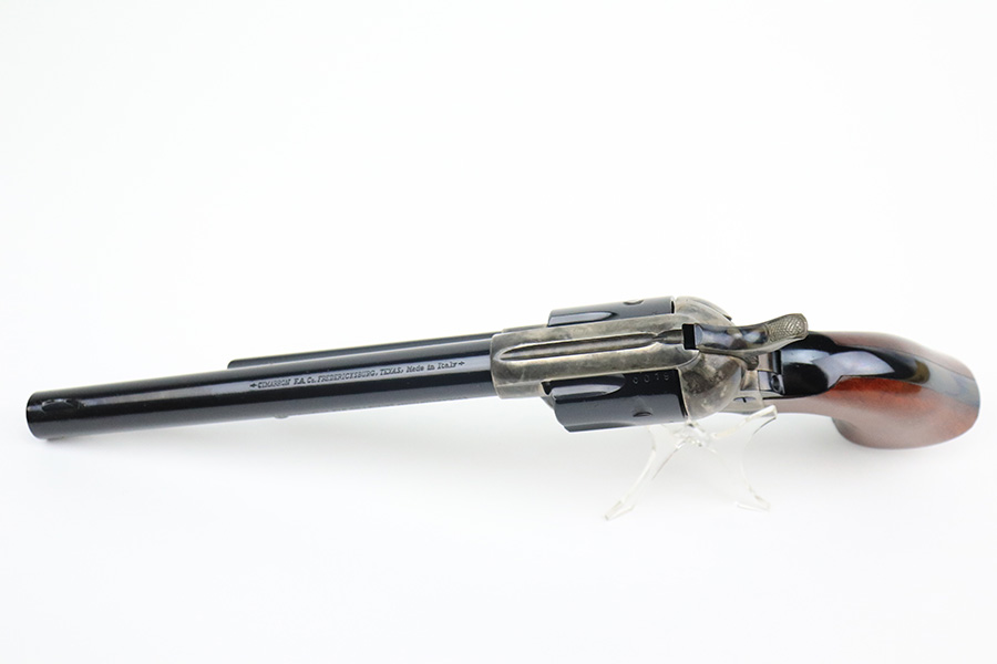 7/8/22 – This is a like-new example of a Cimarron/Uberti-made Colt Single Action Army revolver. Chambered in .45 Caliber and has a 7.5″ barrel. It comes with its original matching-numbered box and owners manual. This particular gun has a “1950 ~ Houston Gun Collectors Association ~ 2000” marking on the left side of the barrel. The bluing is very nice with beautiful case-hardening on the frame. Excellent wood grips. The gun is in mint condition with the only sign of wear being a few extremely light scratches here and there along the barrel. Mint bore.
