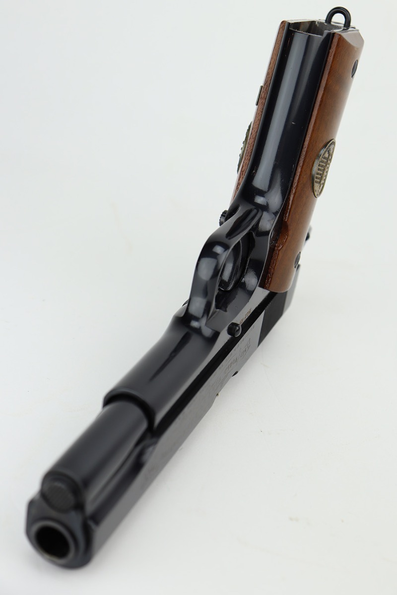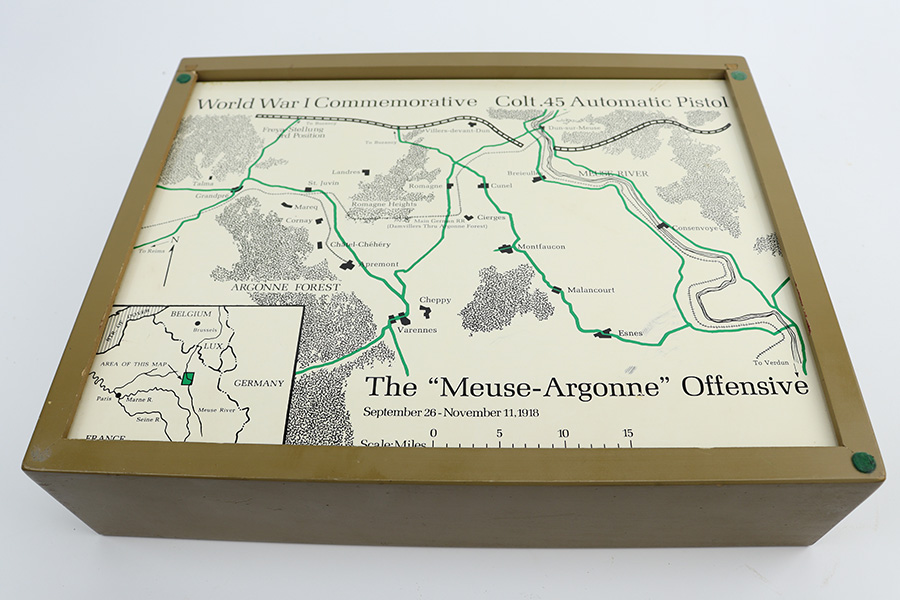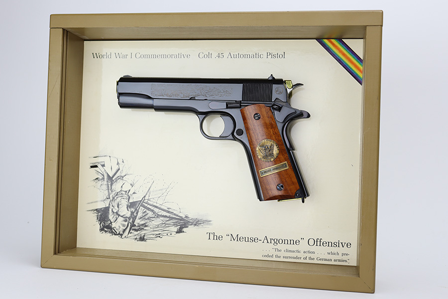 6/21/23 – This is a minty example of a Colt 1911 made in 1967 to commemorate the Meuse-Argonne Offensive in WW1. No finish loss at all, just a few very minor dings on the front strap. Both sides of the slide were roll stamped to commemorate the WWI Battles at Meuse and the Argonne forest. The left side of the slide has a gold flashed, roll engraved battle scene. There is a gold flashed Rampant Colt at the rear of slide. The right side of the slide has a large gold flashed, roll engraved banner which reads, “1917 WORLD WAR I COMMEMORATIVE 1967” over the Colt patent and address markings. It is fitted with a set of high polish smooth walnut grips, each fitted with a large bronze medallion. The left grip has the spread wing American Eagle, with “1917-1918” at the top and “WORLD WAR” below, with a smaller rectangular medallion underneath which reads ” MEUSE ARGONNE”. The right grip also has a bronze medallion with a soldier at “Port-Arms” position depicted in the middle, with the names of thirteen of the countries involved in WWI. Complete with commemorative wooden display case with plexiglass face. C&R eligible.