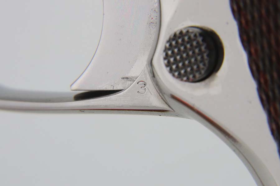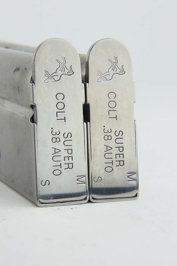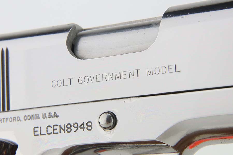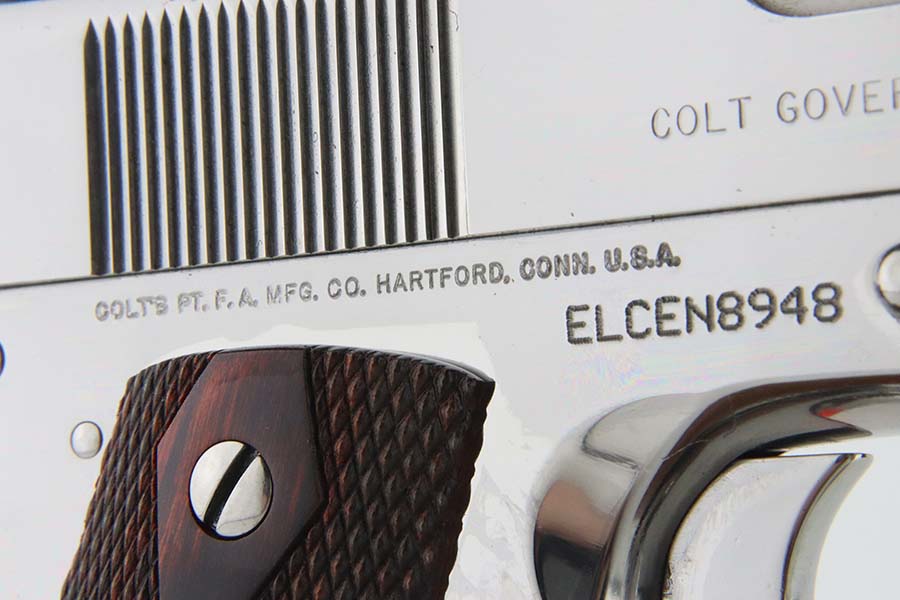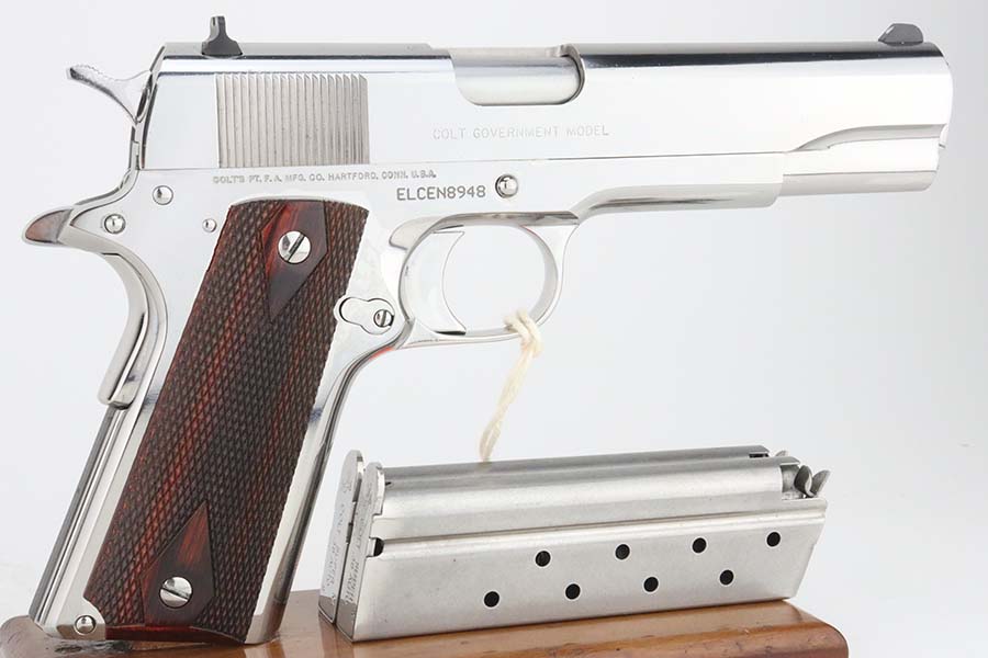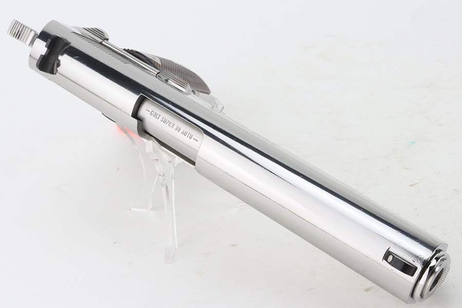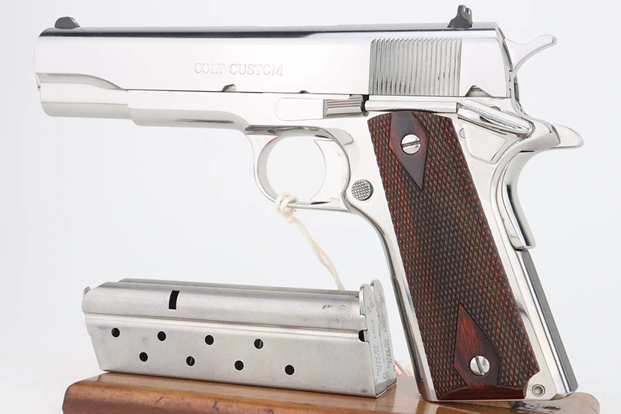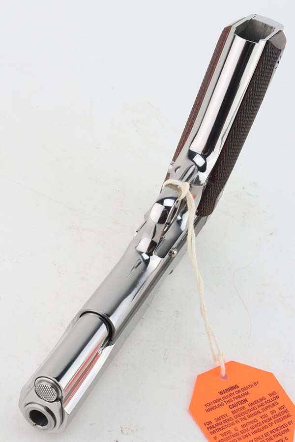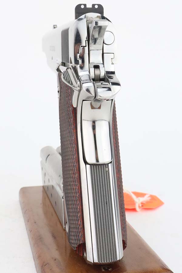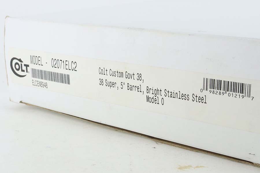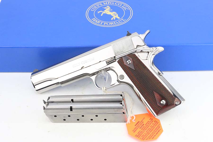 3/25/24 – This is a like-new example of a Colt Custom Government Model 1911 chambered in .38 Super. It has a bright polish stainless finish and is in mint condition with no signs of wear or use. Fitted with mint wood grips. Like-new bore. It comes with its original matching-numbered hard case, owners manual, gun lock, and two magazines.