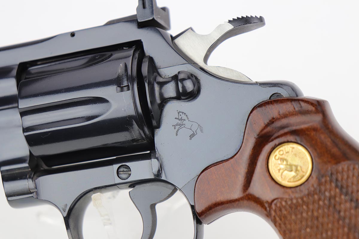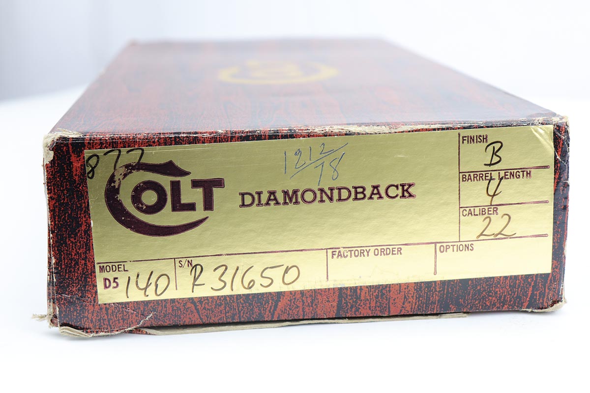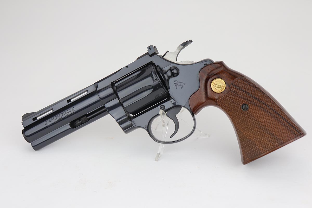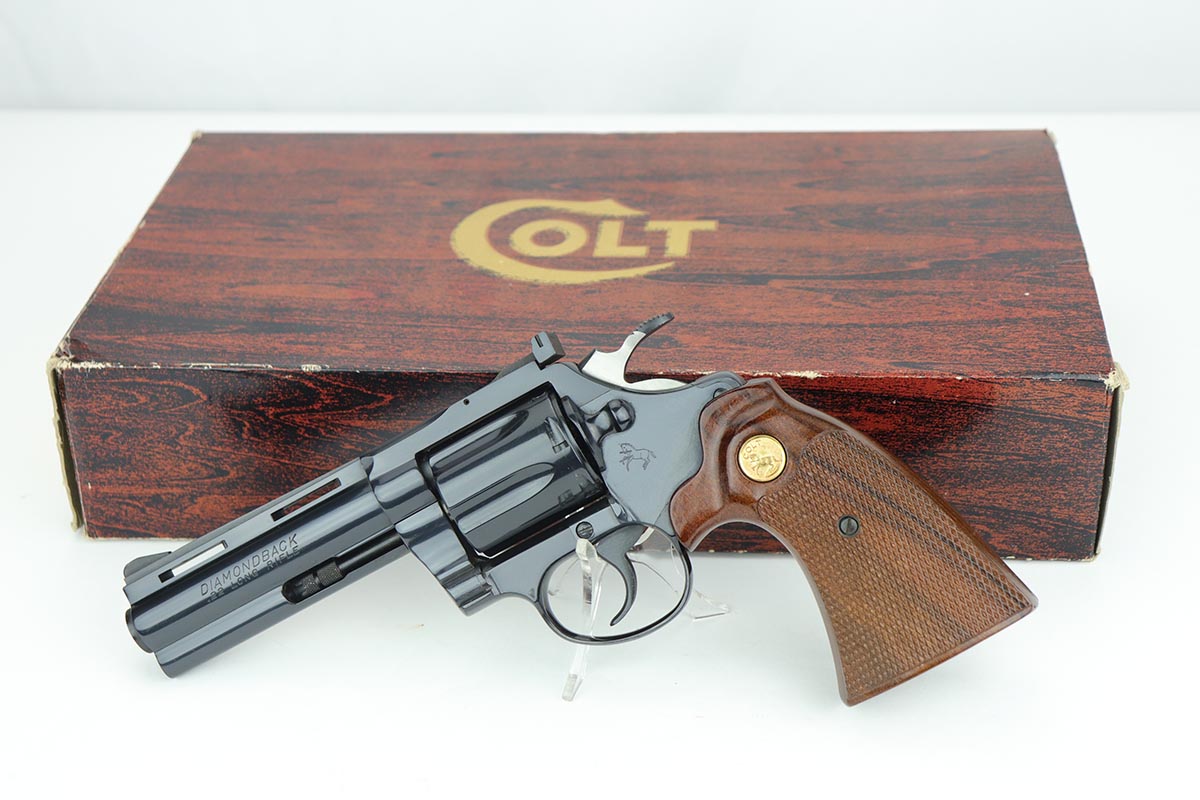 9/24/19 – Inspired by the success of the Colt Python, the Diamondback was manufactured and released beginning in 1966, and resembles a scaled-down version of the Python. This particular revolver was made in 1978, and is chambered in the less common .22LR with four inch barrel. The gun is in mint, original condition with only a faint roll mark on the cylinder. The gun is accompanied by the original, matching box, complete with Styrofoam sleeve and original manual.