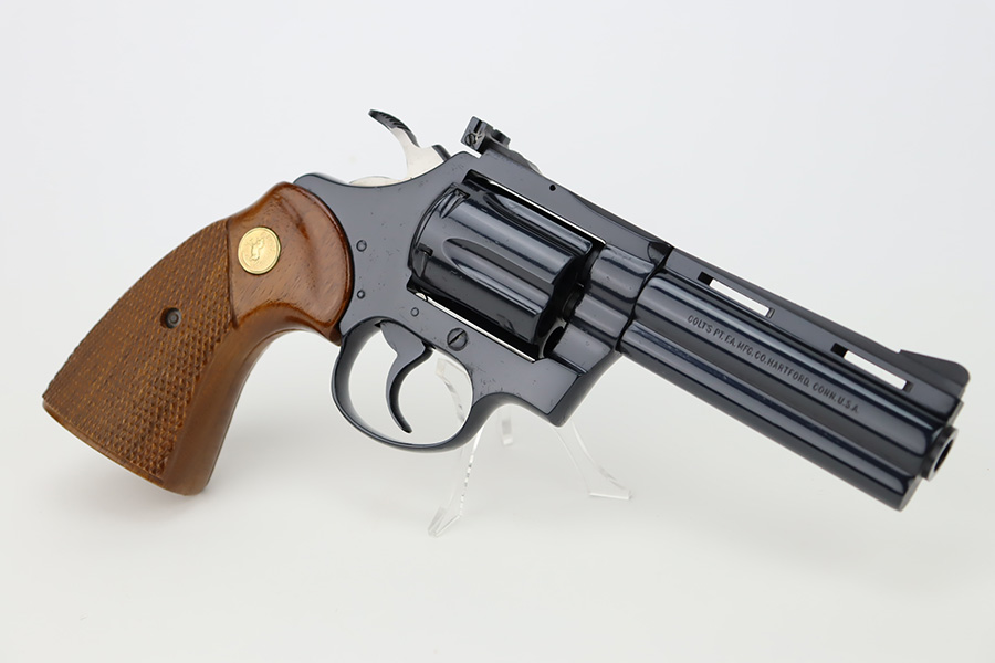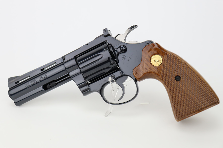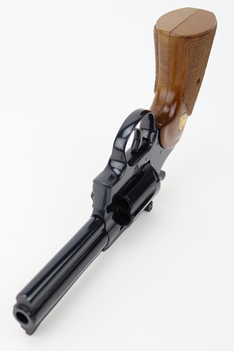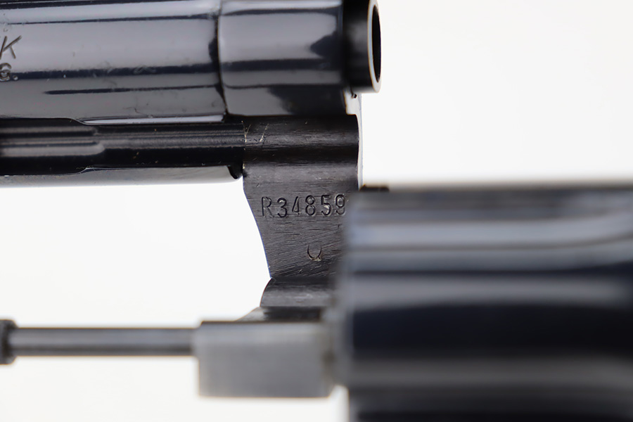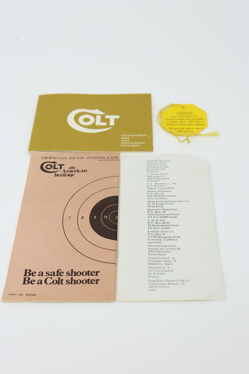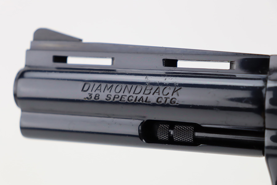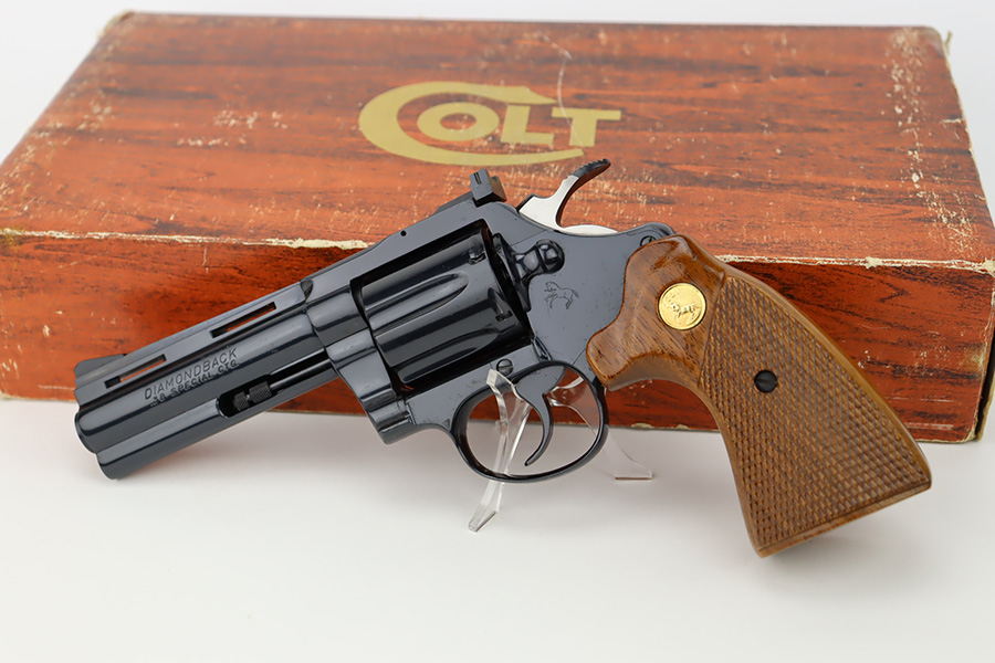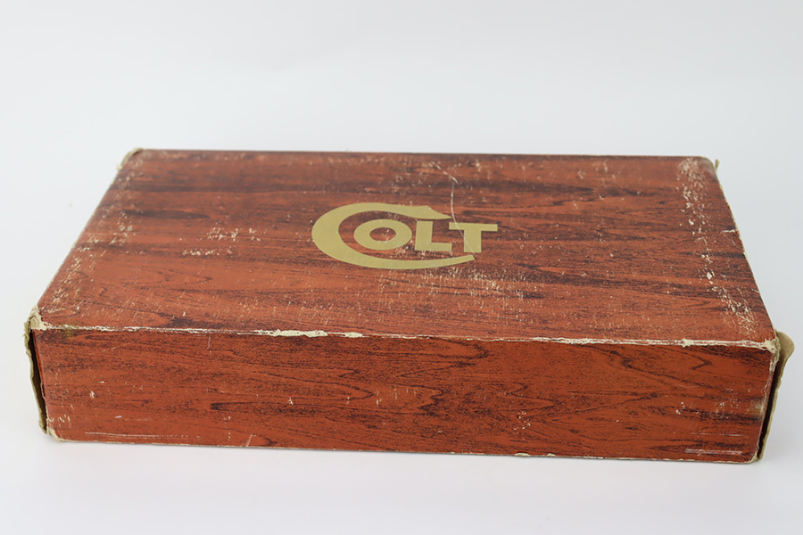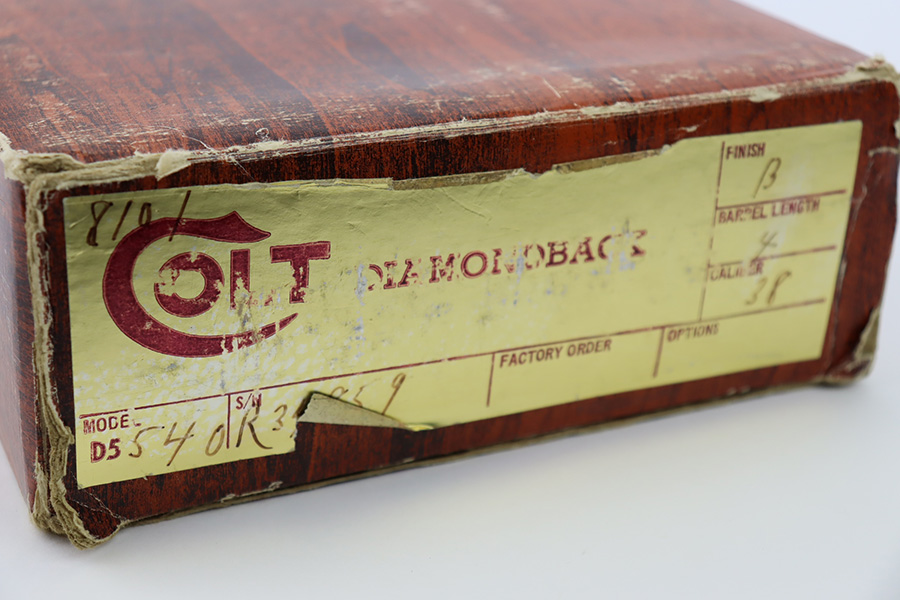 11/10/23 – This is a mint Colt Diamondback revolver in its original, matching box. Made in 1978, the revolver appears to be in nearly unused condition as there’s only the faintest hint of a turn line on the cylinder. Four inch barrel, chambered for .38 Spl. Minty finish, grips and bore. Box label is intact and clearly serialized to match this revolver. The box includes the manual and original Styrofoam insert.