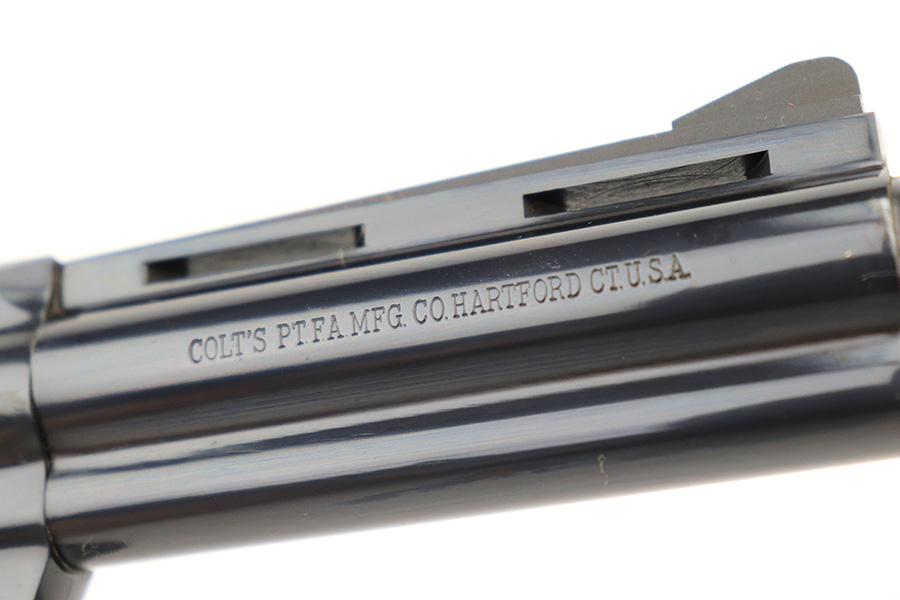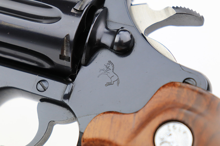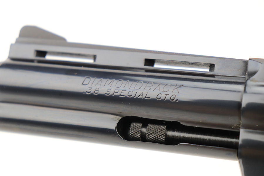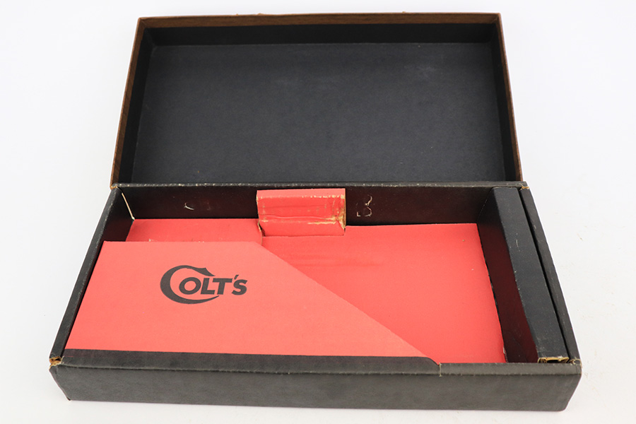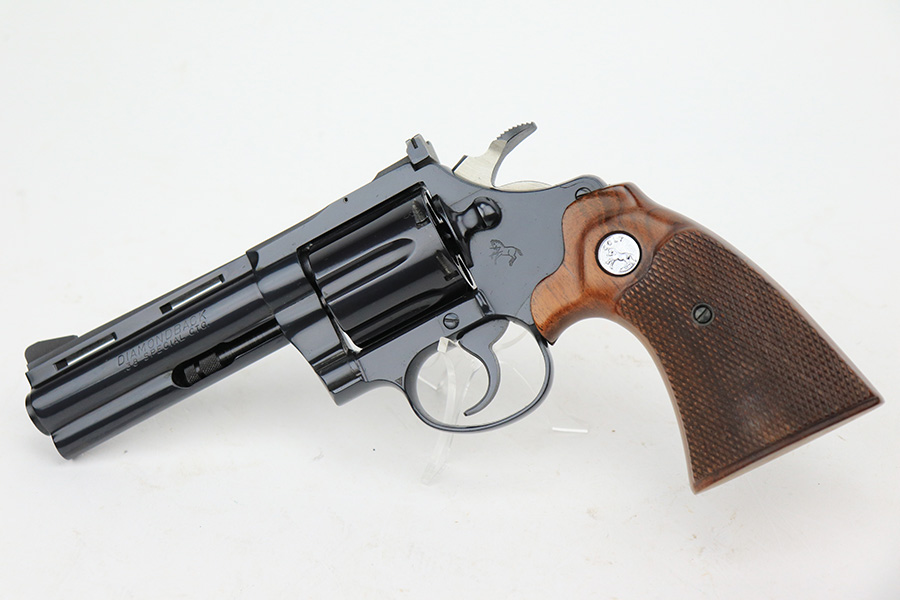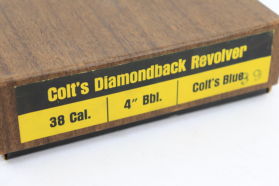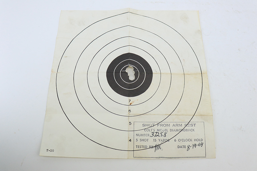 5/18/23 – This is a mint example of a Colt Diamondback revolver, manufactured in 1969 and chambered in .38 Special. 4″ barrel. It comes with its original matching-numbered box, matching-numbered test target, and owners manual. The gun has retained essentially all of its original high polish finish with just an extremely light roll mark on the cylinder. Fitted with beautiful checkered wood grips. The bore is like-new.