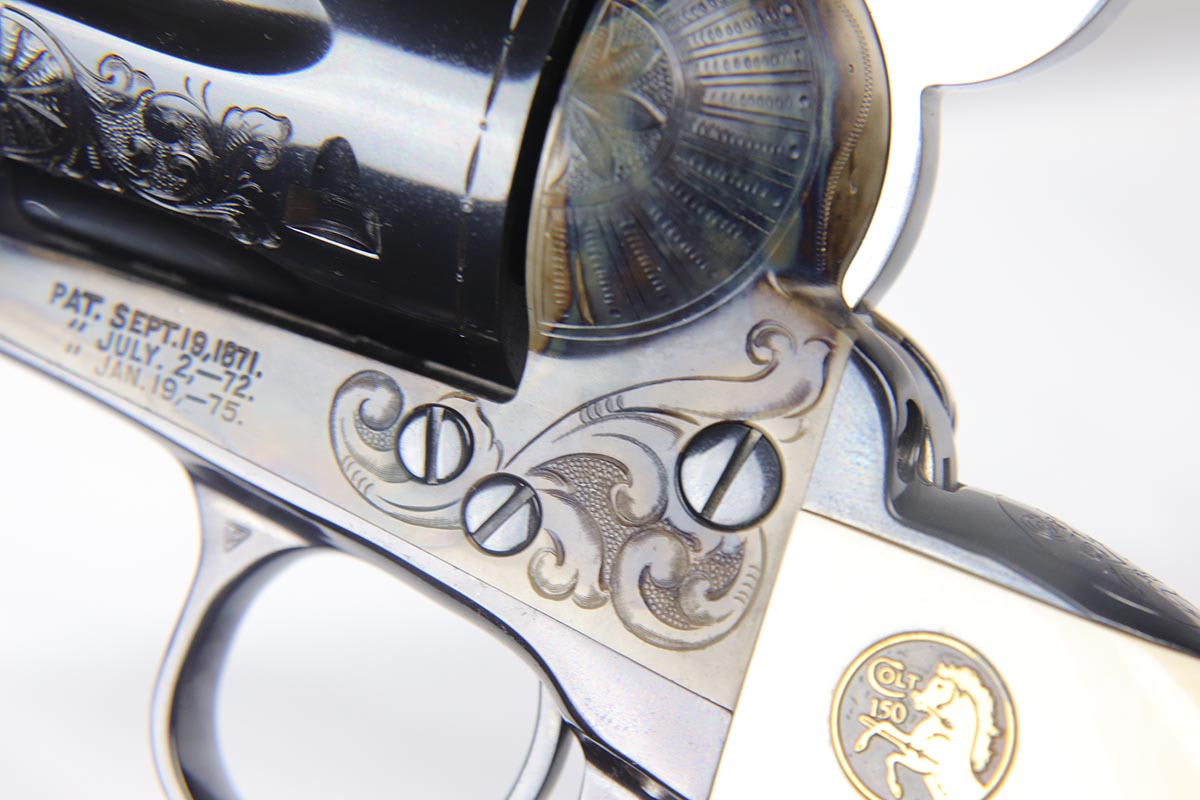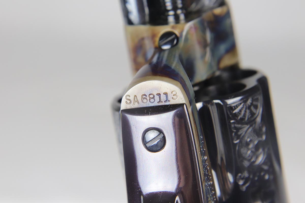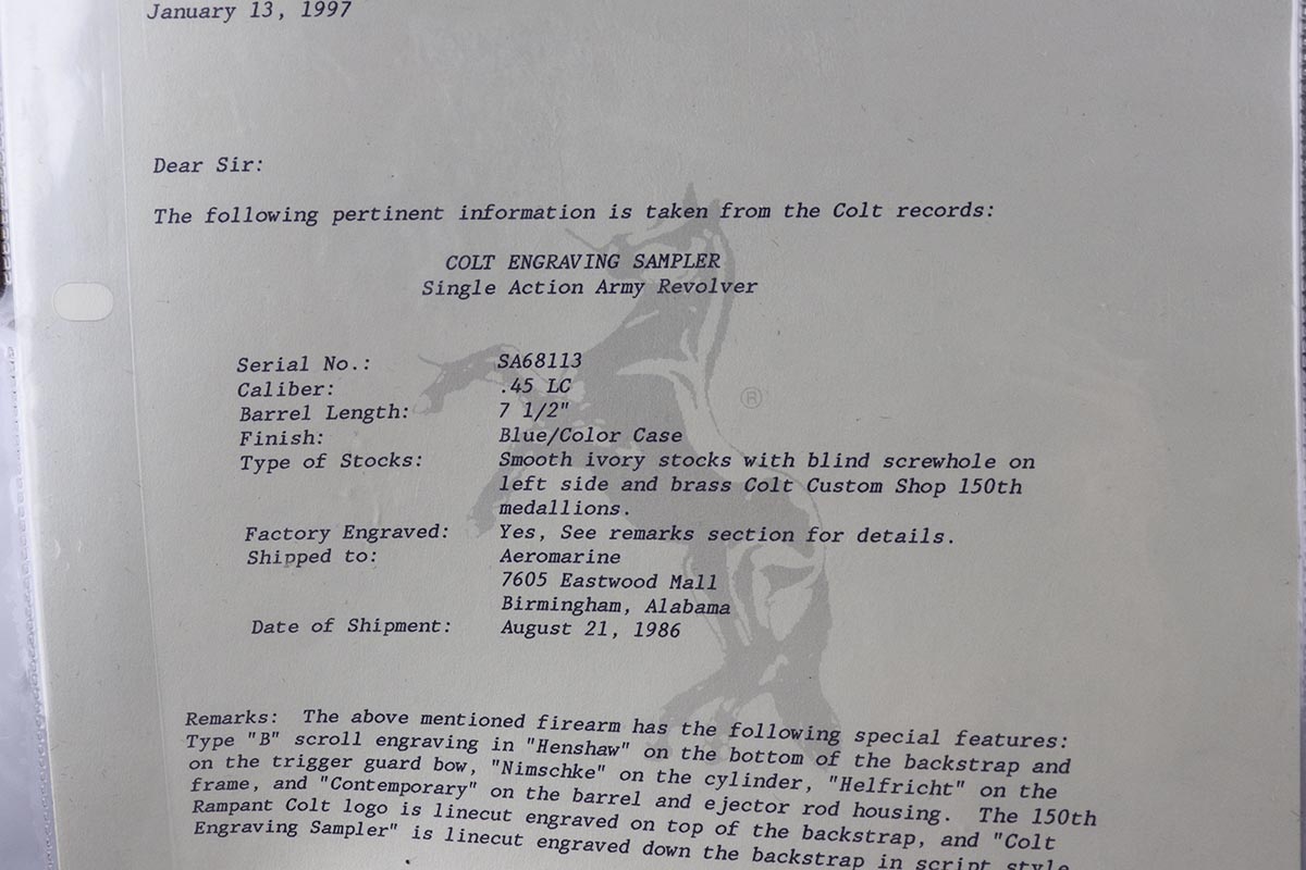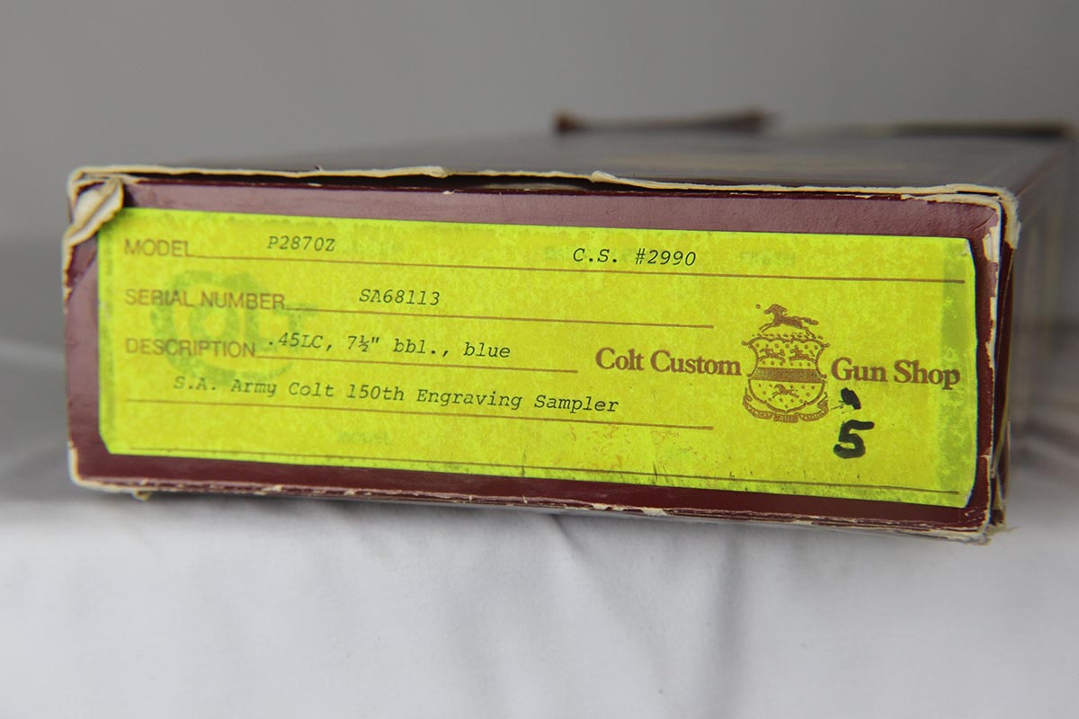 4/10/18 – This is a gorgeous Colt Single Action Army, 3rd Generation, featuring the four major styles of Colt engraving. Referred to as a Colt Engraving Sampler, this minty revolver has grips marked with the names of three factory engravers and the dates they were employed by Colt. The frame is marked Colt Engraved Sampler and has a rampant Colt motif with the number 150 inside, referring to the 150th anniversary. This grouping comes with the original matching box and a Colt factory letter. The letter states that the firearm has the following features: Type ‘B’ scroll engraving in “Henshaw” on the bottom of the back strap and on the trigger guard bow, “Nimschke” on the cylinder, “Helfricht” on the frame, and “Contemporary” on the barrel and ejector rod housing. The subject revolver is one of only 14 in the Sampler Edition in this particular model configuration.