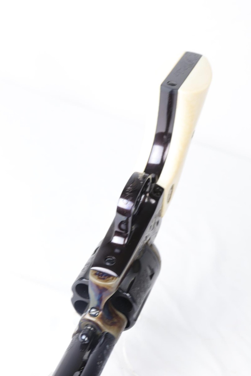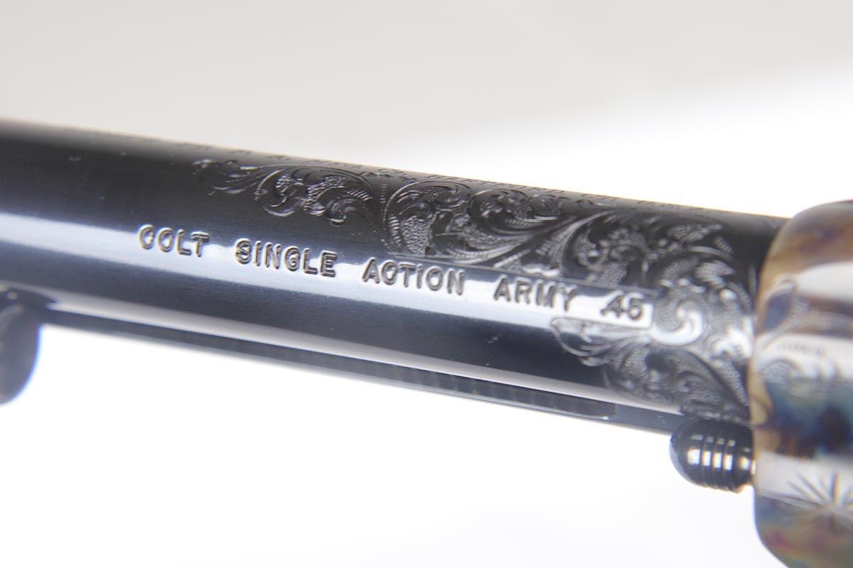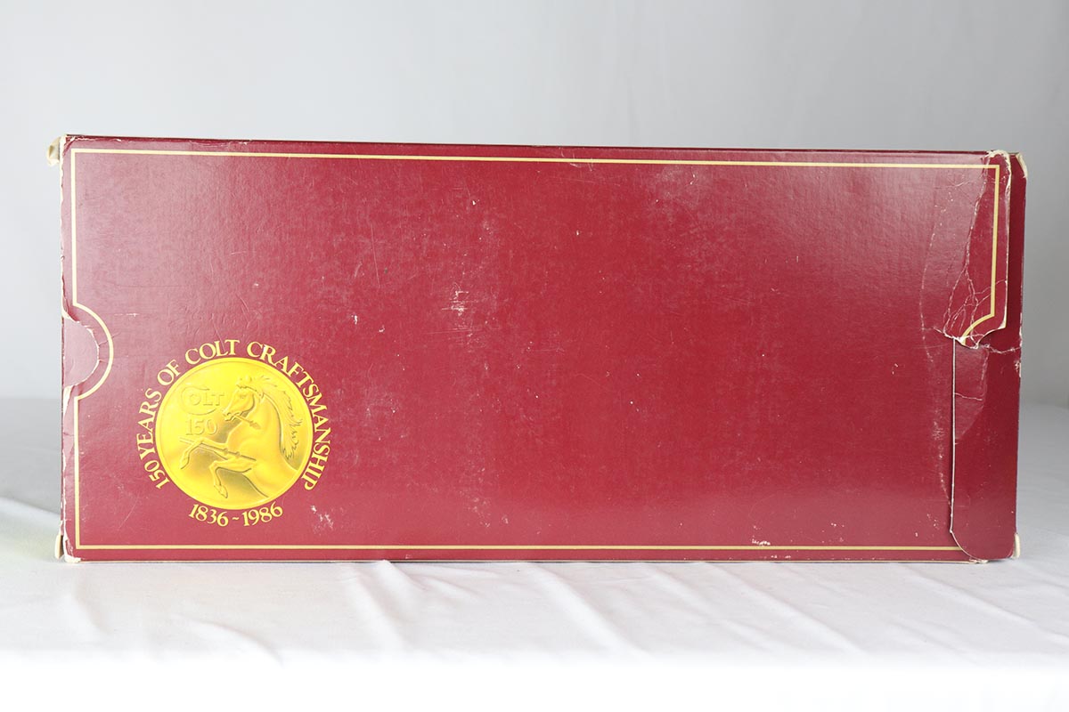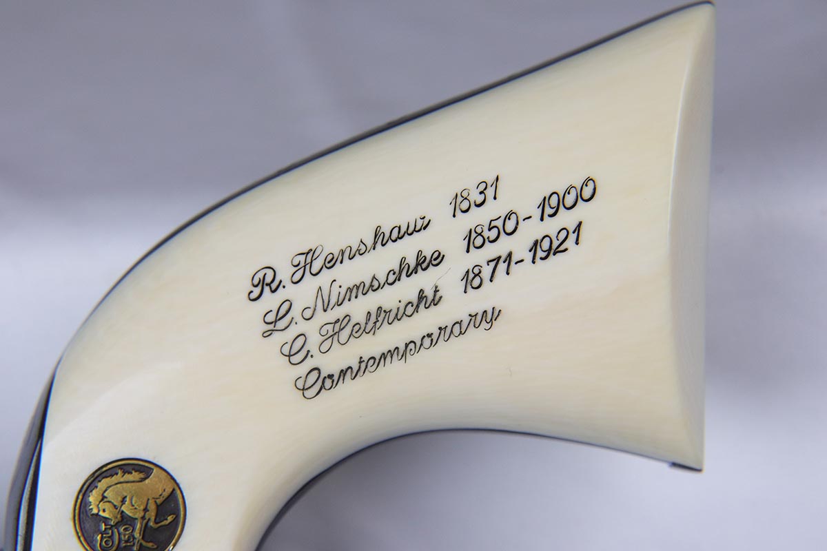 4/10/18 – This is a gorgeous Colt Single Action Army, 3rd Generation, featuring the four major styles of Colt engraving. Referred to as a Colt Engraving Sampler, this minty revolver has grips marked with the names of three factory engravers and the dates they were employed by Colt. The frame is marked Colt Engraved Sampler and has a rampant Colt motif with the number 150 inside, referring to the 150th anniversary. This grouping comes with the original matching box and a Colt factory letter. The letter states that the firearm has the following features: Type ‘B’ scroll engraving in “Henshaw” on the bottom of the back strap and on the trigger guard bow, “Nimschke” on the cylinder, “Helfricht” on the frame, and “Contemporary” on the barrel and ejector rod housing. The subject revolver is one of only 14 in the Sampler Edition in this particular model configuration.