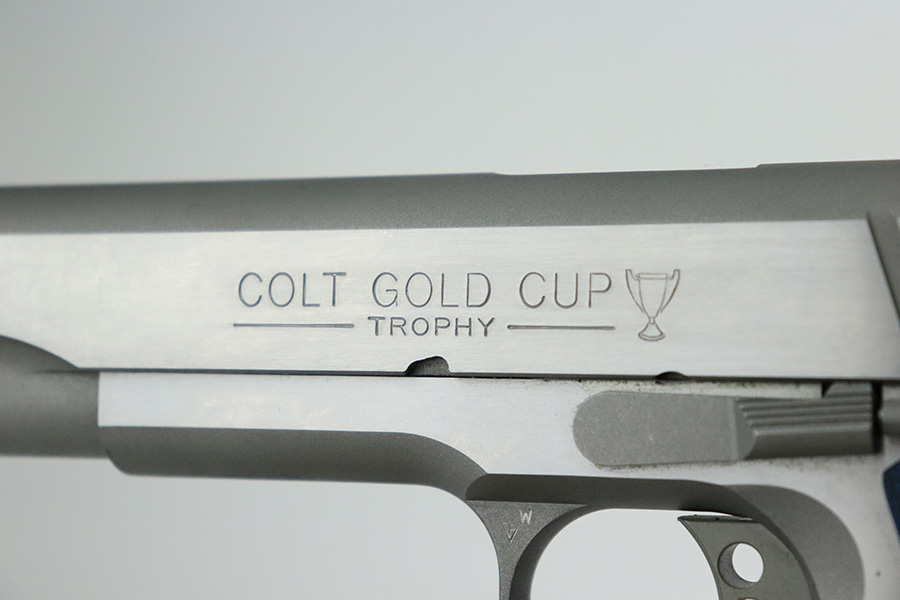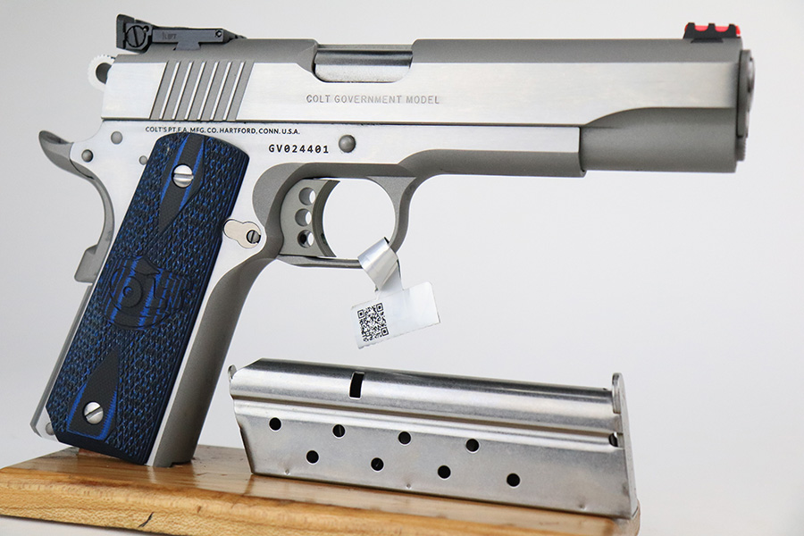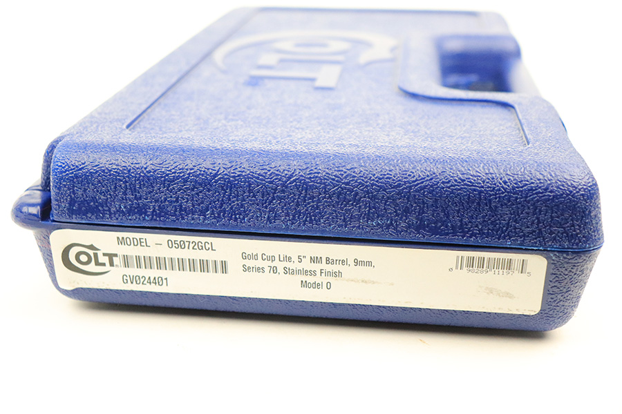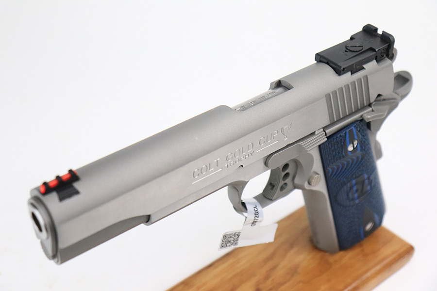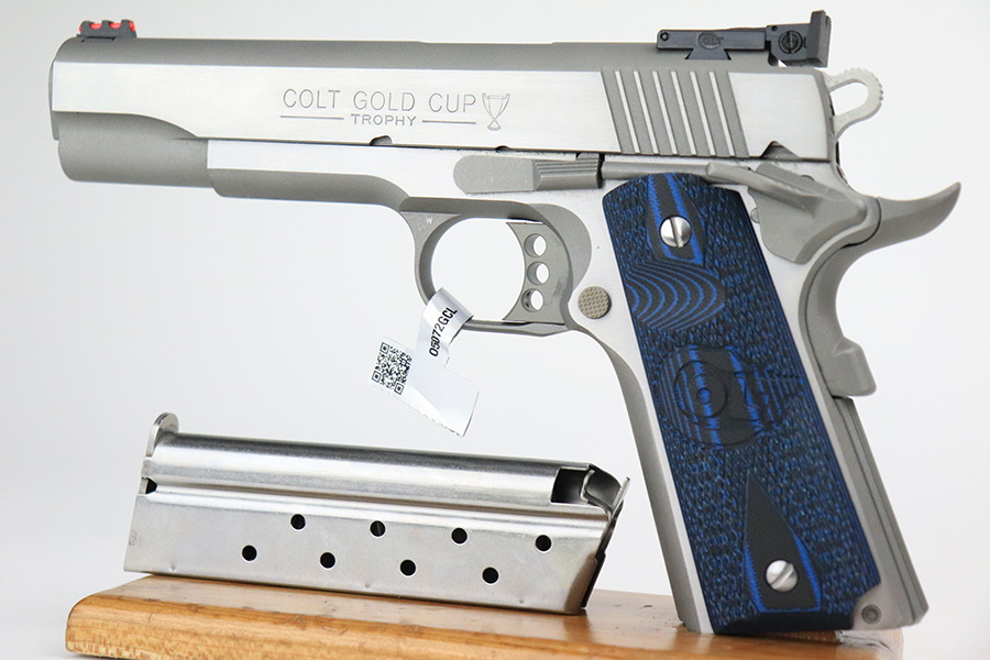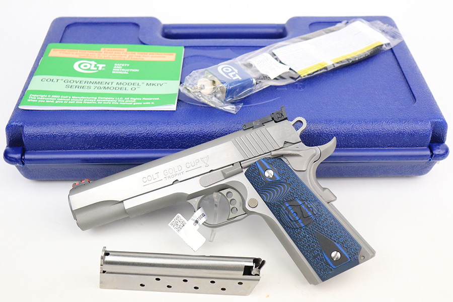 6/13/22 – This is an ANIB Colt Gold Cup Trophy Series 70. Our consignor bought it new and never fired it. It has a factory stainless steel finish with National Match barrel, adjustable rear sight, beautiful Colt competition-blue G10 grips, and the skeletonized trigger. Original Colt case is matching numbered to the pistol. Has the original manual and Colt lock. FFL required.