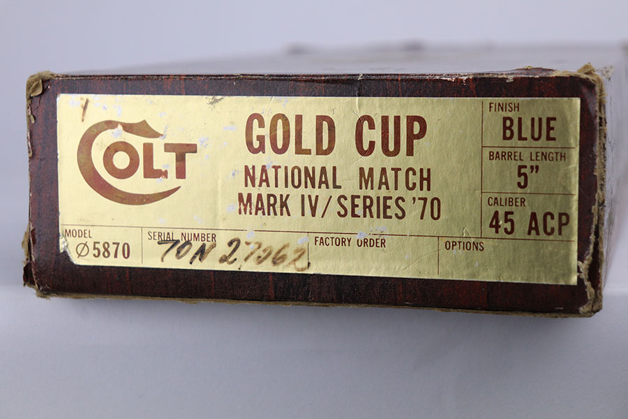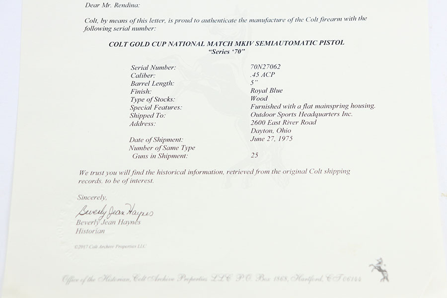 4/21/21 – This is a mint Colt Series 70 Gold Cup National Match in the original, matching box. The pistol comes with a Colt archive letter showing it shipped to a sporting store in June of 1975. The gun shows almost zero sign of use or handling. Box is numbered to the gun. Includes a basic Colt manual. FFL required.