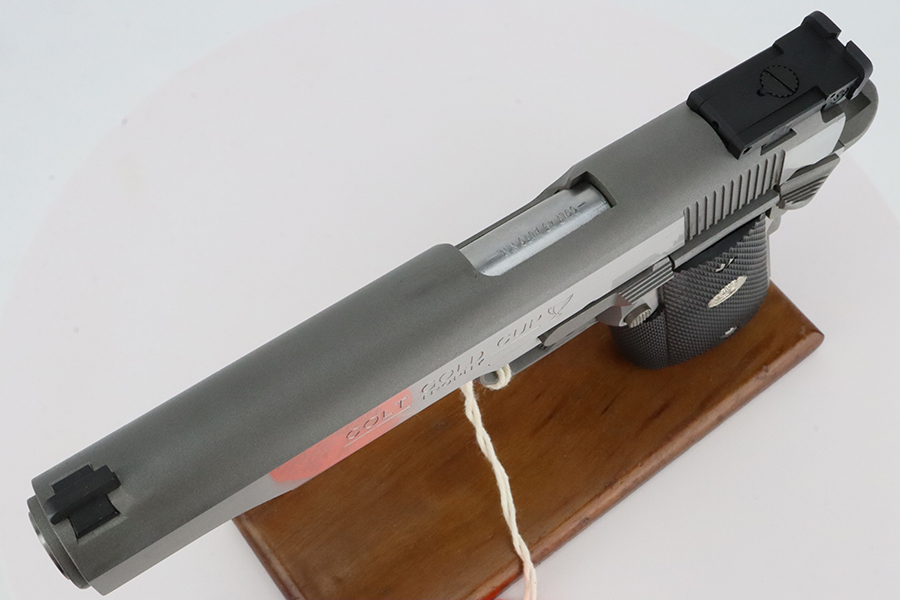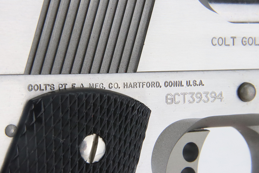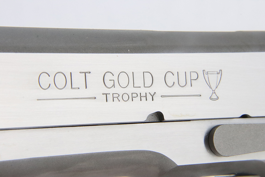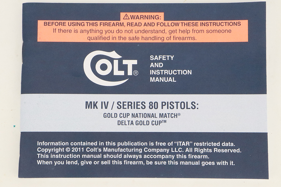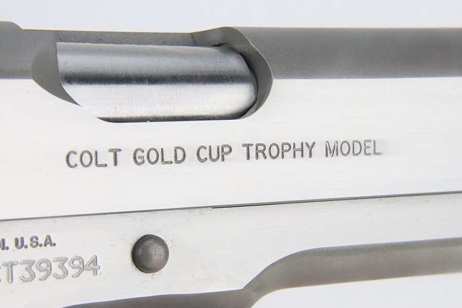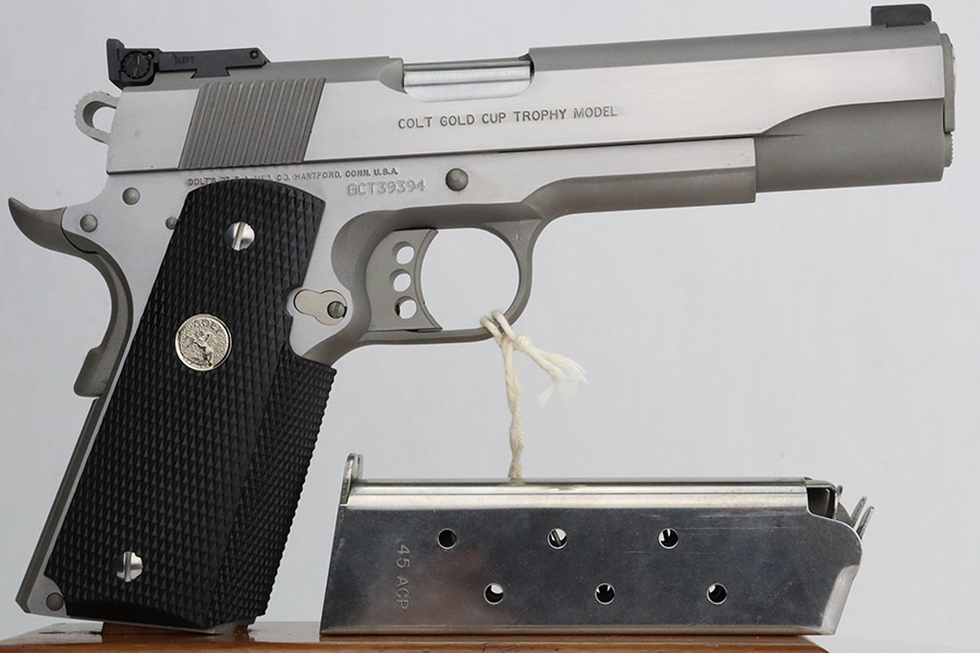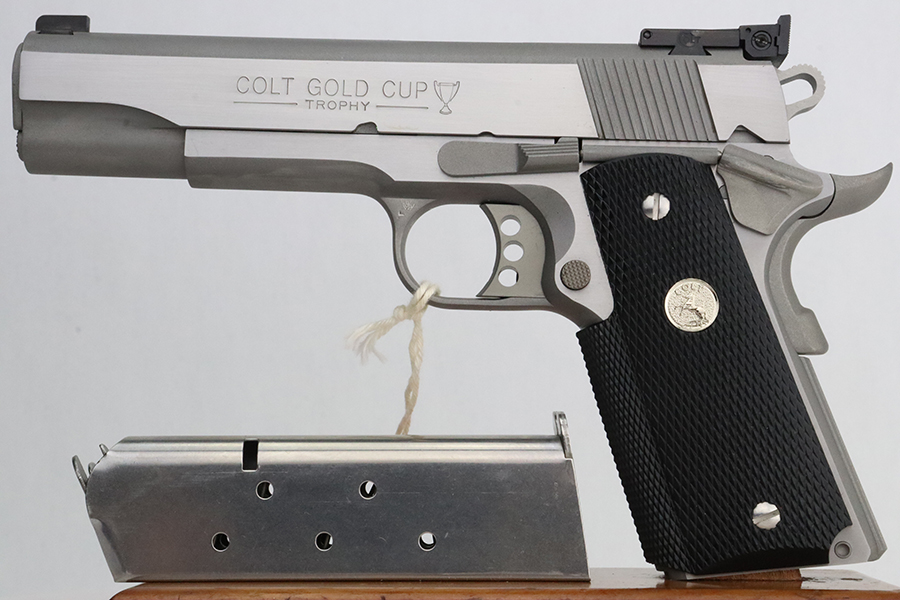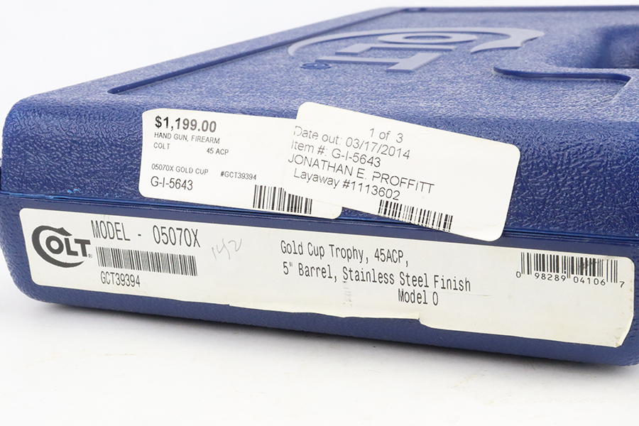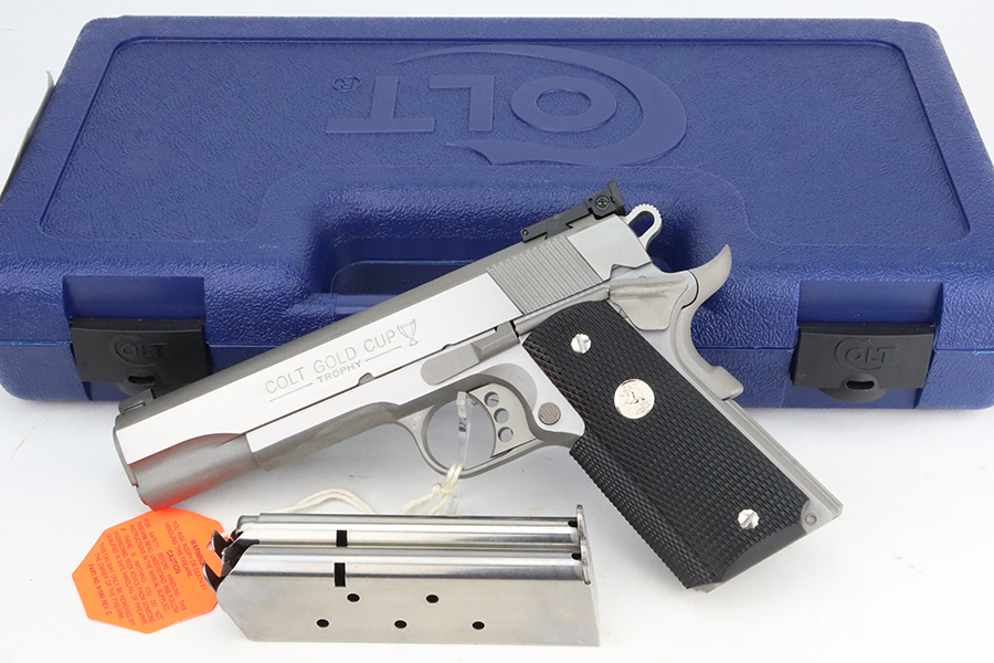 3/7/24 – This is a like-new example of a Colt Gold Cup Trophy, chambered in .45 ACP. It has a really nice stainless finish and is mint with no signs of wear or use. Fitted with a nice black rubber grip. Mint bore. It comes with its original matching-numbered hard case, owners manual, gun lock, two magazines, and a barrel bushing tool.