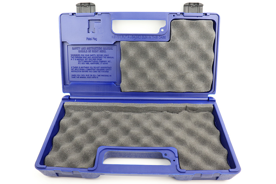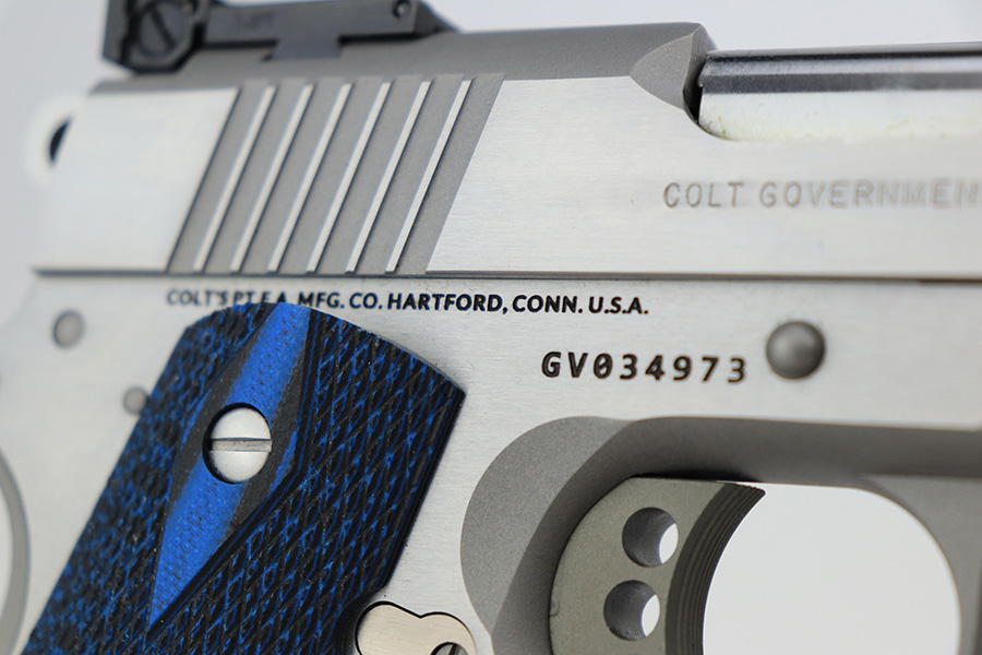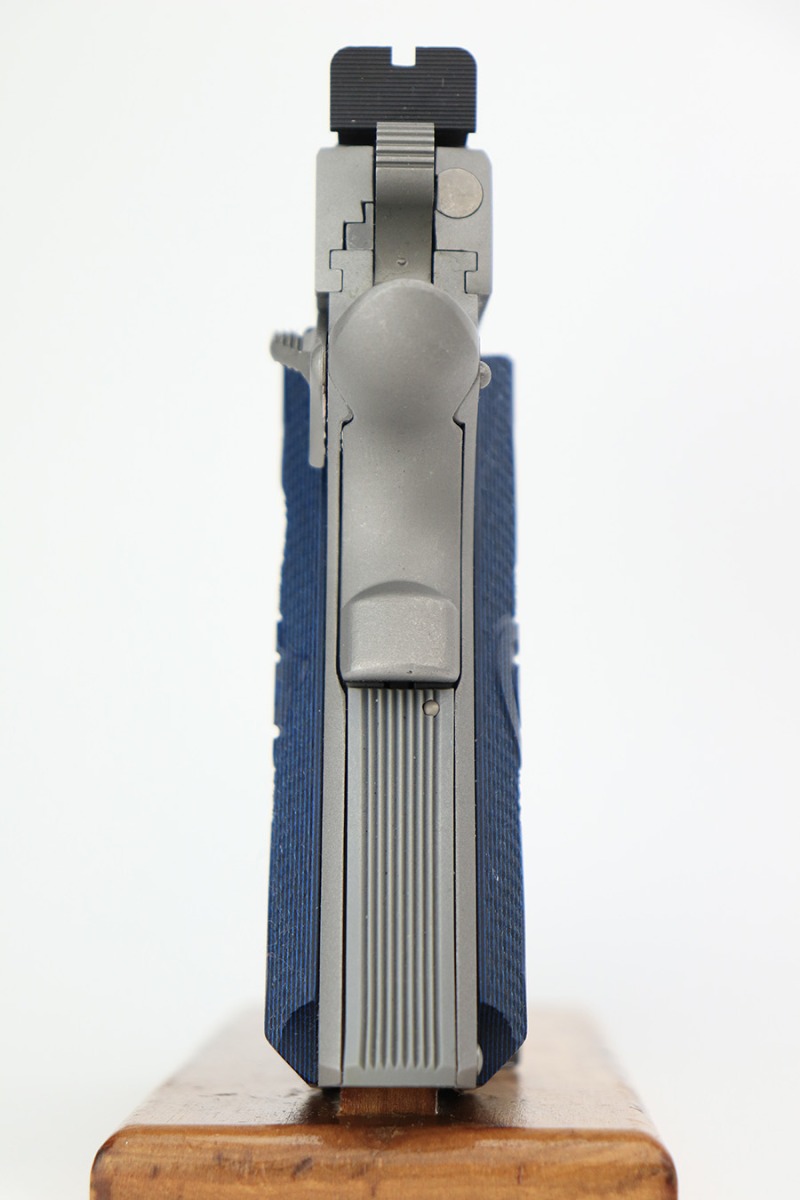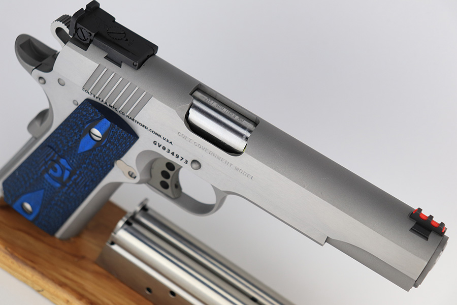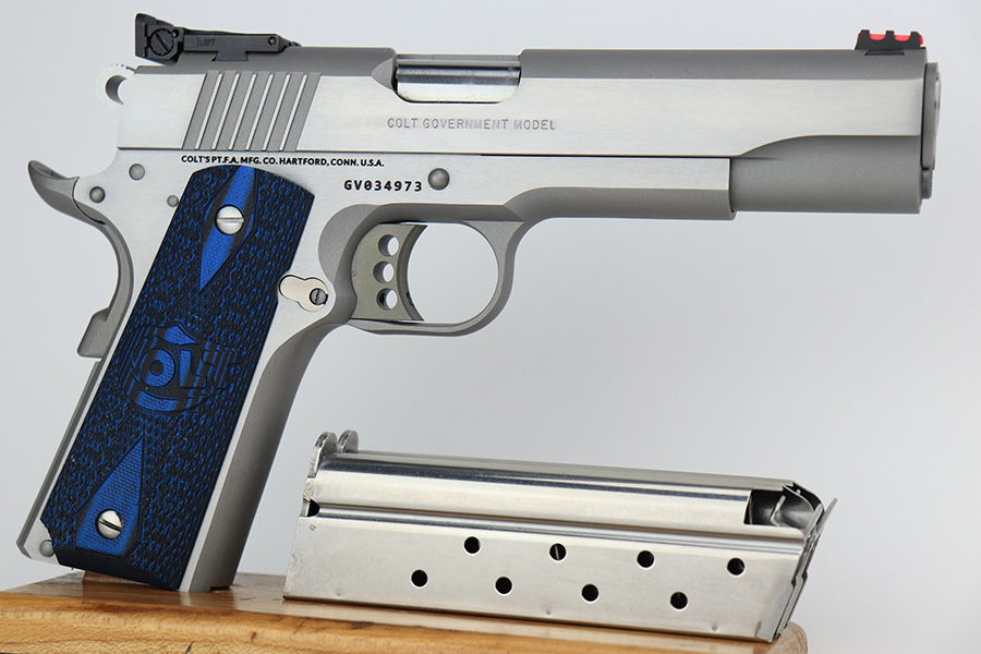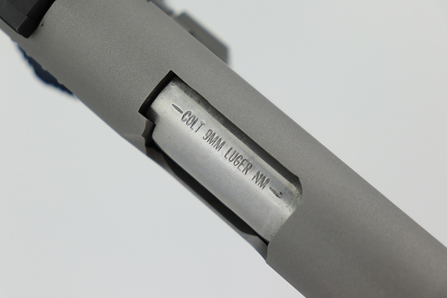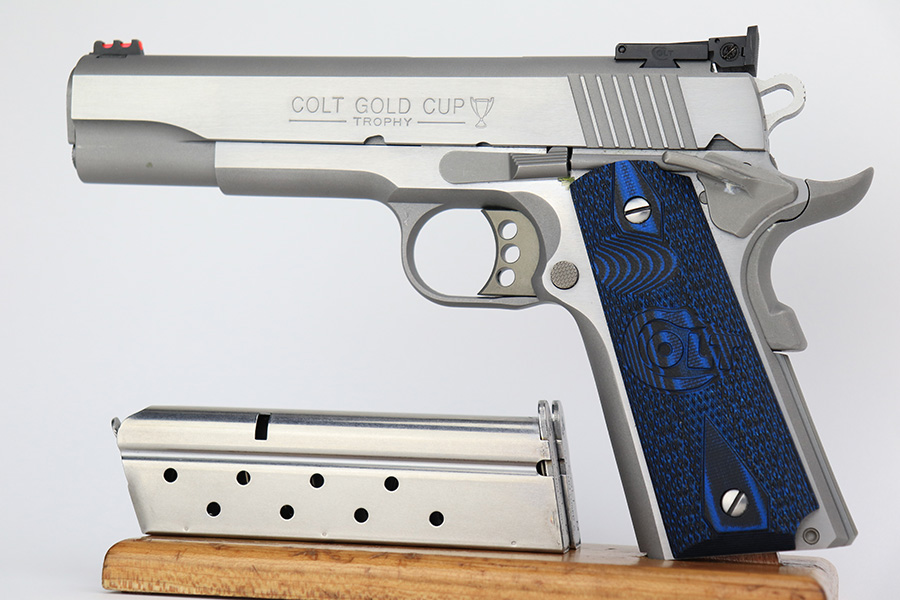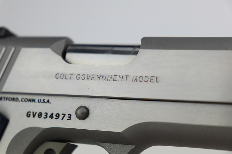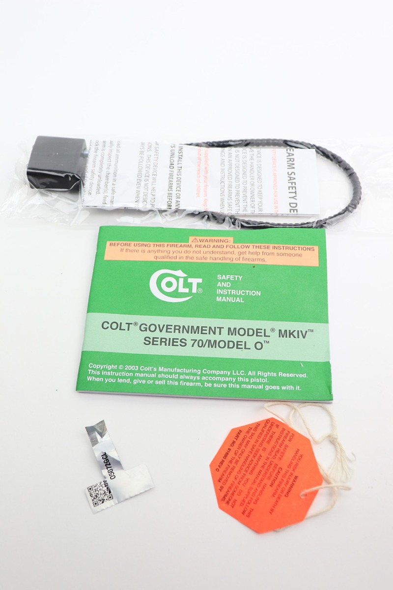 5/16/23 – This is a mint example of a Colt Government Model MK IV Gold Cup Trophy, chambered in 9mm Luger. It comes with its original matching hard case, owners manual, gun lock, and two magazines. The gun itself is in like-new condition with just a few tiny handling marks here and there. Excellent stainless finish and fitted with really nice blue/black composite grips. Fiberoptic front sight. Mint bore.