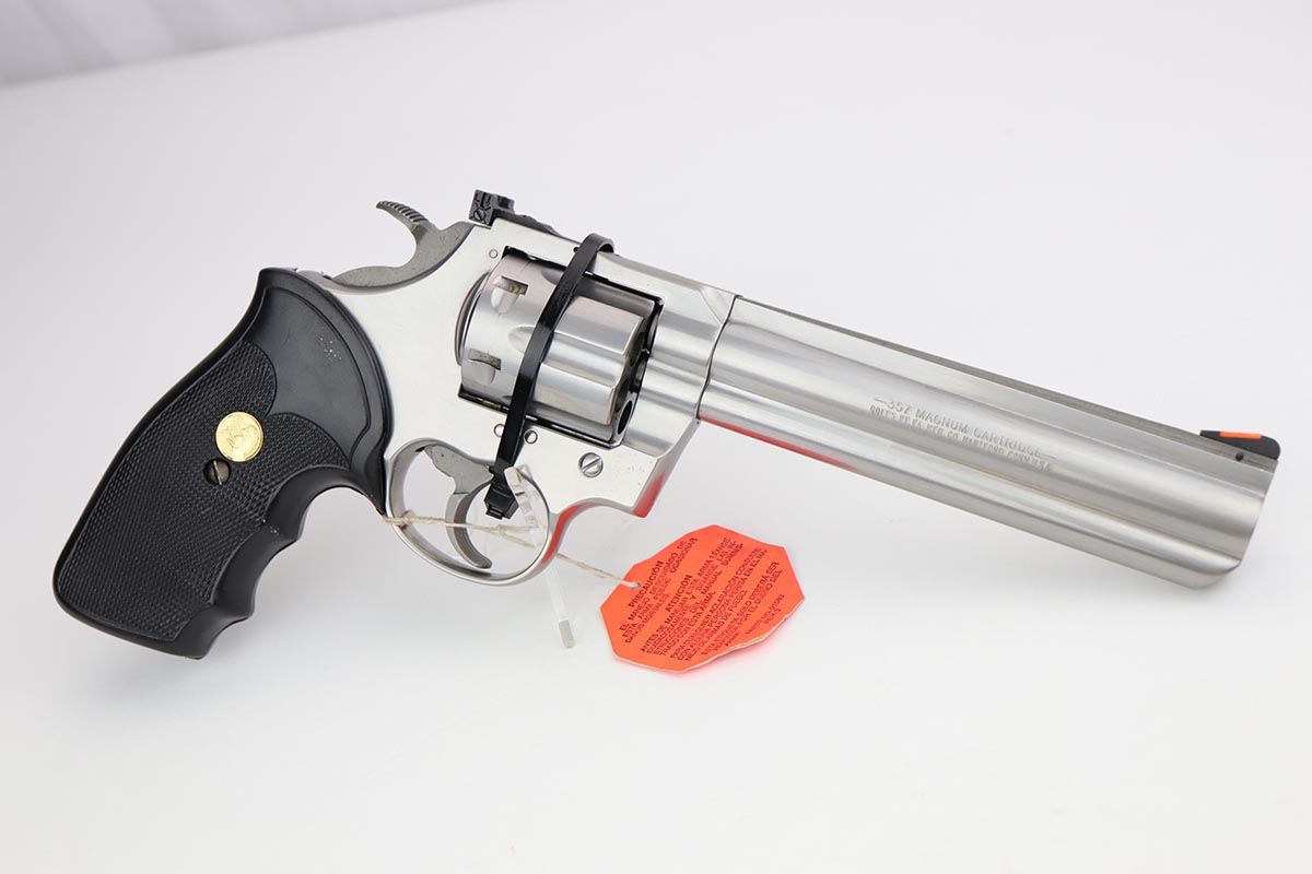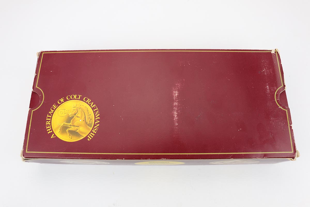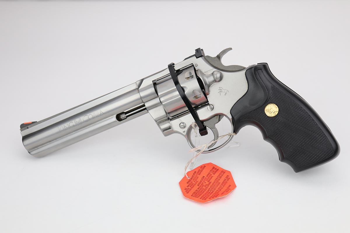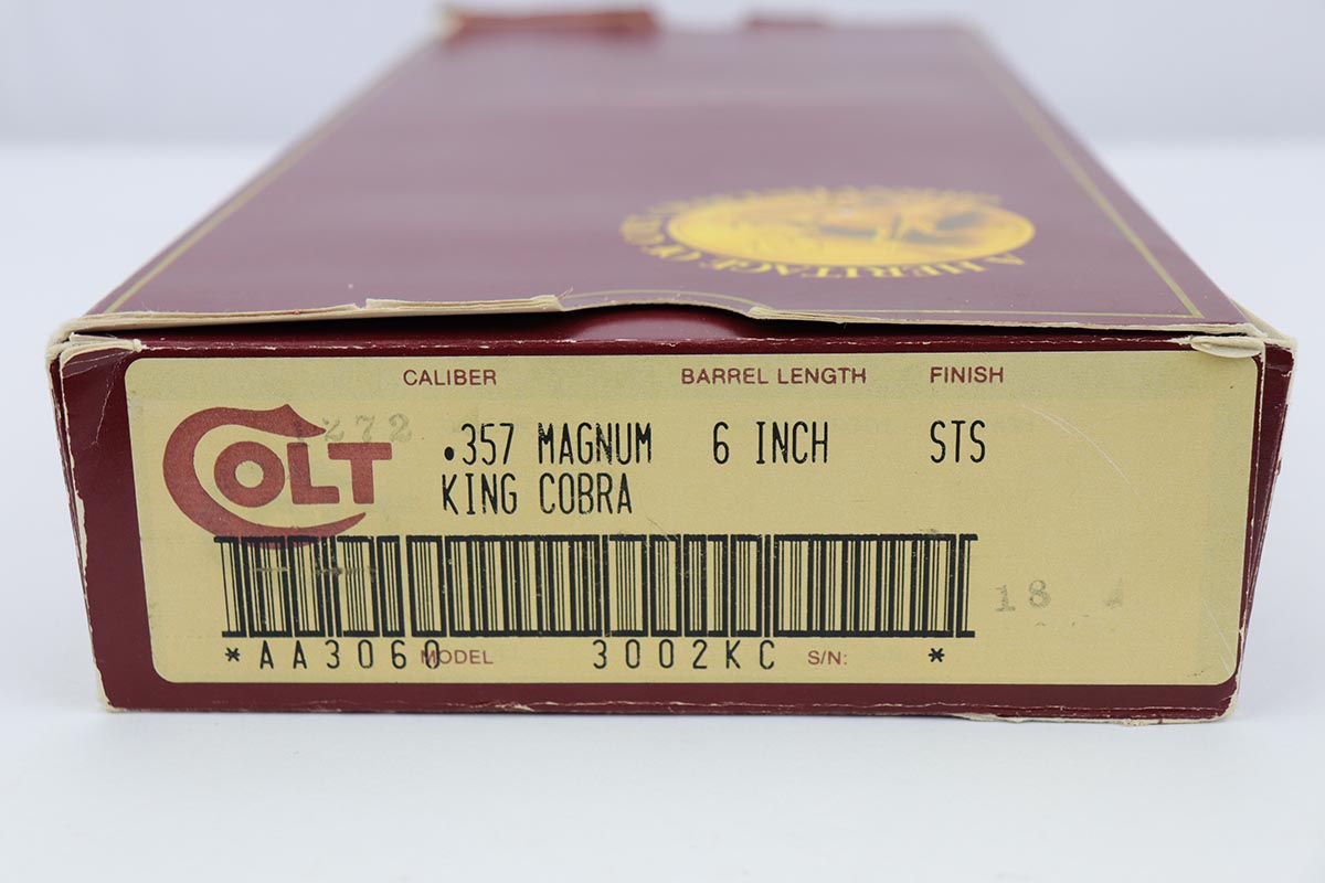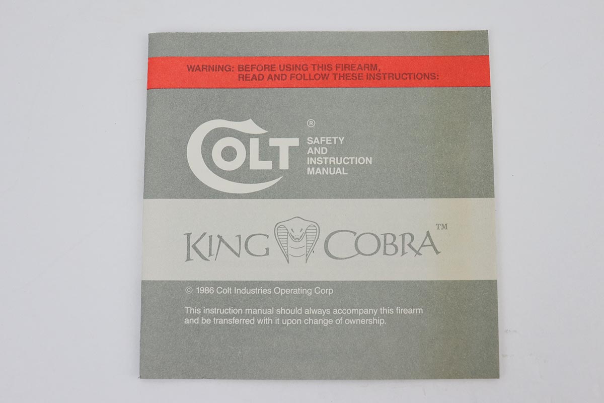 10/15/19 – This is a near-mint Colt King Cobra in its original, matching box. Made in 1987, the gun has just a very minor roll mark, and a couple tiny spots of wear on the right side of the frame. Six inch barrel with a minty bore. Rubber Colt grips with Colt medallion. Box includes original Colt manual and basic paperwork. It’s labeled and numbered with matching serial to the firearm.