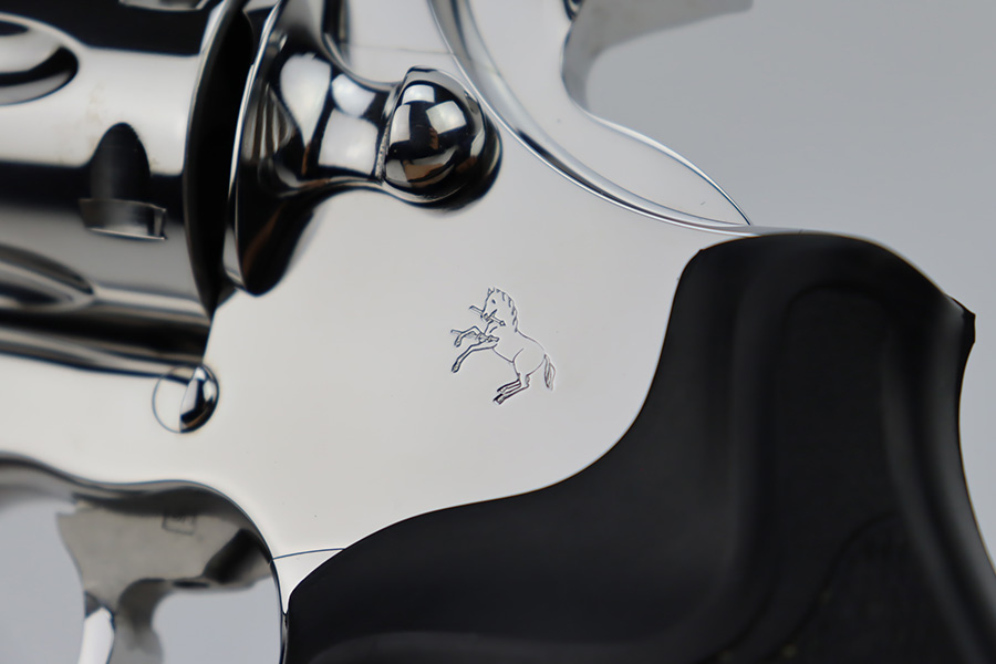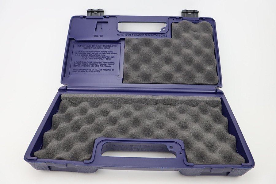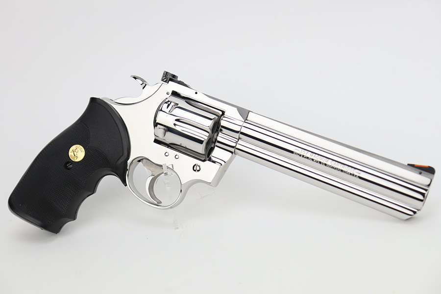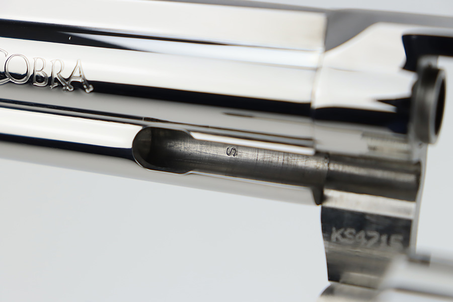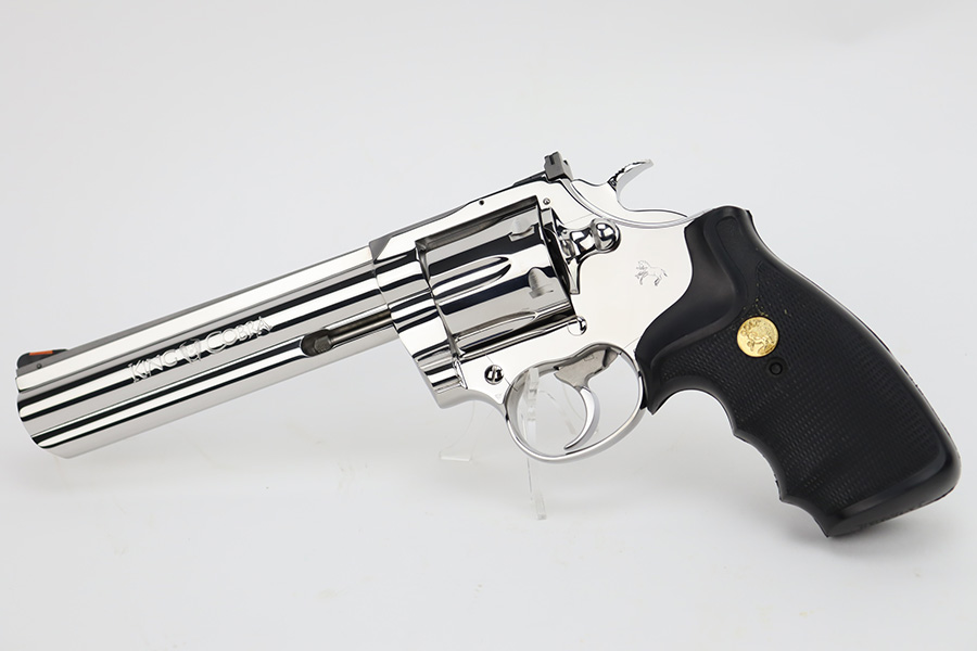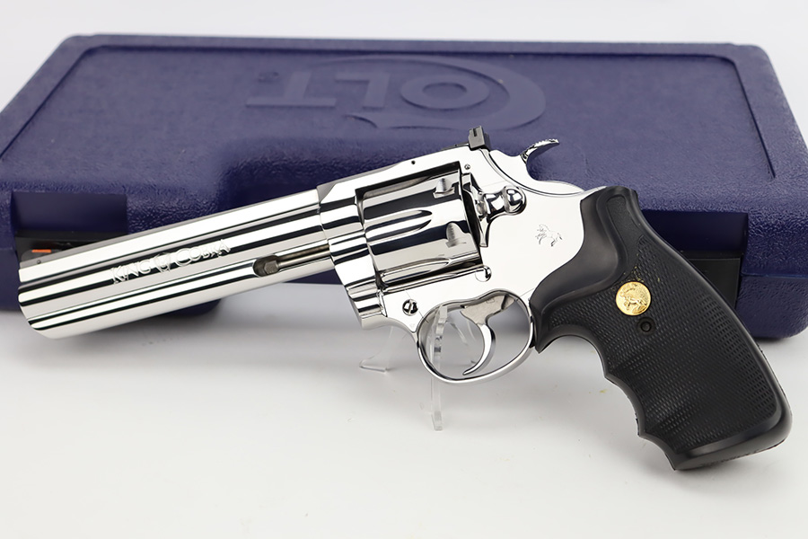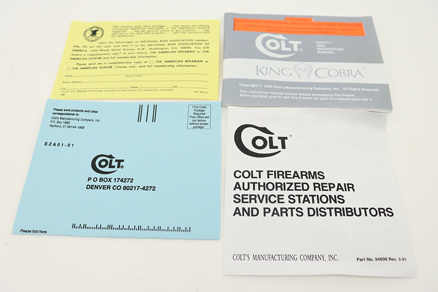 11/13/23 – This is a mint Colt King Cobra from 1996 in the original Colt plastic case. It has a six inch barrel with mint bore and appears to be unfired. Fantastic and clear stainless steel finish and not even a turn line on cylinder. Has the Colt rubber grips. The hard case is present, as is the manual but the original shipping sleeve is absent so the case isn’t serialized to this gun. FFL required.