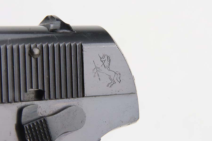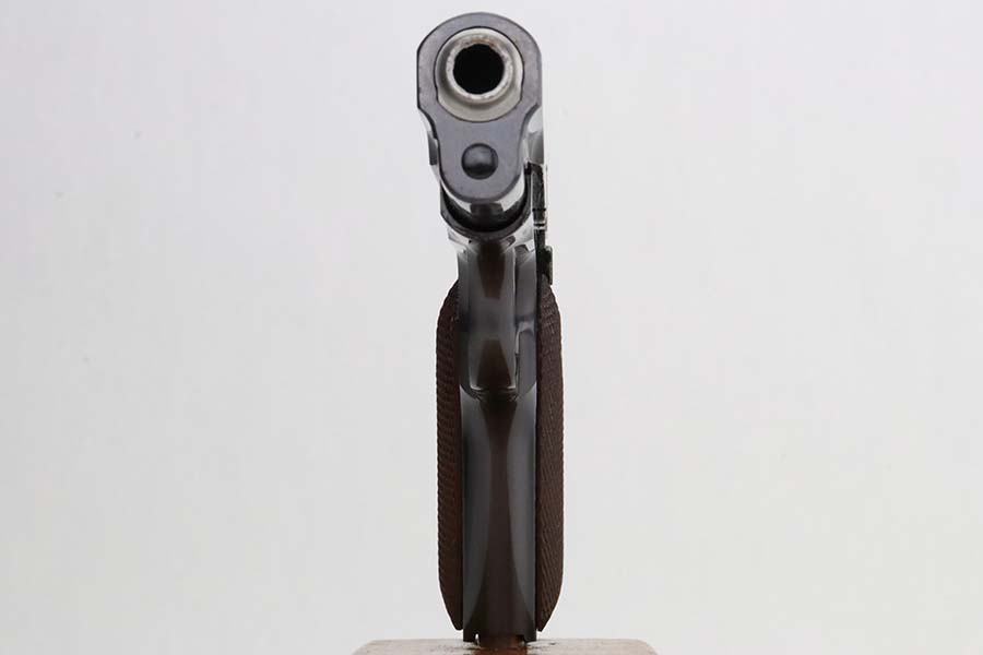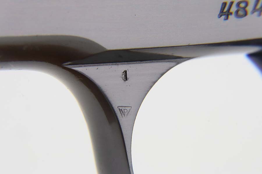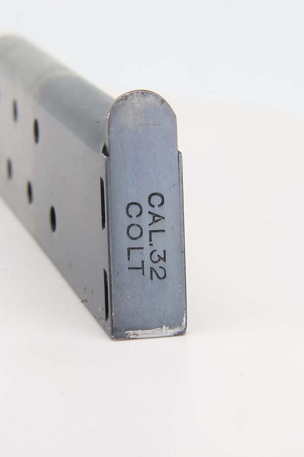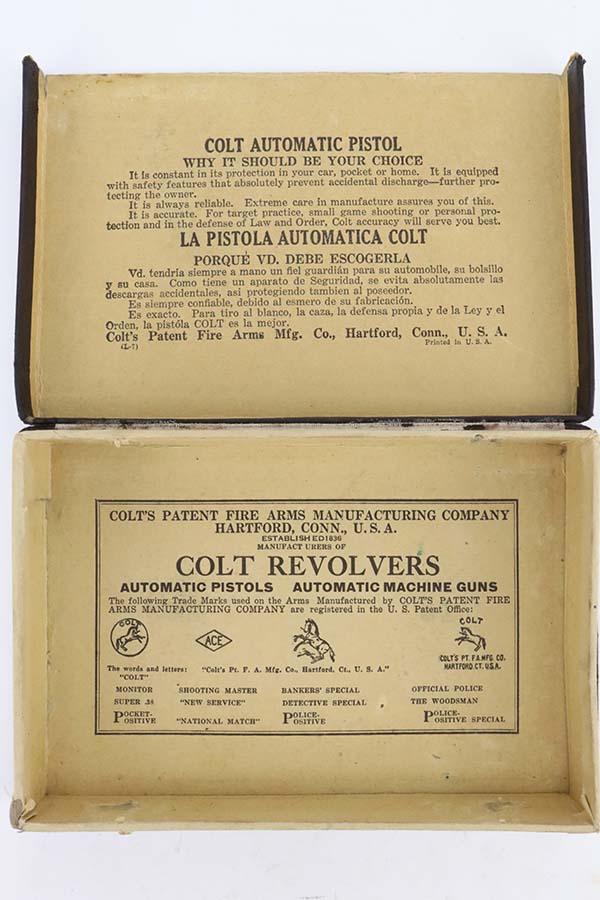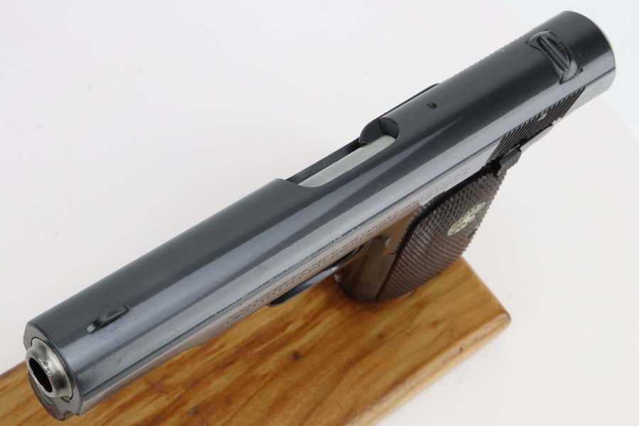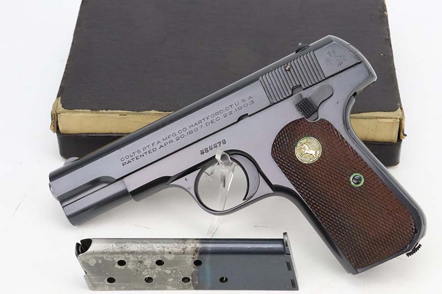 3/4/24 – This is near-mint example of a Colt Model 1903 Pocket Hammerless, manufactured in 1927 and chambered in .32 ACP. It comes with its original matching-numbered box, manual, one magazine, and a Colt Factory Letter. According to the letter, it was shipped to Bigelow Dowse Company in Boston, MA on December 5, 1927. The gun has retained virtually all of its original high polish bluing with just some tiny dots of oxidation here and there. Mint wood grips. Mint bore.