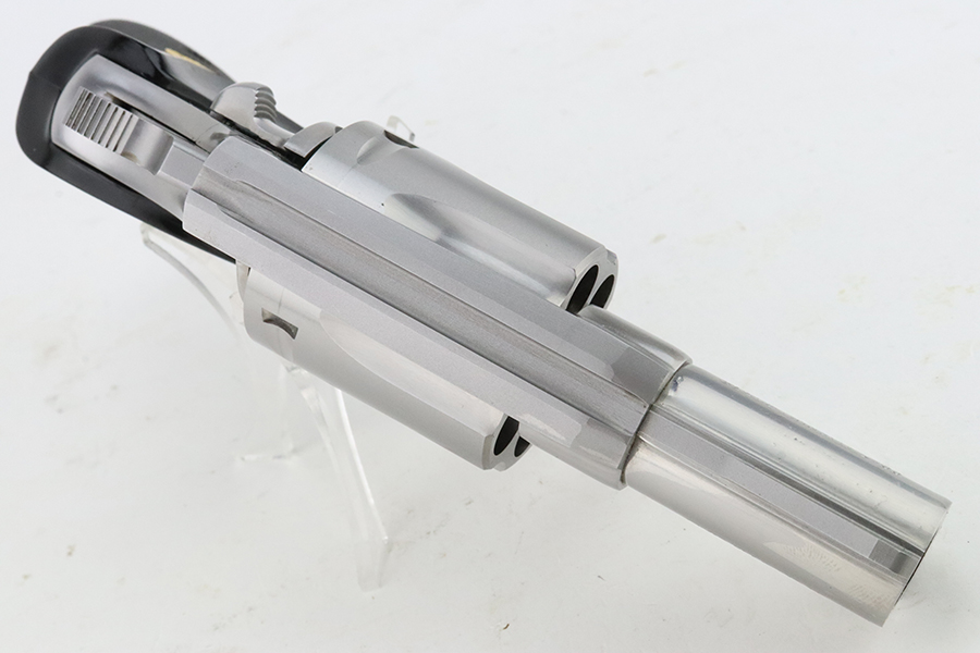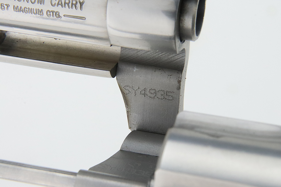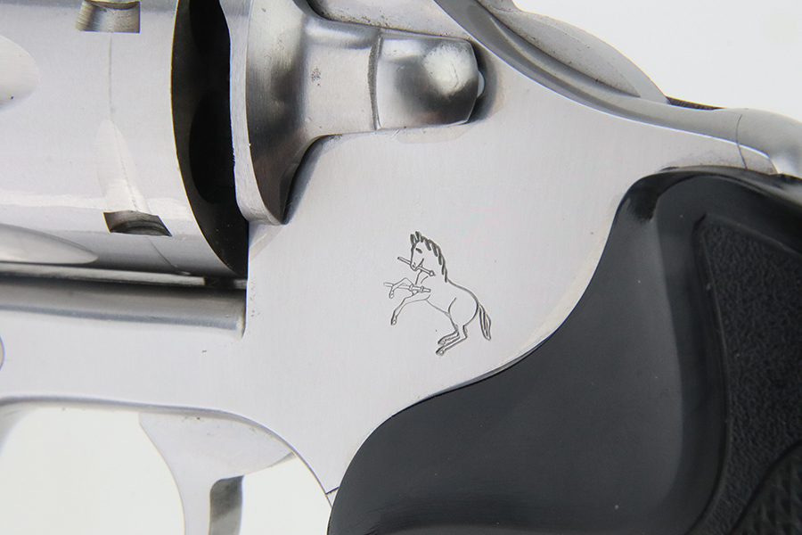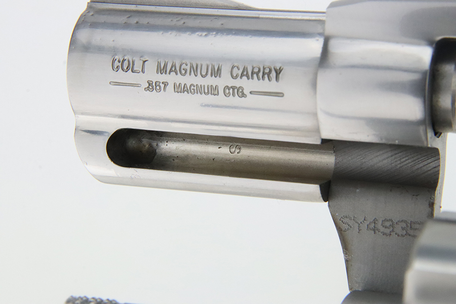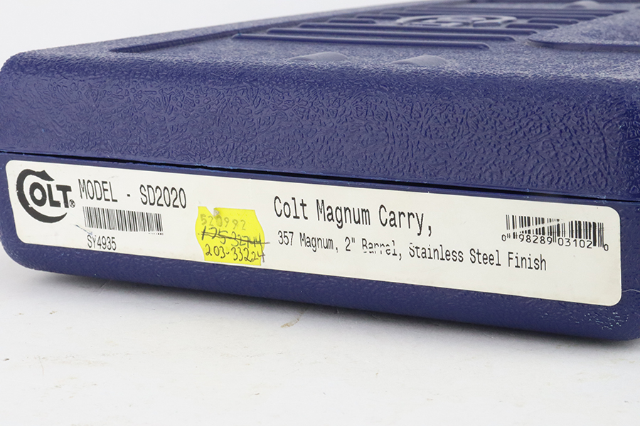 3/7/24 – This is a like-new example of a Colt Magnum Carry Revolver. Chambered in .357 Magnum with a 2″ barrel. Excellent stainless finish. Left side of barrel does appear to have a casting flaw in. It is mint with no signs of wear or use except for a light roll mark on the cylinder. Mint bore. Fitted with excellent black rubber grips. It comes with its original matching-numbered hard case and owners manual.