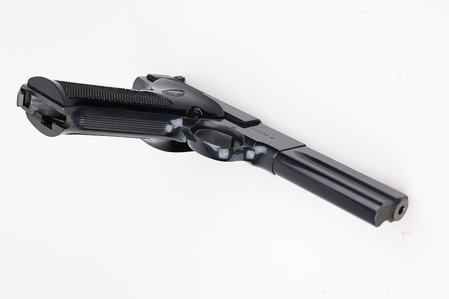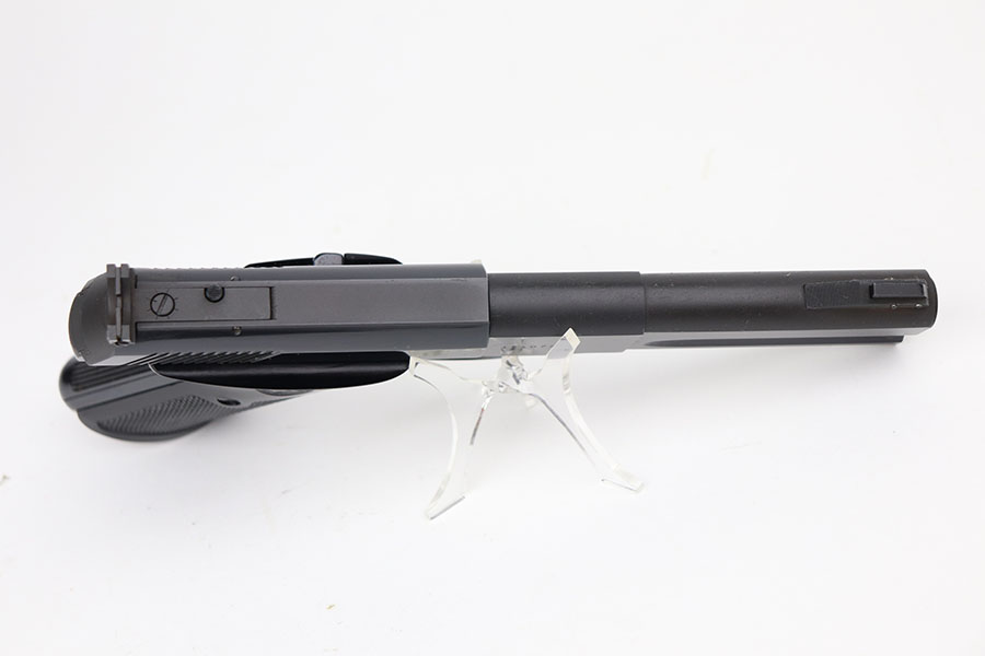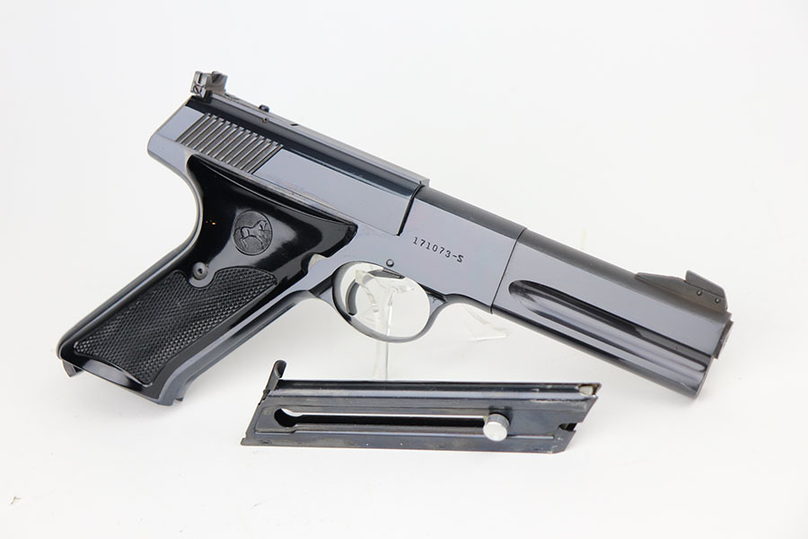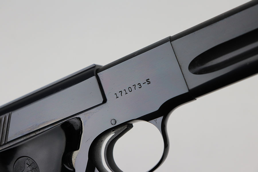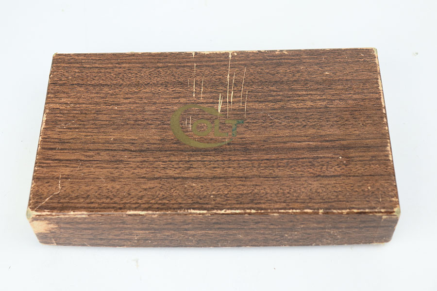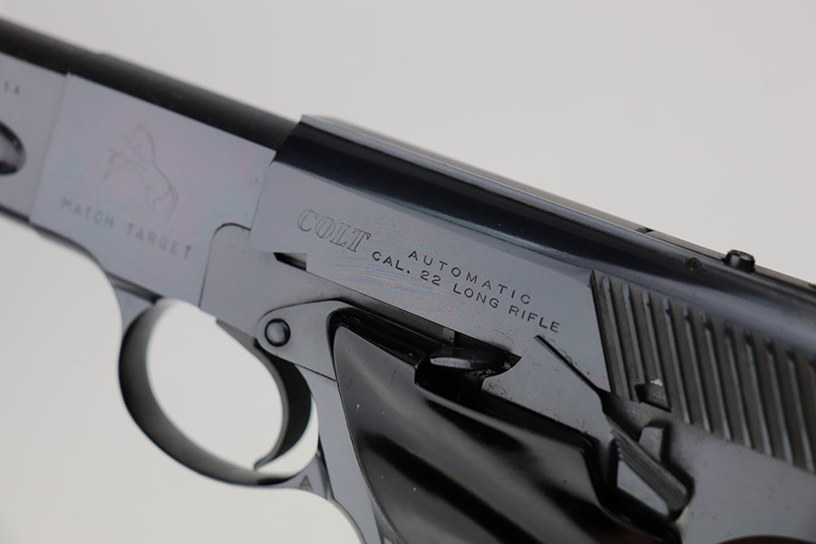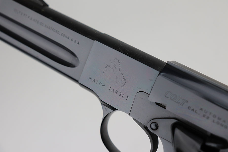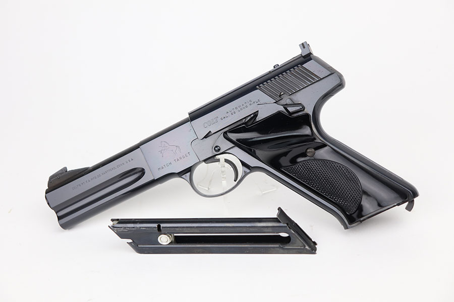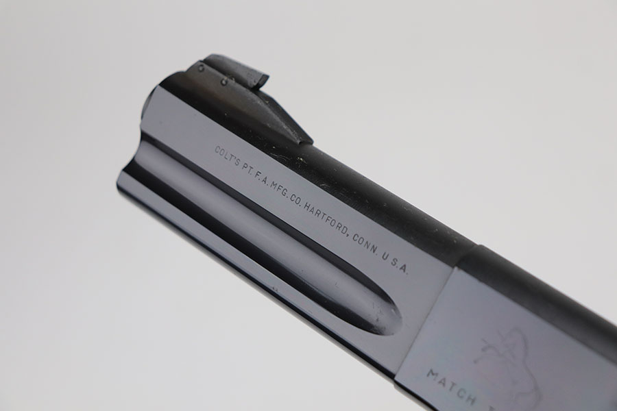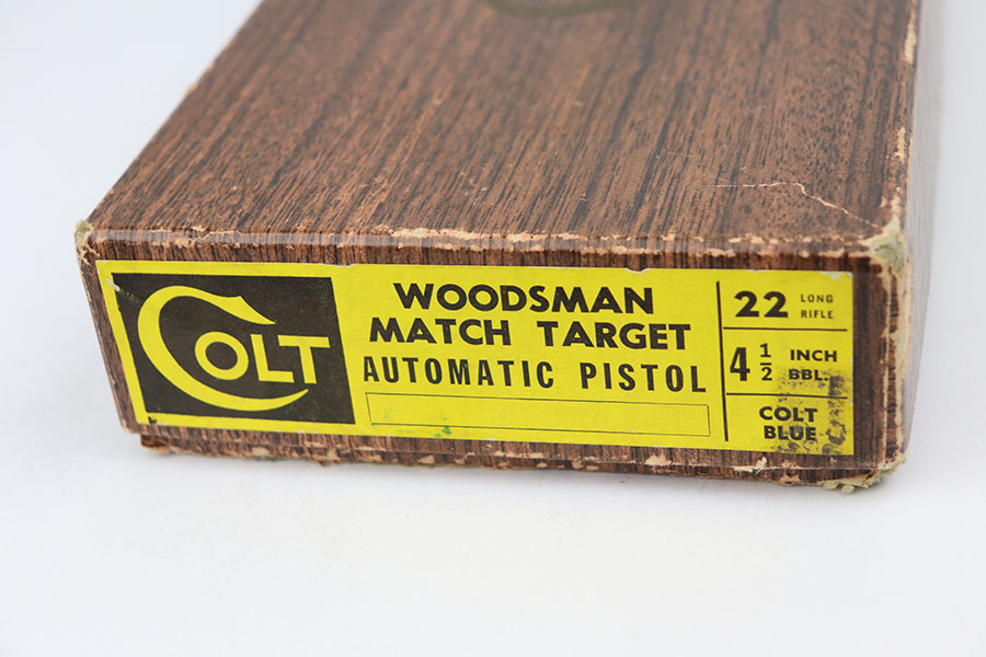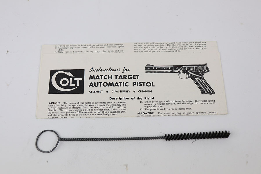 4/7/21 – This is a mint Colt Match Target in the original box. It has a rare 4.5 inch barrel and was made in 1956, the first full year of 3rd series production. It has original black factory grips and a mint bore. The beautiful, deep bluing is nearly flawless. Proper style magazine. Original factory Accro sights. Box is correct and original with the serial number of the pistol on the bottom. Includes the original instructions and cleaning rod. C&R eligible.