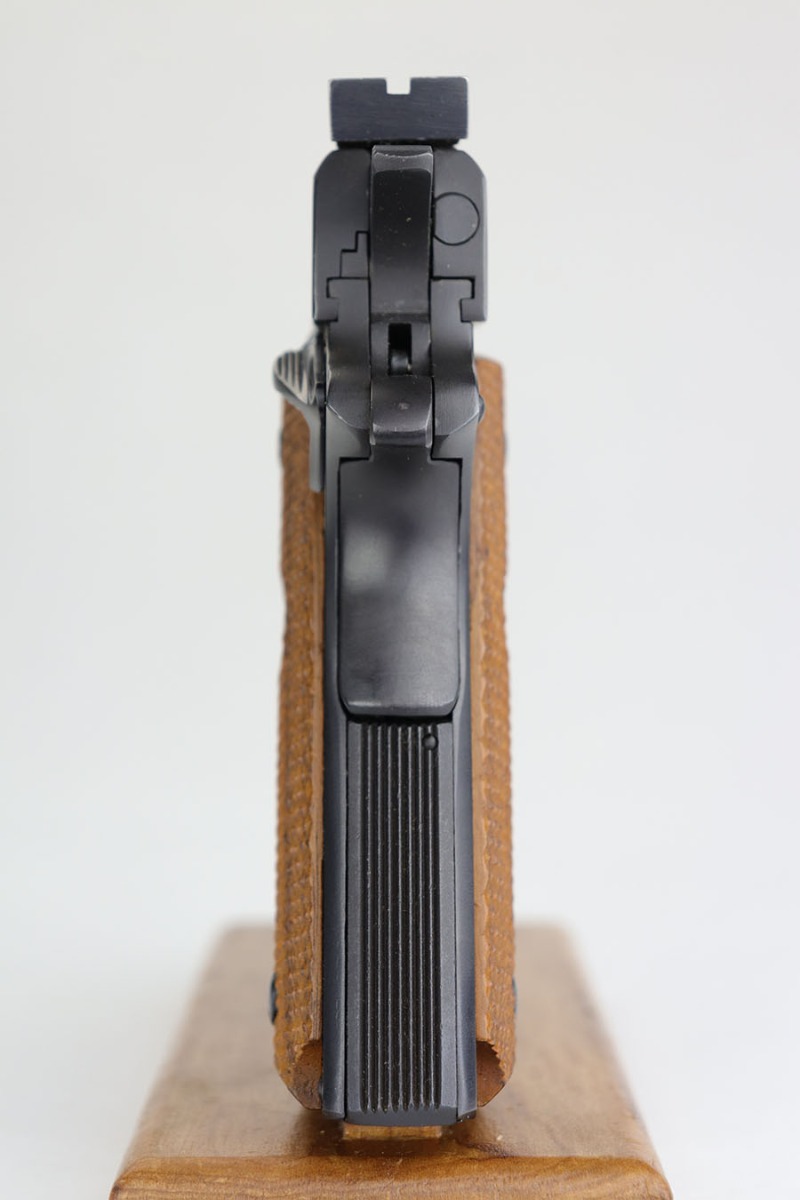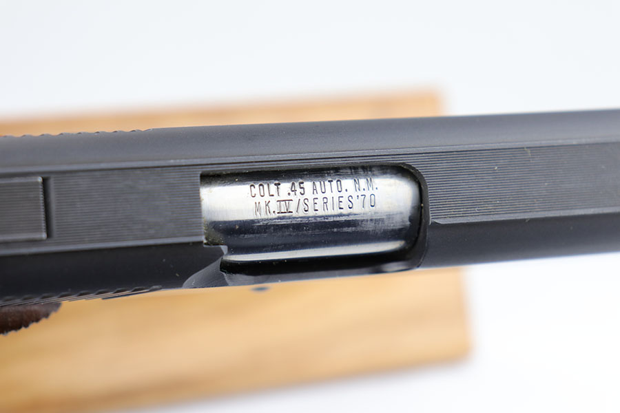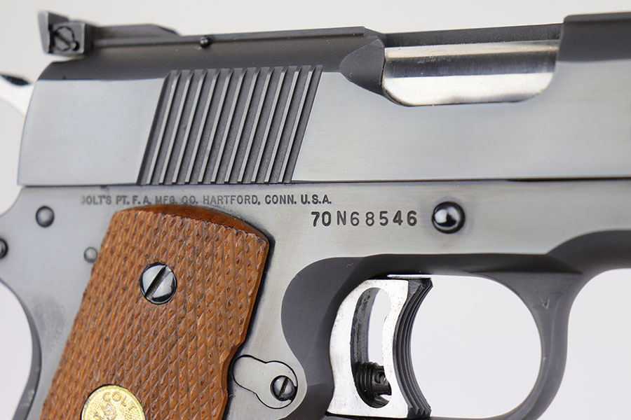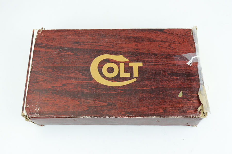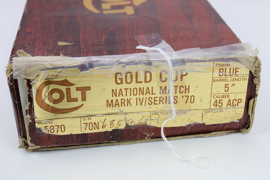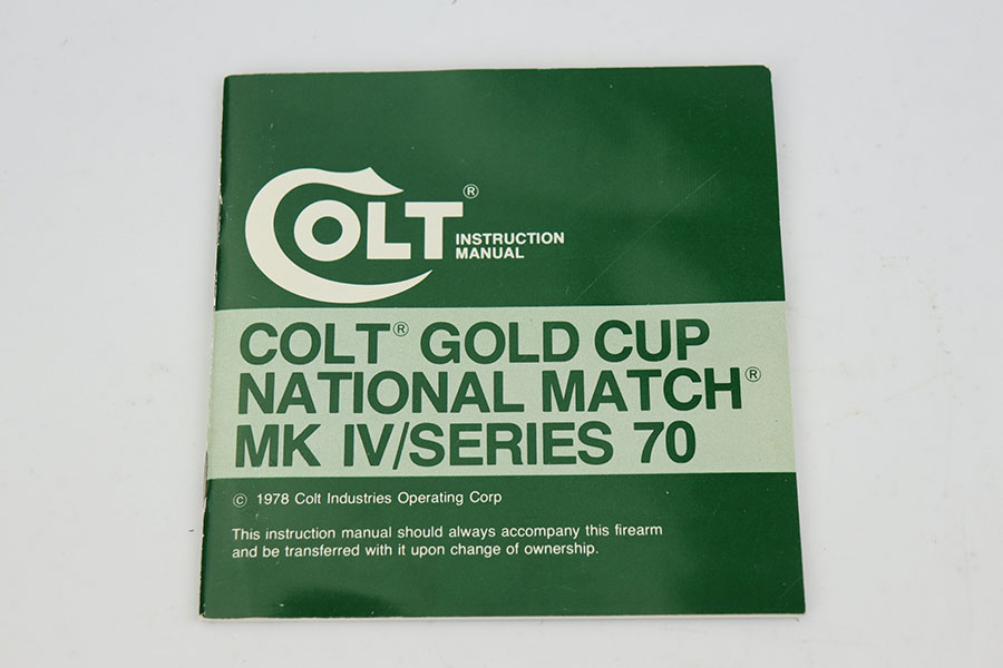 6/3/20 – This is a mint Colt Mark IV Series 70 Gold Cup National Match in the original, matching box. The pistol looks virtually untouched, and dates to 1979 by serial. There’s maybe a tiny hint of muzzle wear from shifting in the box, but it’s pretty much perfect otherwise. Comes with the original styrofoam liner and basic Colt manual/paperwork. Box is numbered to the pistol and shows obvious wear, with some repairs done by tape.