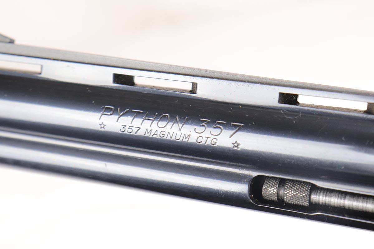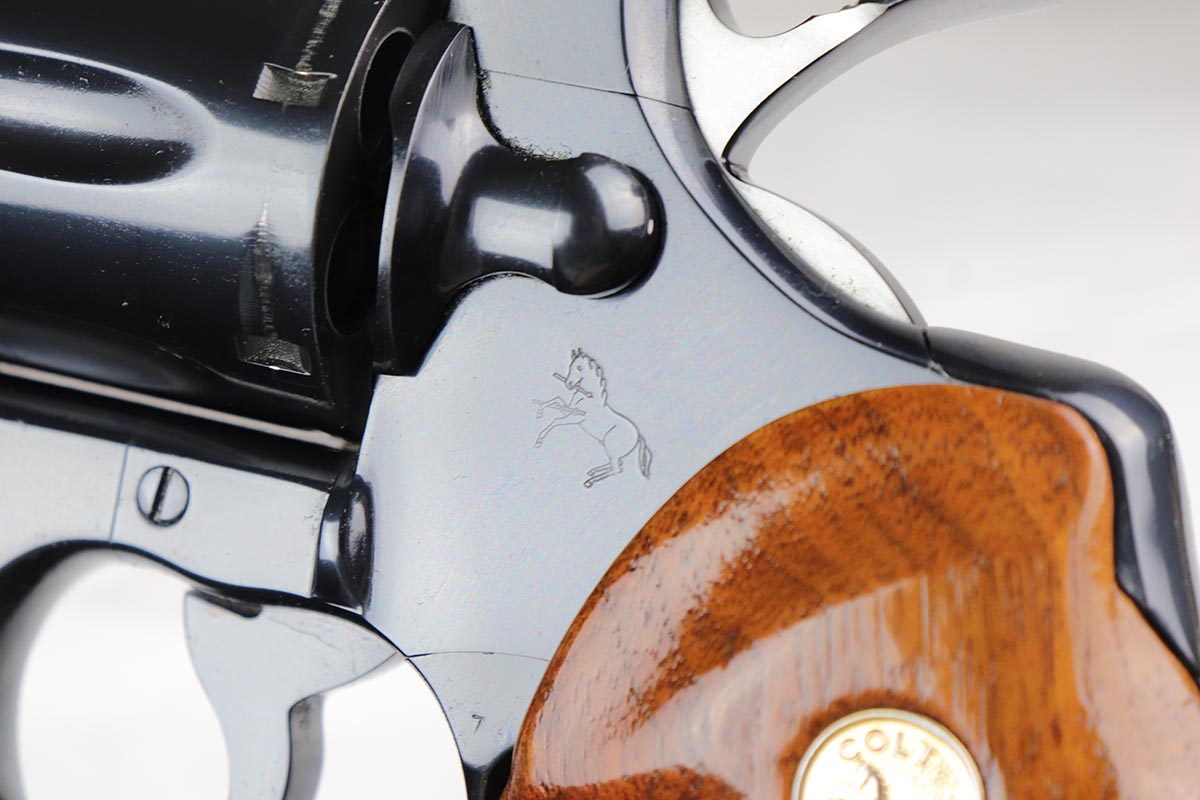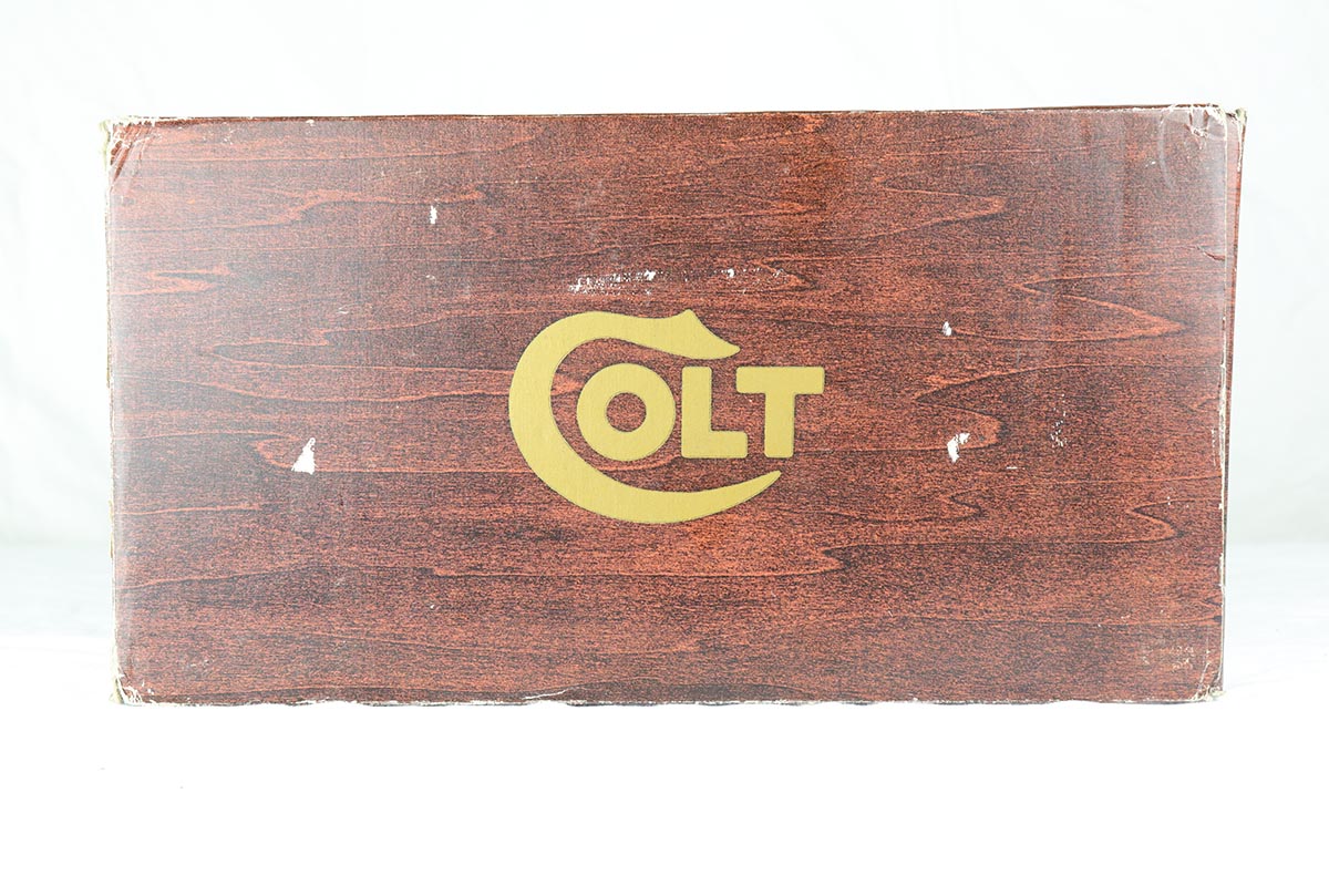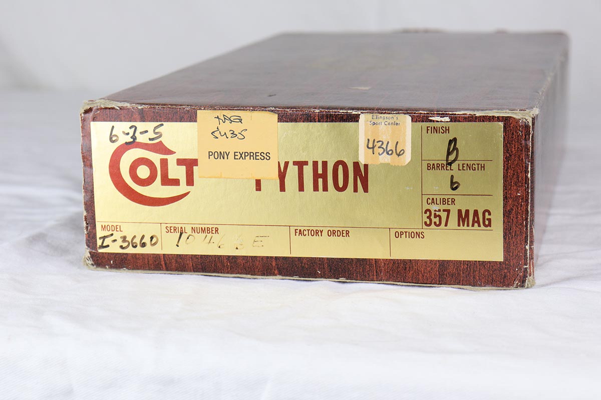 3/21/18 – This is a magnificent, “as new in the box” example of an early 1970s Colt Python.  It is chambered in .357 magnum with a desirable 6-inch barrel. The gun is a complete set and appears unfired after leaving the factory. It comes with the original serialized box and all the paperwork. The finish is the early Colt blue that remains the gold standard for bluing to this day.  An impossible to upgrade specimen that would continue to appreciate in value!