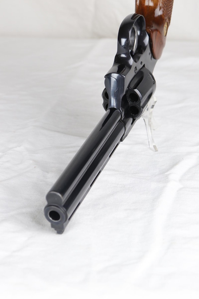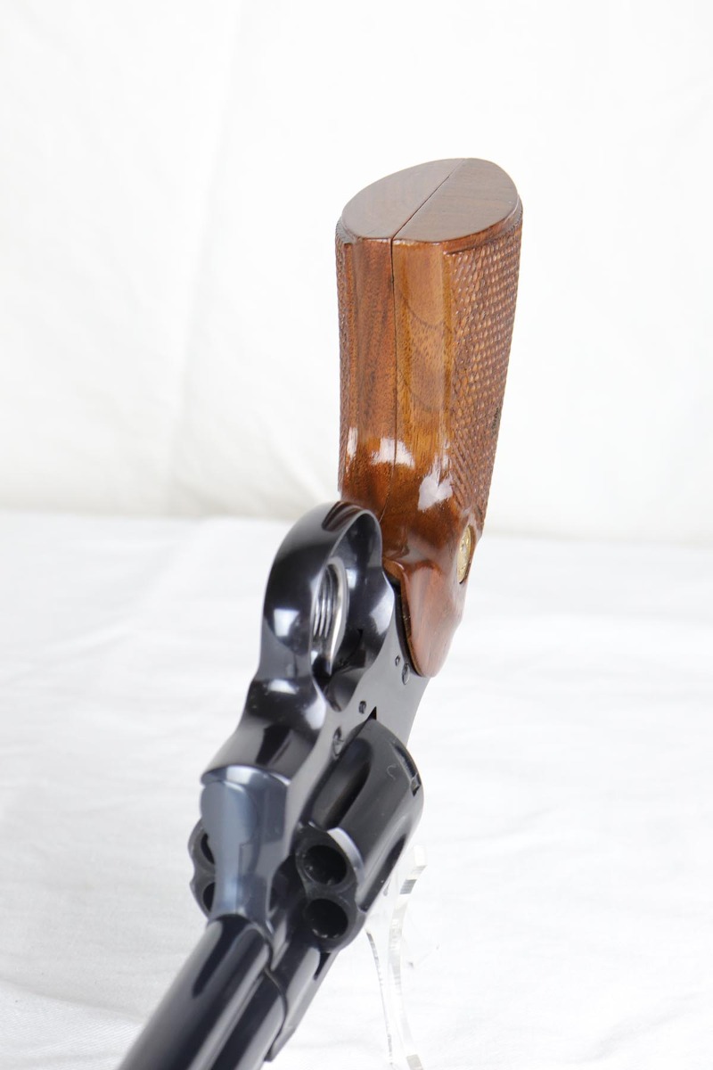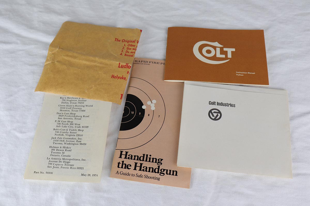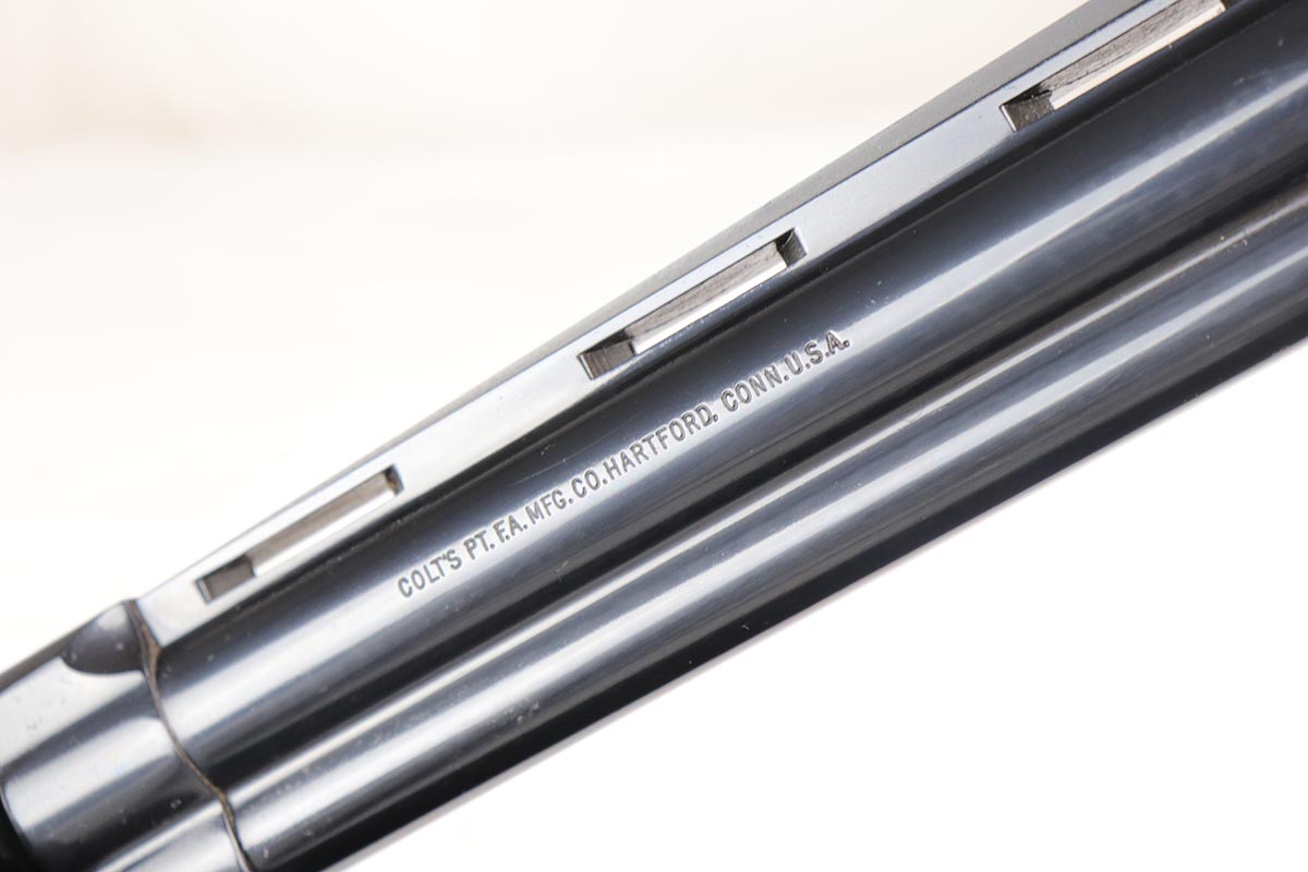 3/21/18 – This is a magnificent, “as new in the box” example of an early 1970s Colt Python.  It is chambered in .357 magnum with a desirable 6-inch barrel. The gun is a complete set and appears unfired after leaving the factory. It comes with the original serialized box and all the paperwork. The finish is the early Colt blue that remains the gold standard for bluing to this day.  An impossible to upgrade specimen that would continue to appreciate in value!