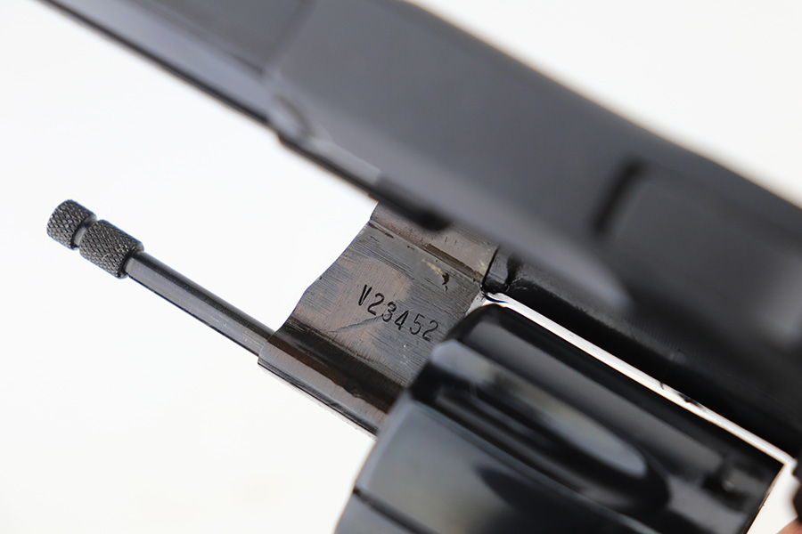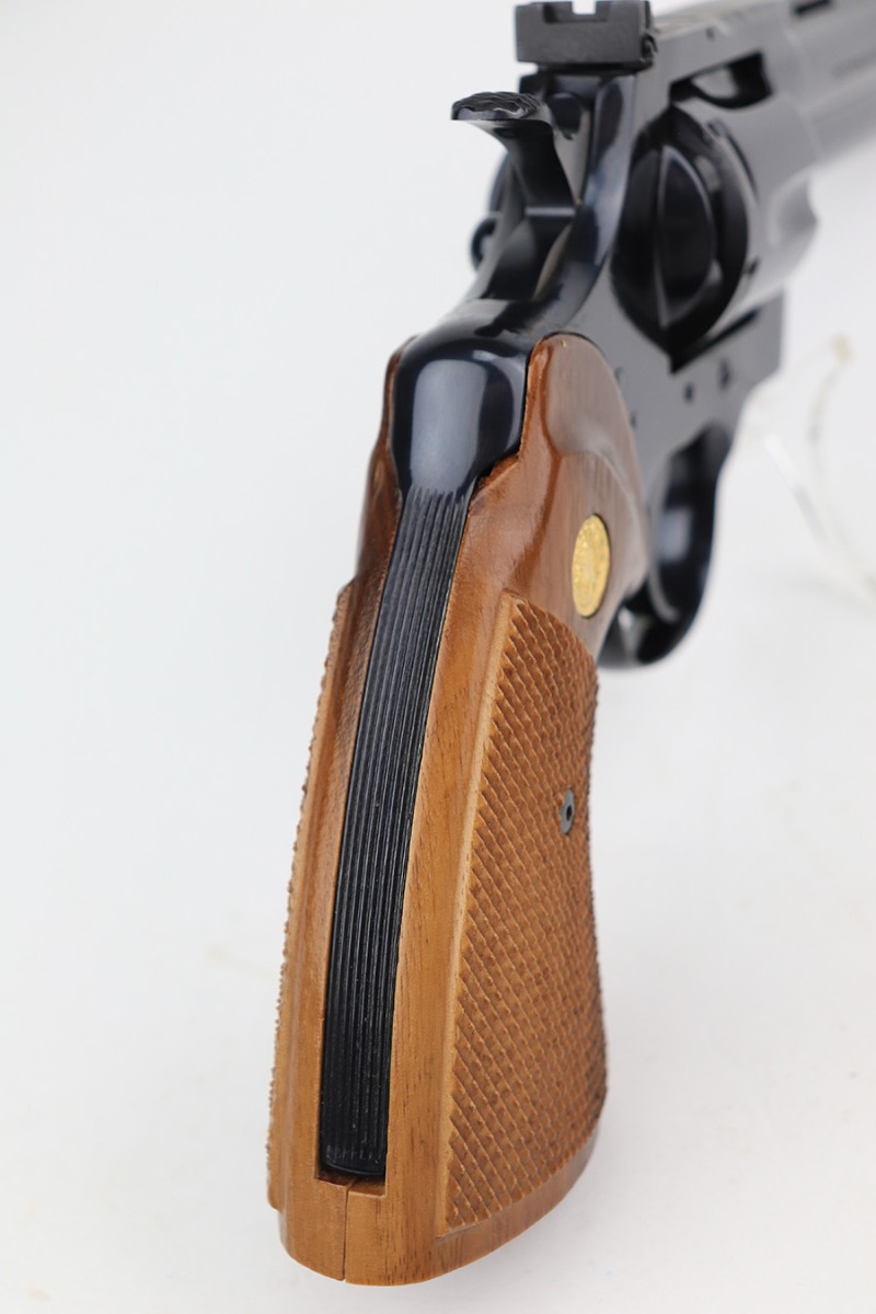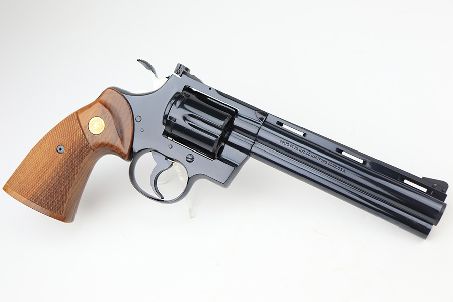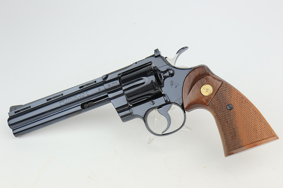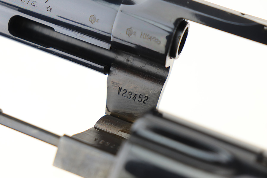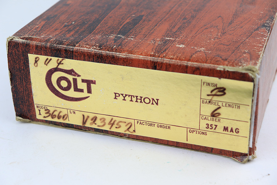 3/3/22 – Made in 1978, this is an original and mint Colt Python in its matching box. It has just a tiny hint of a turn line on the cylinder, and the bore shows the slightest sign of ever being shot out of. The gun was imported into Germany in 1979 as denoted by the nitro proofs, Ulm proof house antlers and HK date. Could be a serviceman bring back but no way to know for sure. Includes all the basic Colt paperwork, and the box is numbered and matching to the gun. Desirable 6in barrel and mint wood grips. FFL required.