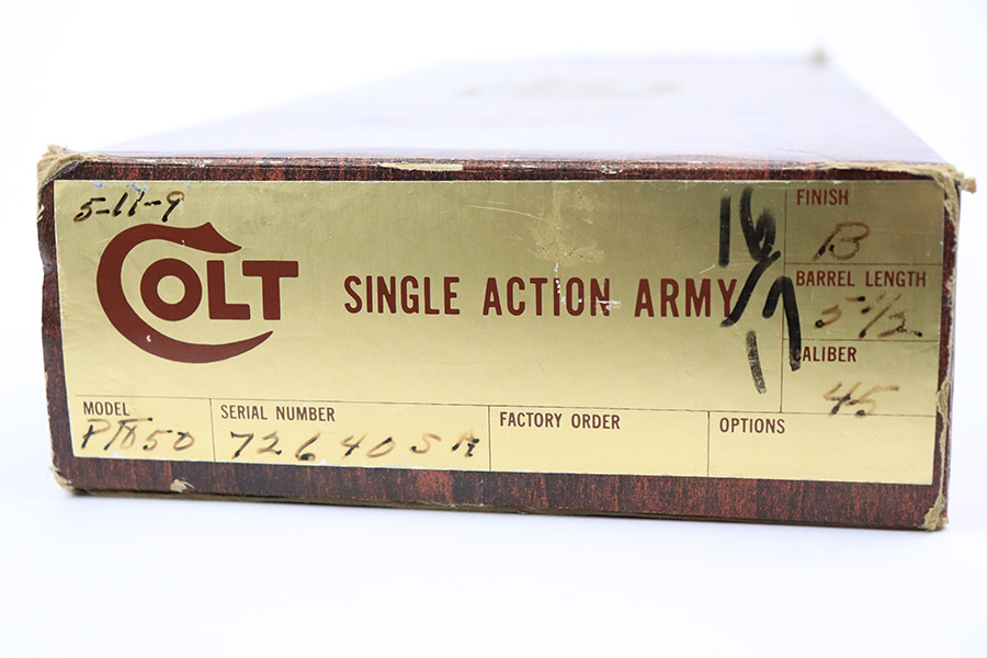 6/16/22 – This is an ANIB Colt Single Action Army revolver. It’s a 2nd gen example from 1975, and comes with the original Colt paperwork, Styrofoam insert and matching numbered box. The gun has just a hint of cylinder wear with no turn line. Barrel is 5 3/8in with a mint bore. Colt hard rubber grips in minty condition. FFL required.