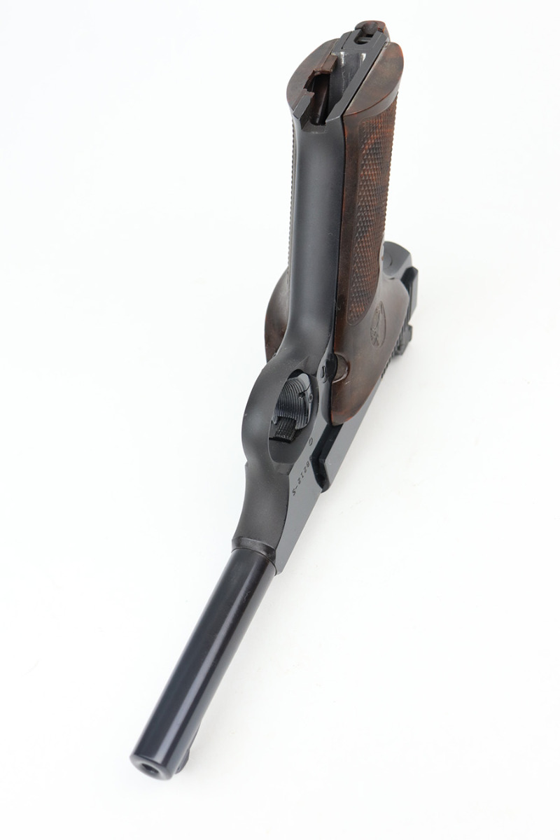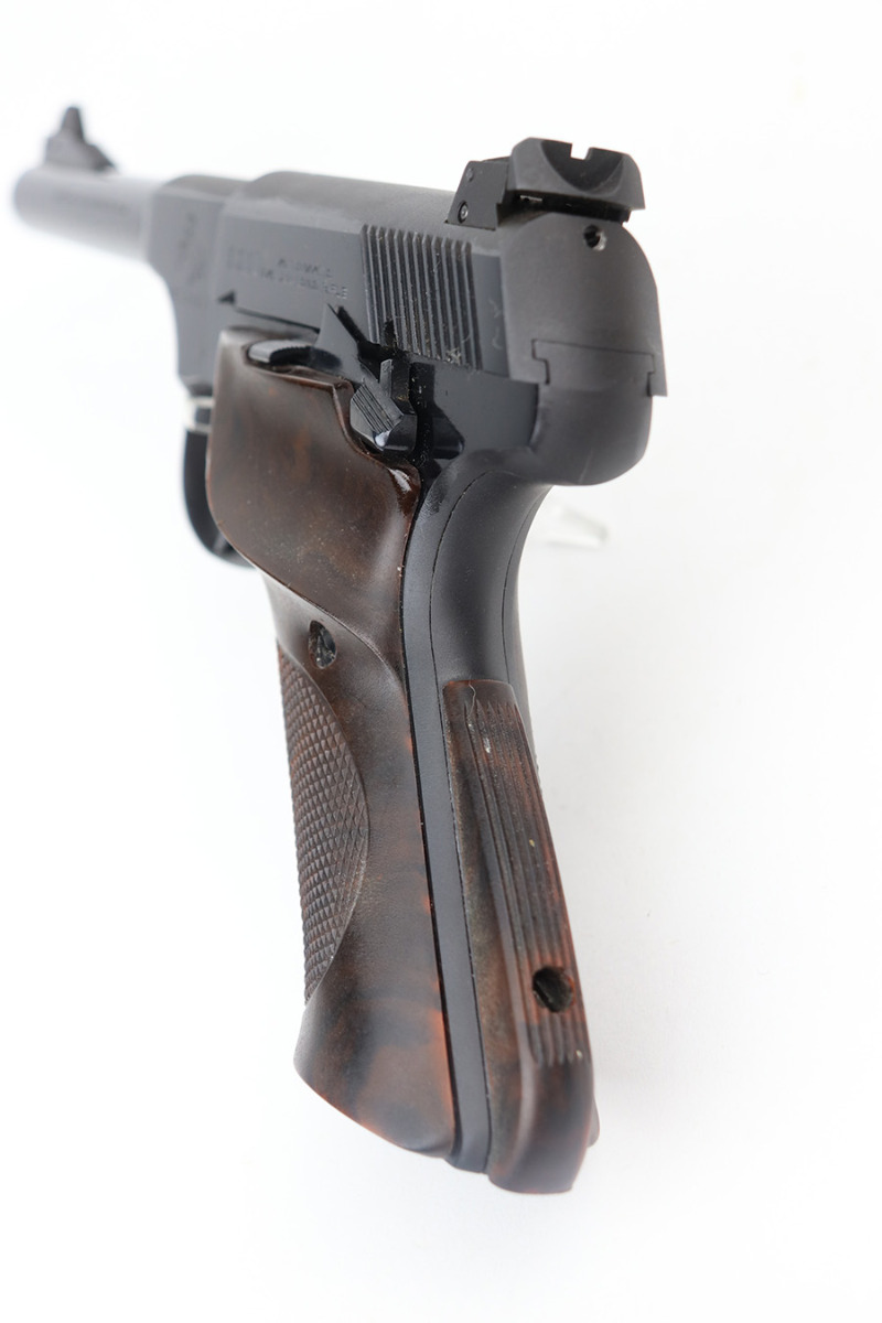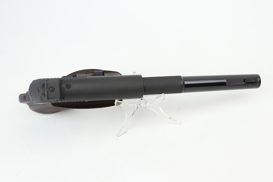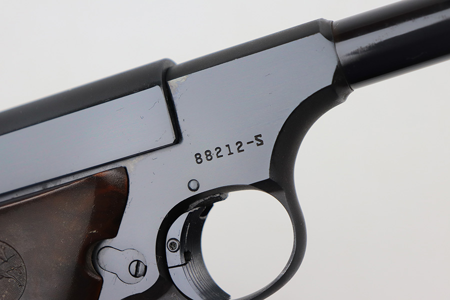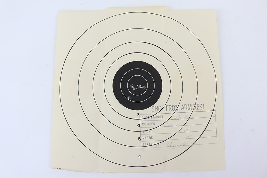 5/6/21 – This is a mint Colt Woodsman Sport, 2nd series, in the original box. It’s a desirable variation with push button magazine release. It has virtually no wear to mention and has a mint bore. Comes with the original box and matching numbered test target. Also has original manual from May of 1950, cleaning rod, and the grip adapters. Has a Arthur Grahn trigger shoe with trigger stop and original Allen wrench.