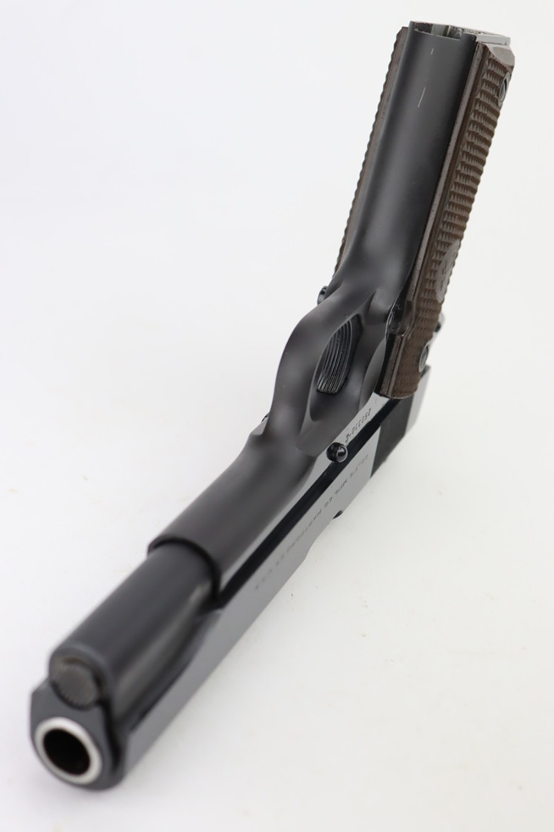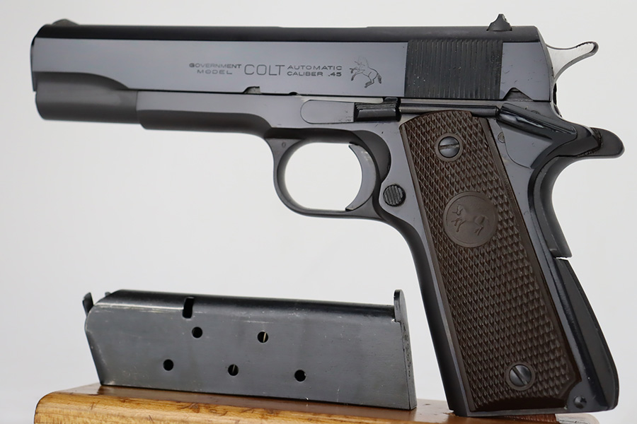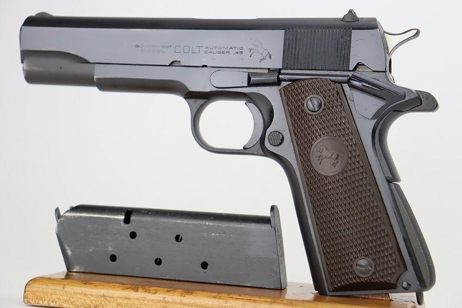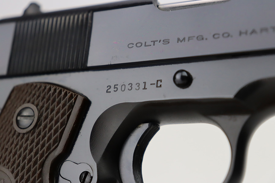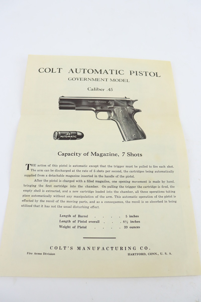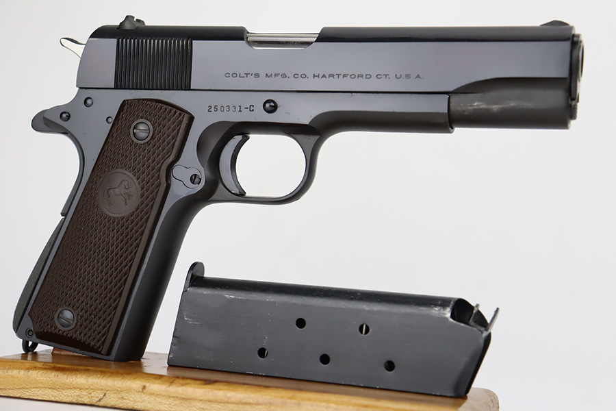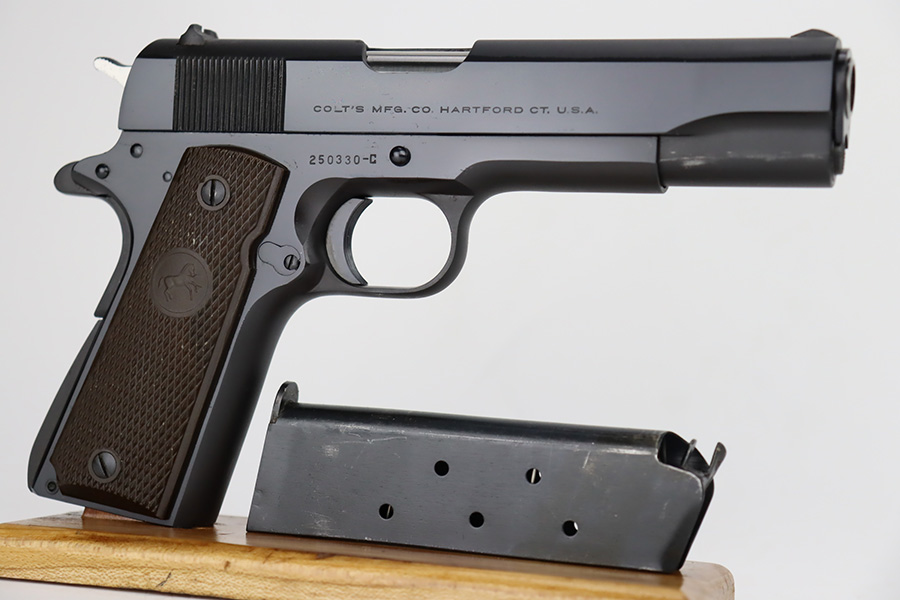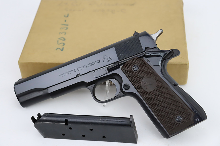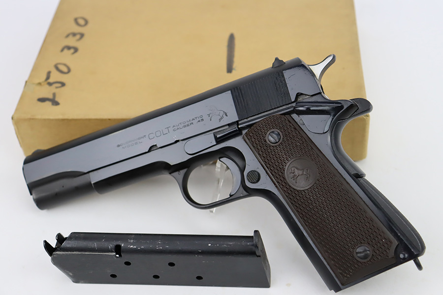 9/26/23 – This is a minty, consecutive pair of Colt Government Model 1911s in their original box. Made in 1951, each pistol appears in unused condition with just a minuscule spot of “box wear” on each slide. Mint bores, grips, etc. All correct and original guns. Very difficult to find a consecutive set, let alone in this condition and in their original boxes.
