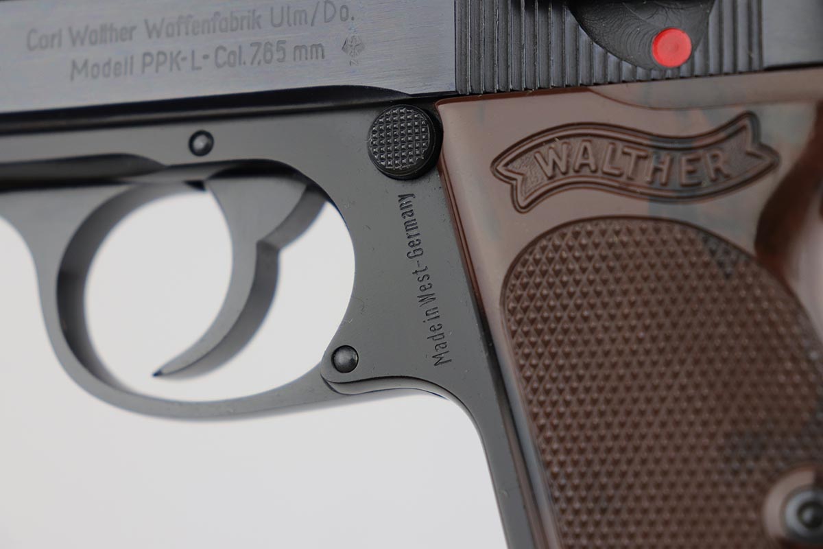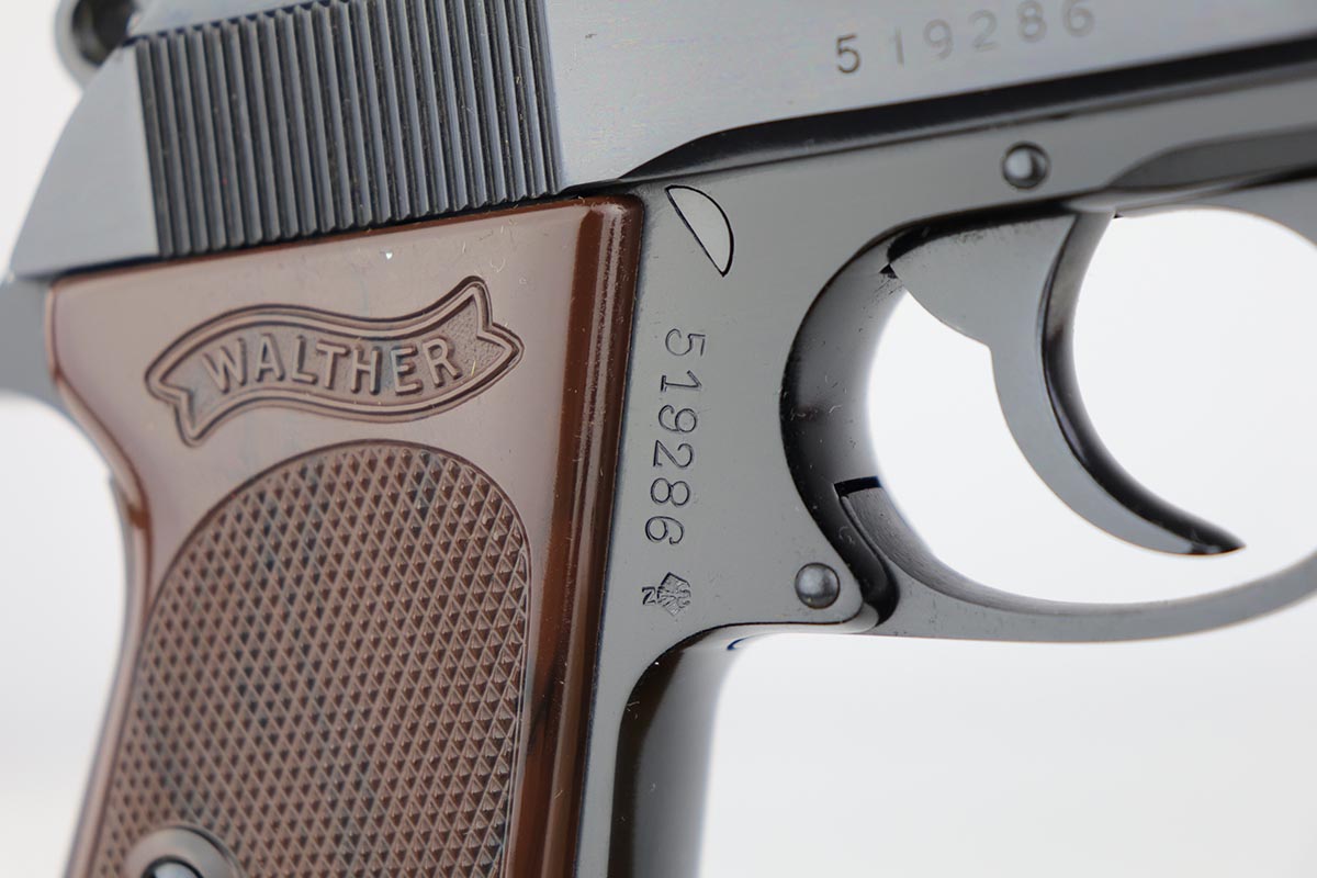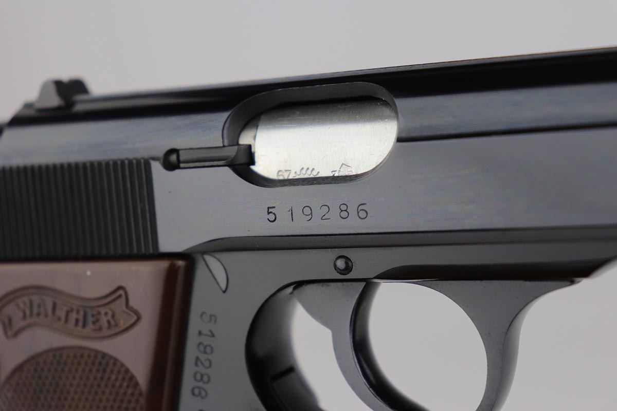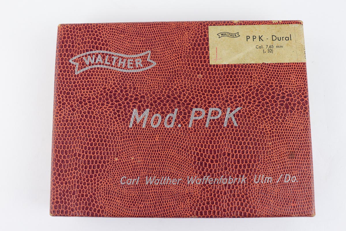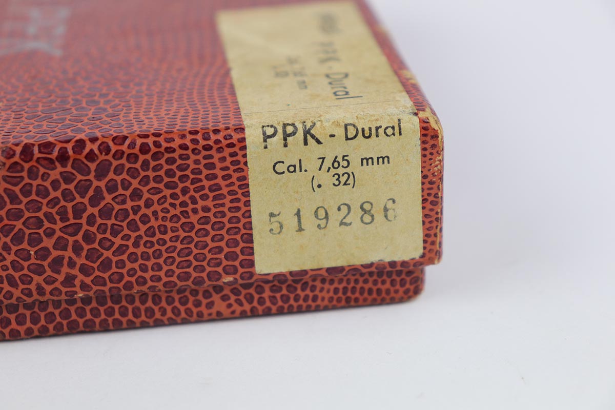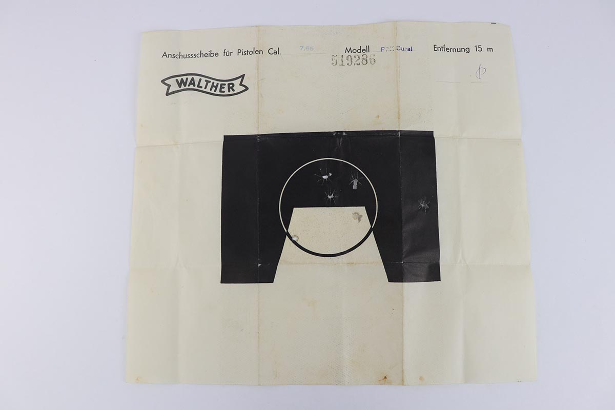 6/4/19 – Arguably the rarest variation of the post-war Walther PPK pistols, this Dural model was made in 1967 and chambered in 7.65mm(.32 ACP). It is ‘as new in the box’ and appears unfired. It is complete with a matching box and a matching test target, cleaning rod, manual, spare magazine and a small tool. The bluing is without defects and is considered by many to be the best blue that Walther produced over the last 100 years. The frame is light weight aluminum, as evidenced by PPK-L designation on the left side of the slide. Mint, impossible to upgrade example with no import or “Interarms” markings.