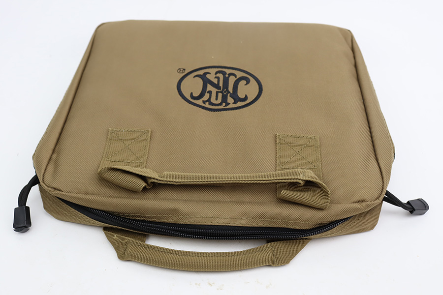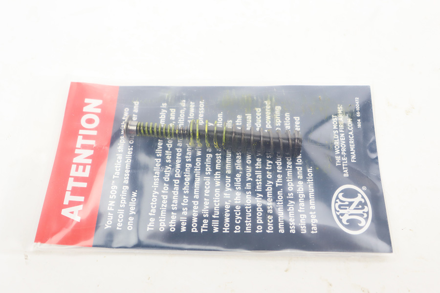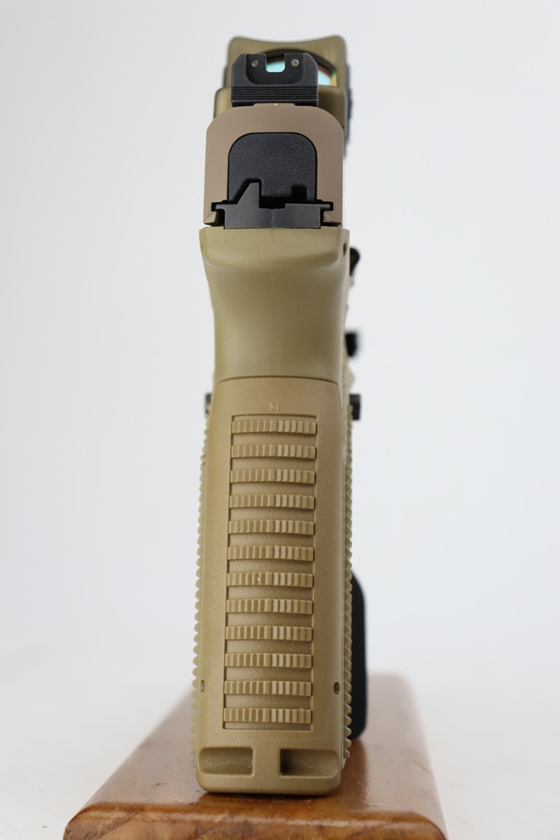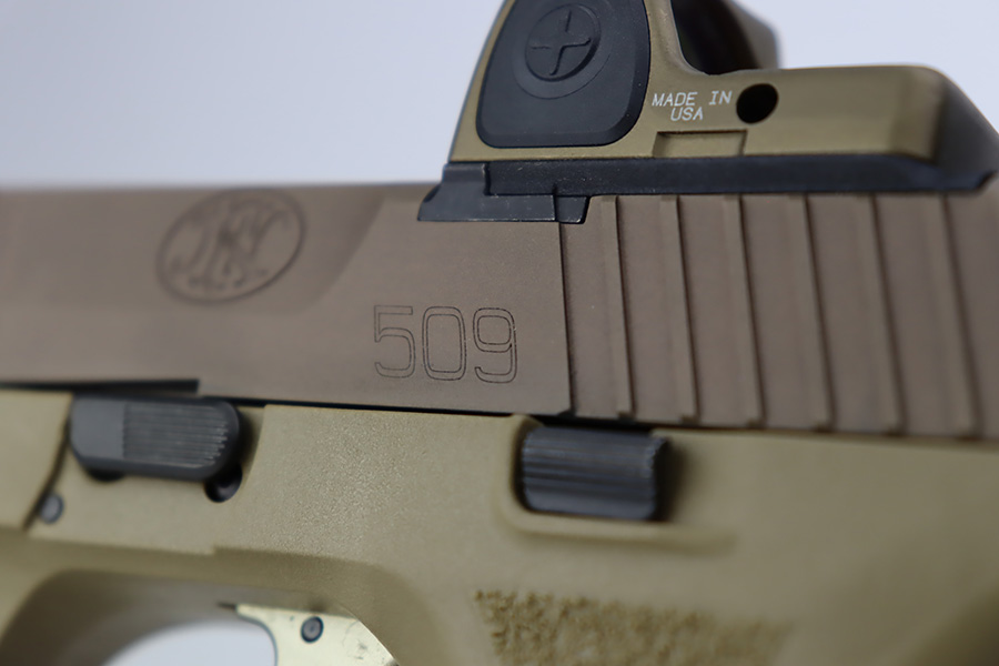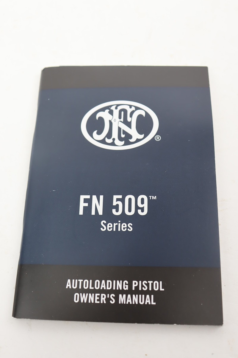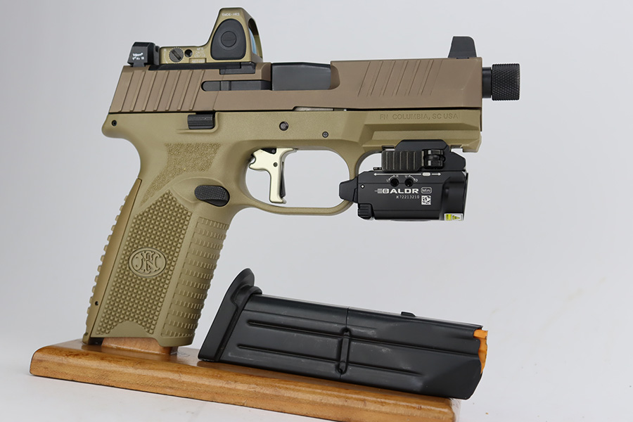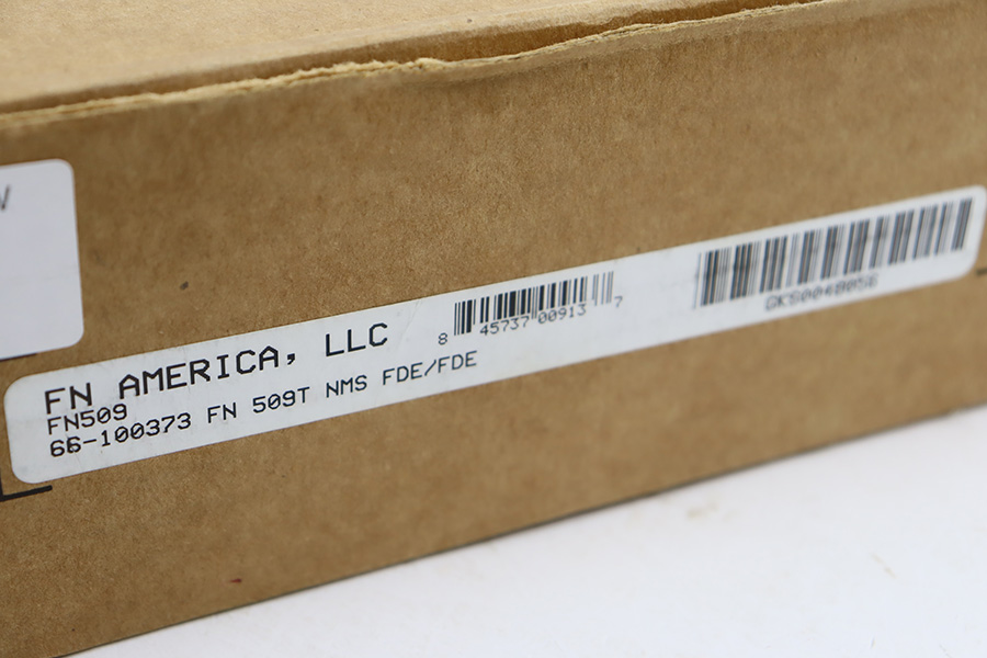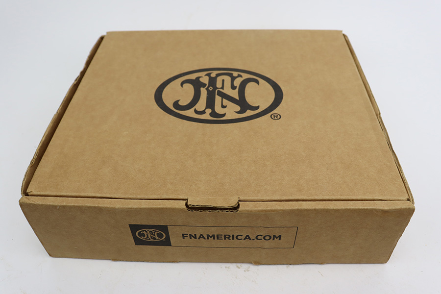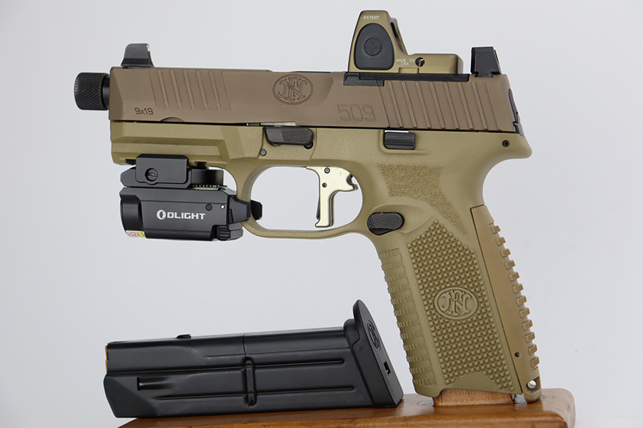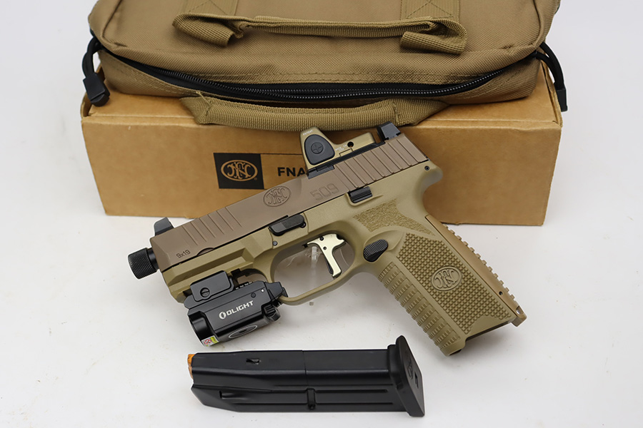 11/7/23 – This is a like-new example of an FN Model 509 in desert tan, chambered in 9mm. It has a threaded barrel and comes equipped with a red dot sight and a flashlight. Upgraded trigger. The gun comes with its original matching-numbered cardboard box, soft case, owners manual, one magazine, and some spare small parts. No signs of wear. Mint bore.