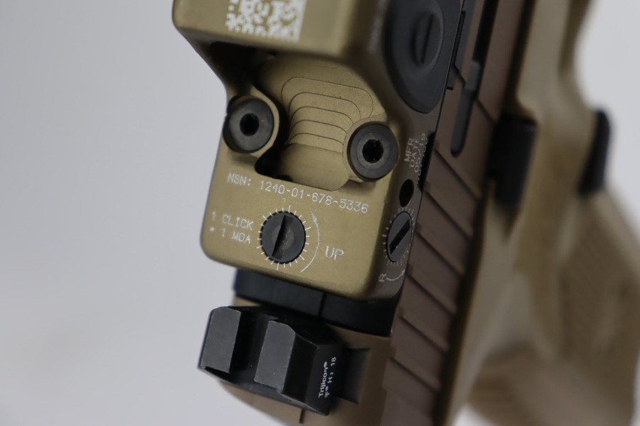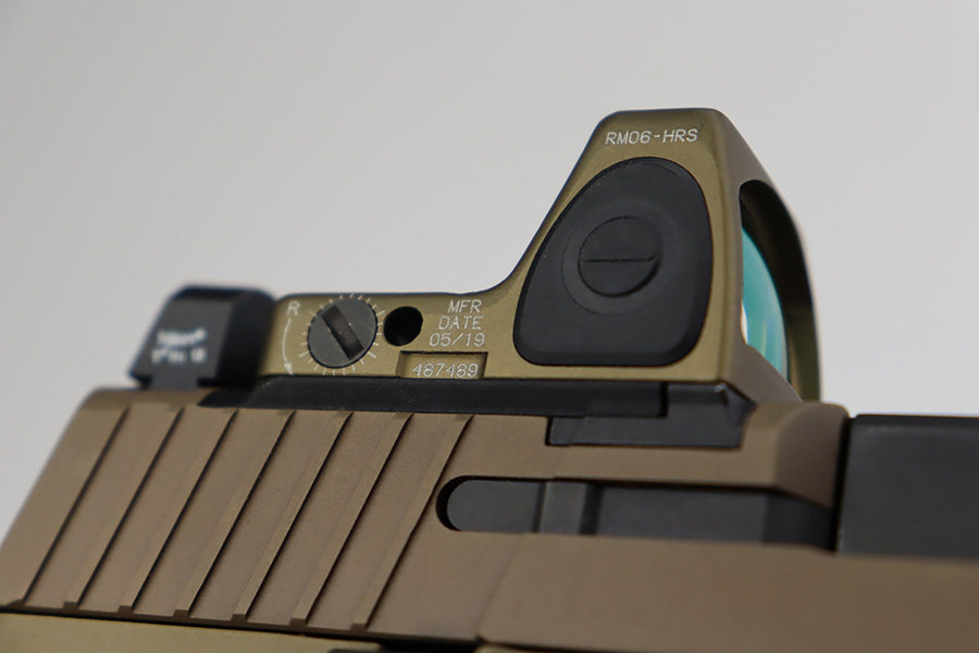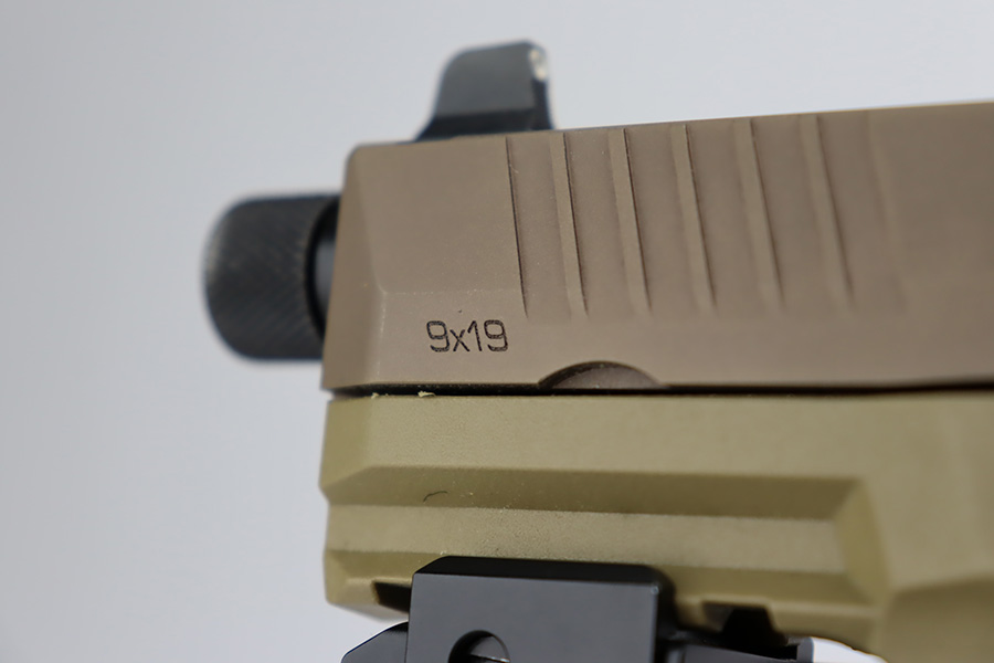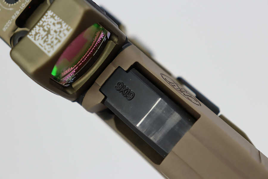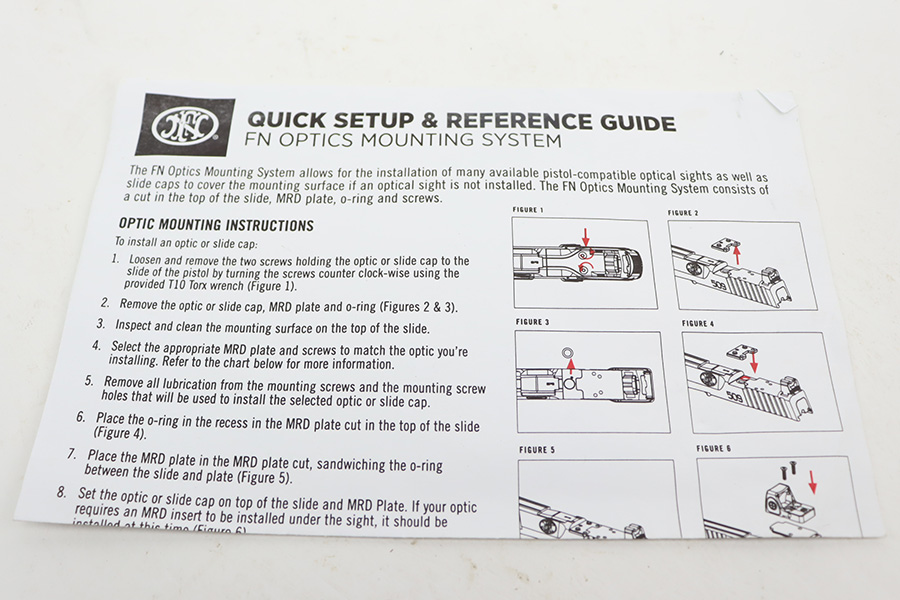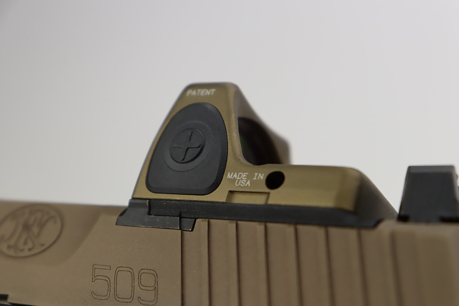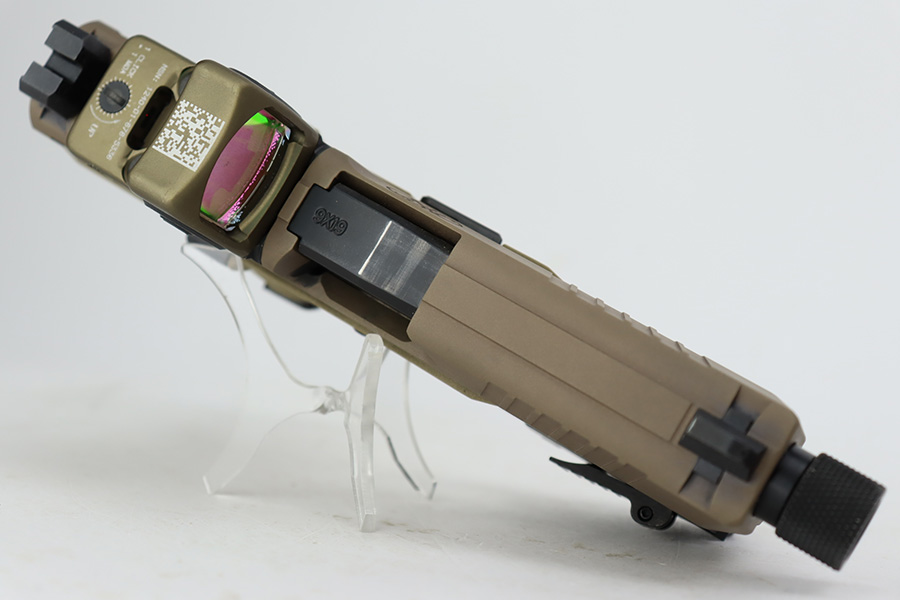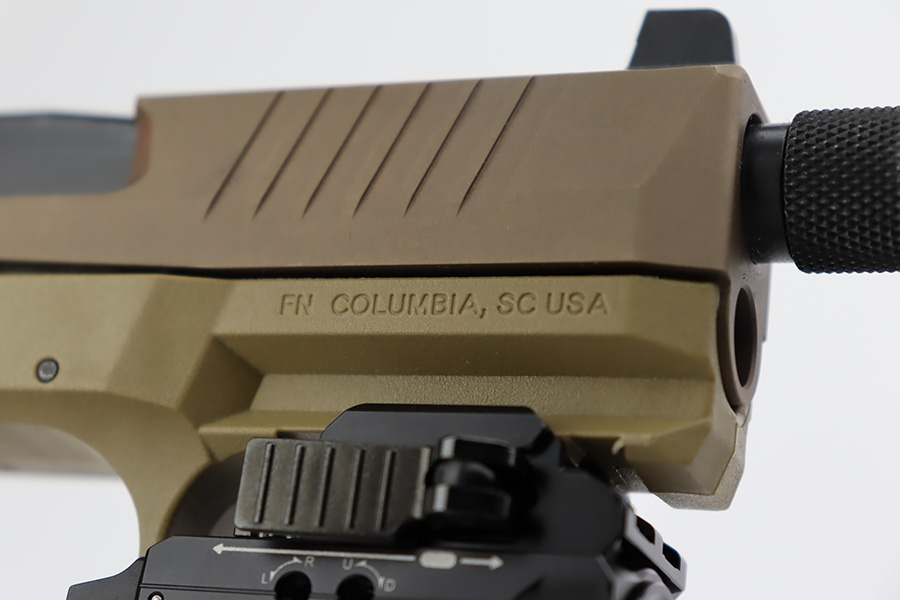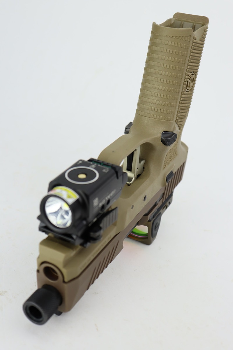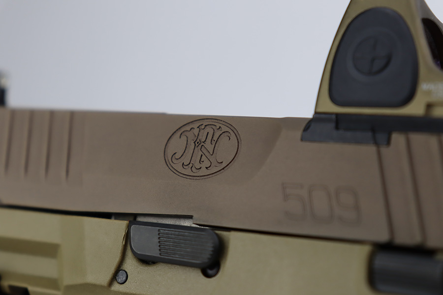 11/7/23 – This is a like-new example of an FN Model 509 in desert tan, chambered in 9mm. It has a threaded barrel and comes equipped with a red dot sight and a flashlight. Upgraded trigger. The gun comes with its original matching-numbered cardboard box, soft case, owners manual, one magazine, and some spare small parts. No signs of wear. Mint bore.