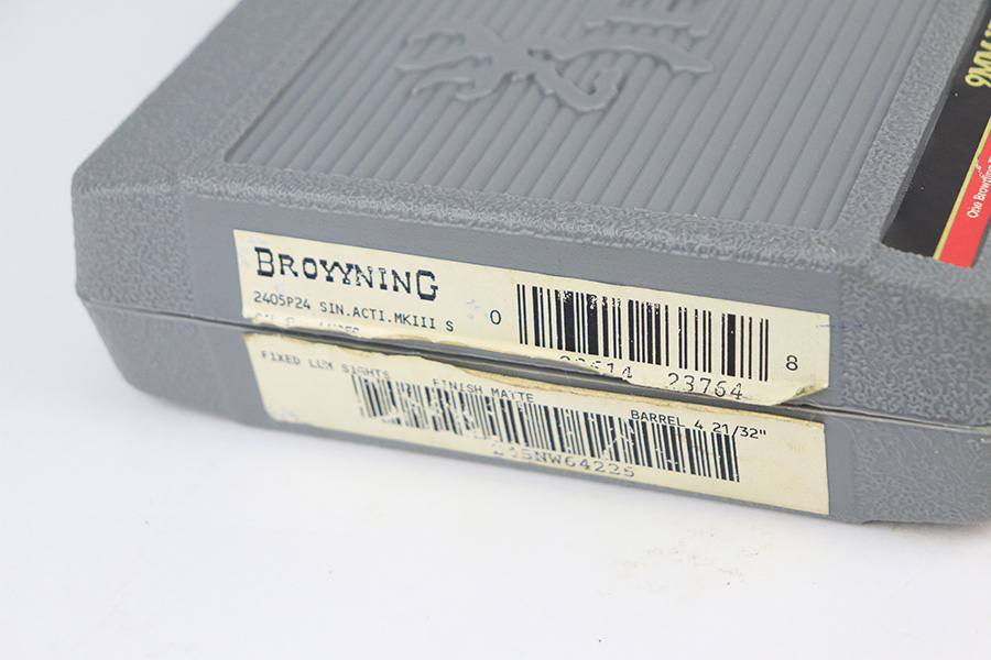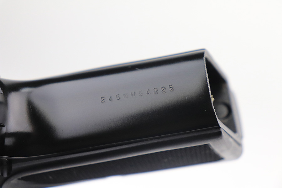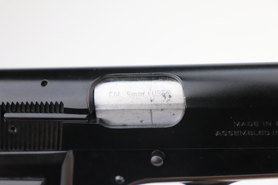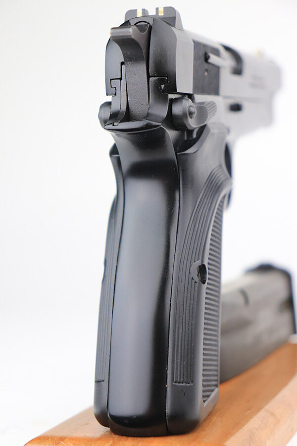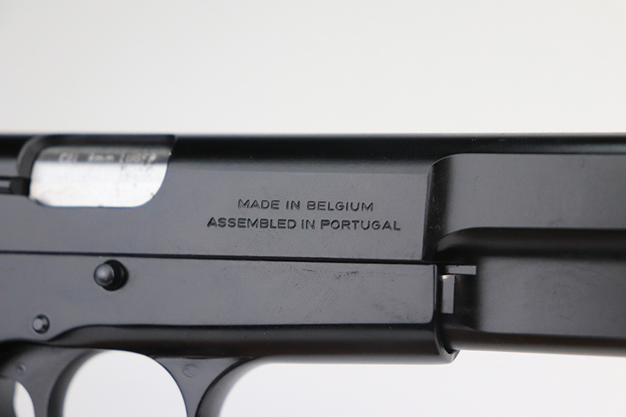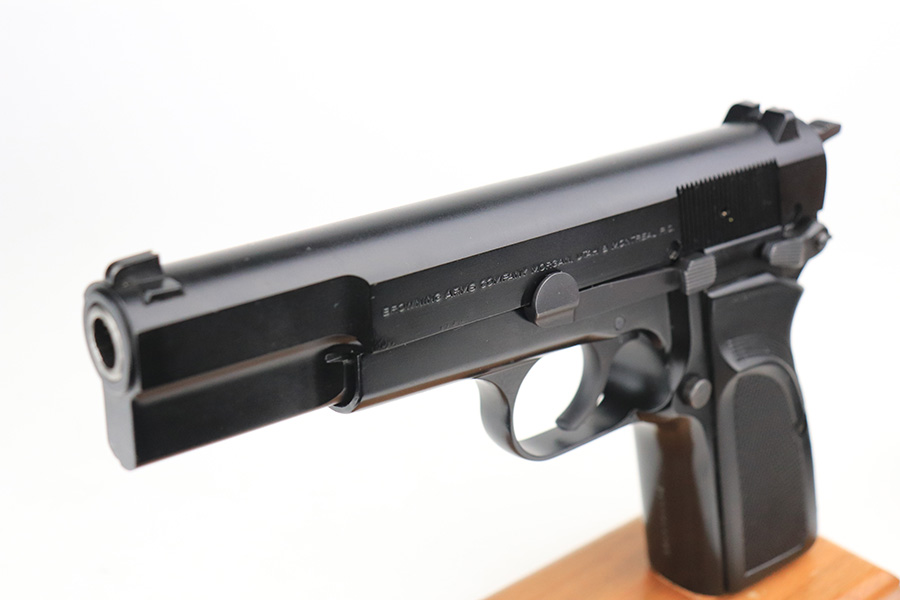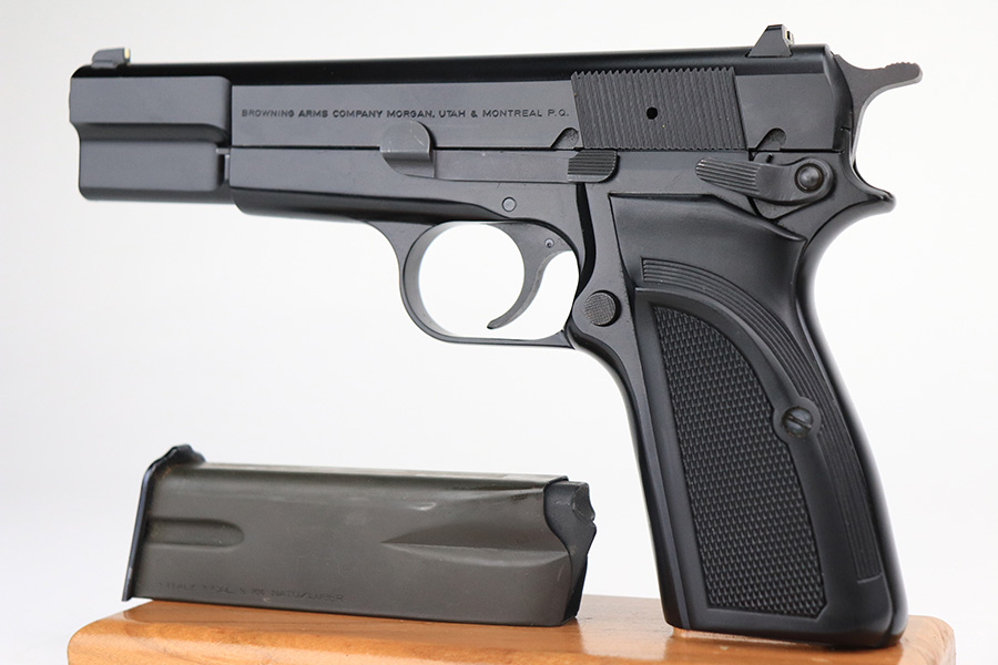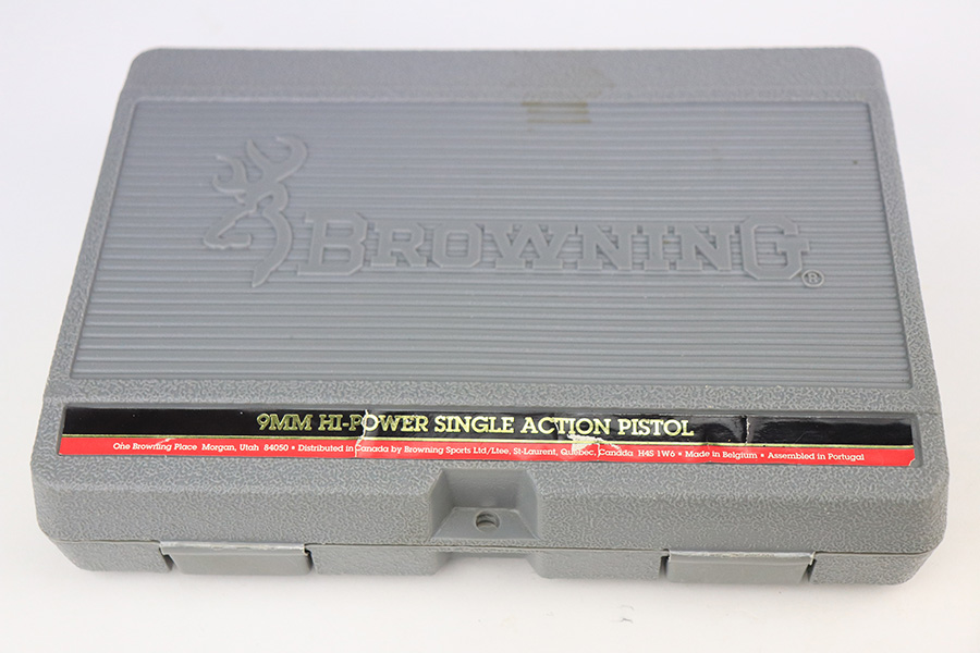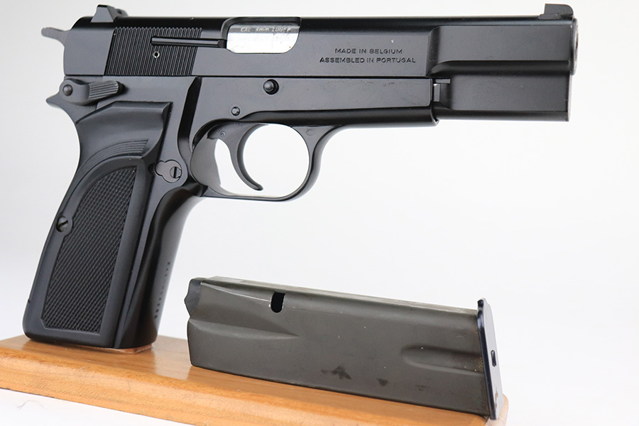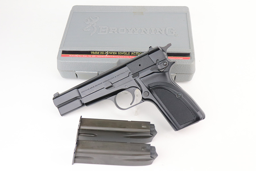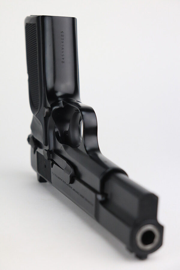 1/25/22 – This is a mint example of an FN Browning Hi Power manufactured in 1994. It was made in Belgium and assembled in Portugal. The gun is all matching and comes with the original matching hard case, owners manual, and two proper magazines. The gun is in like-new condition, retaining all of its original finish. The only sign of wear is a tiny ding in the slide around the muzzle. Comes with excellent black plastic grips. The bore is shiny with very strong rifling and just a hint of frosting in the grooves.