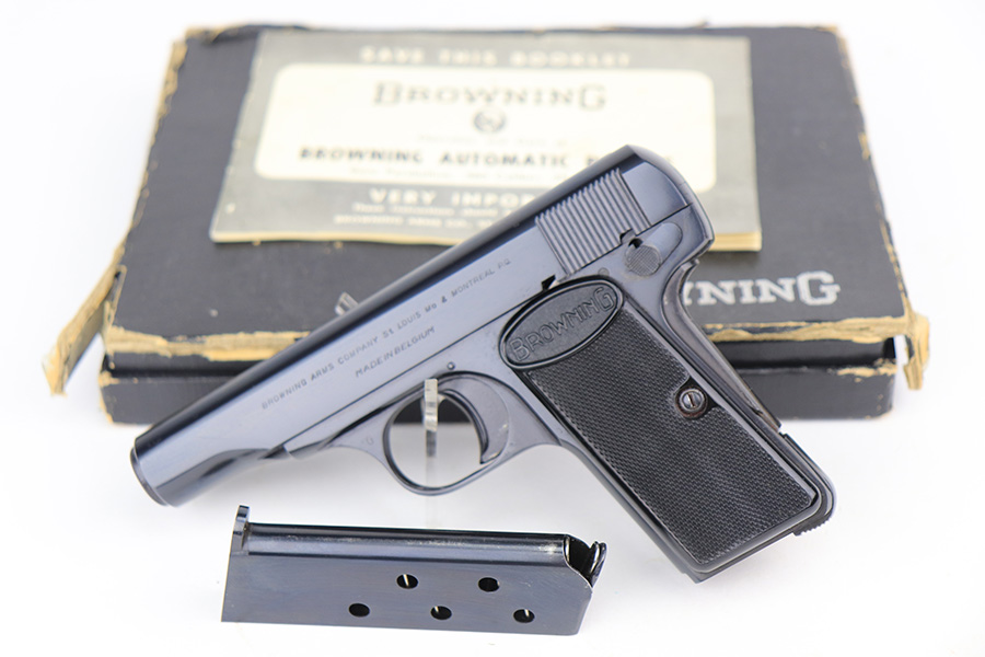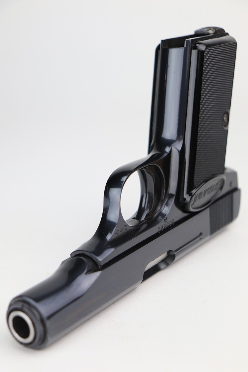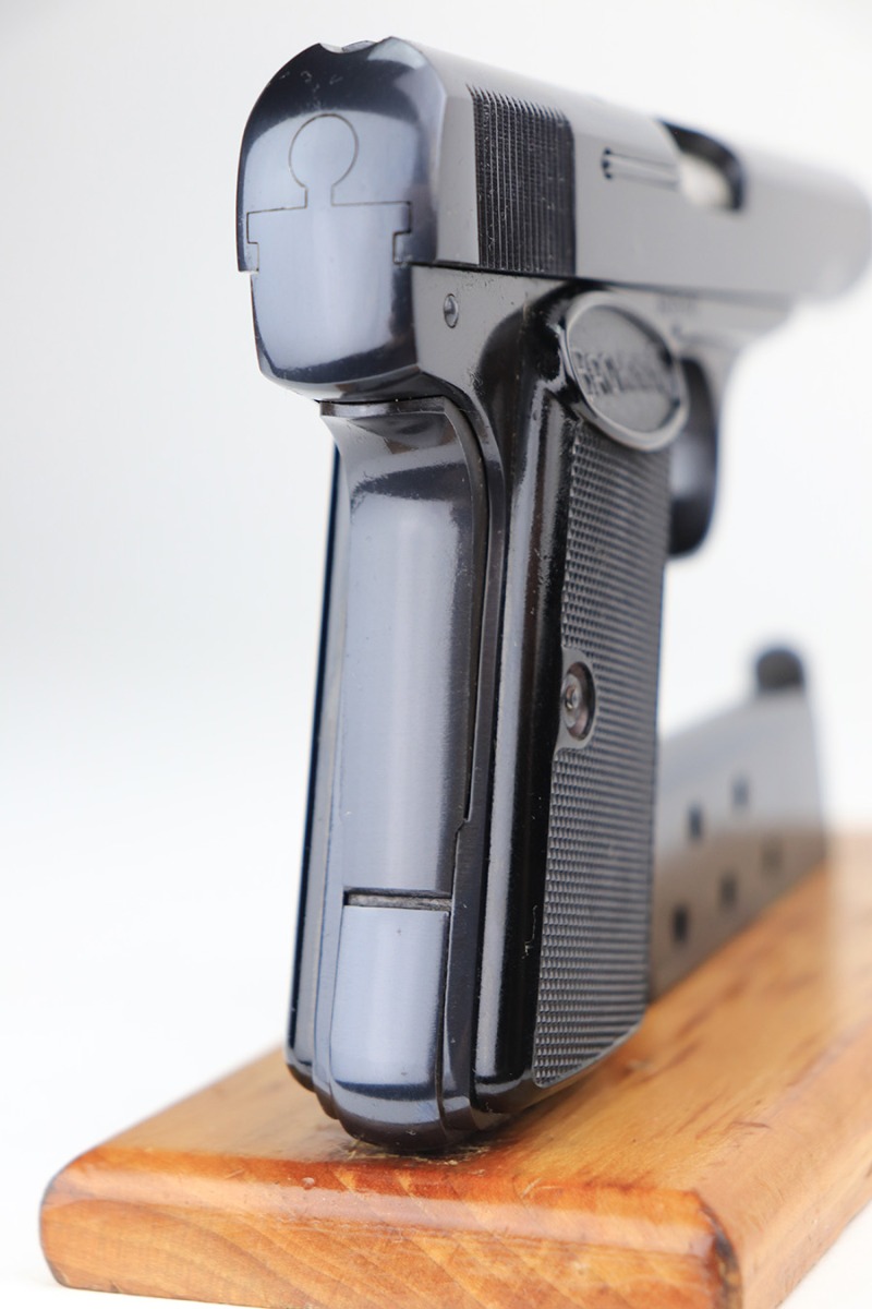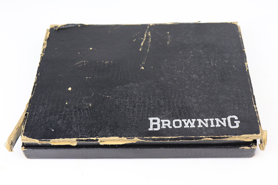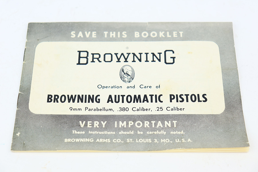 3/4/22 – This is a like-new example of an FN Browning Model 1955 manufactured in 1967. It comes with an original cardboard Browning presentation box (noticeable tears along the edges), owners manual, and an original sticker from the box. The gun has retained all of its original bright bluing with one very light scratch on the left side of the slide. Comes with excellent black plastic grips and one proper magazine. Mint bore.