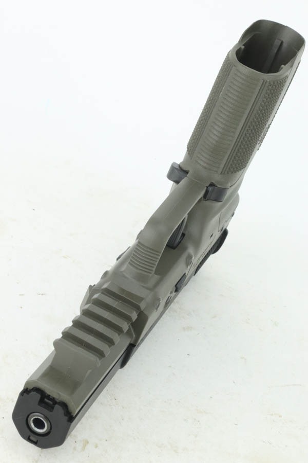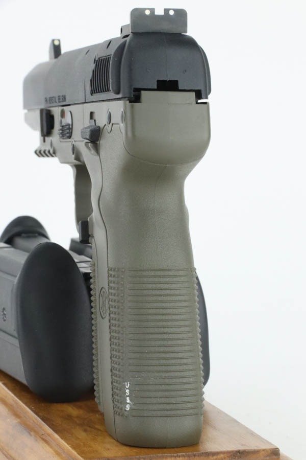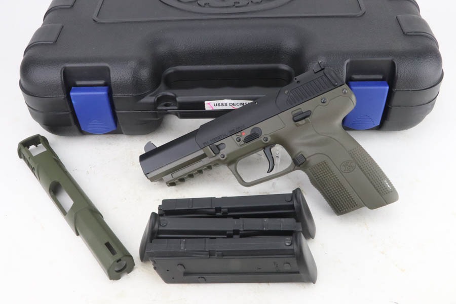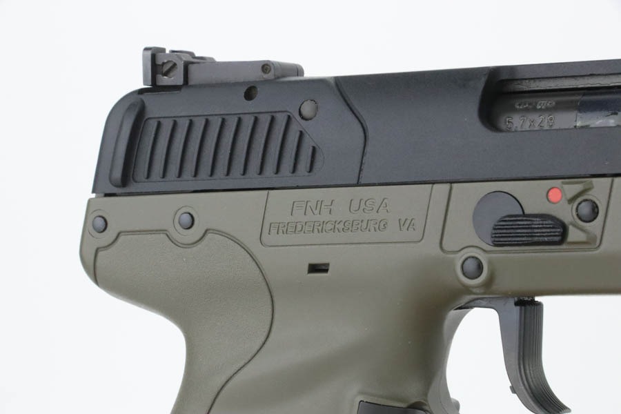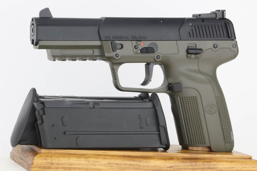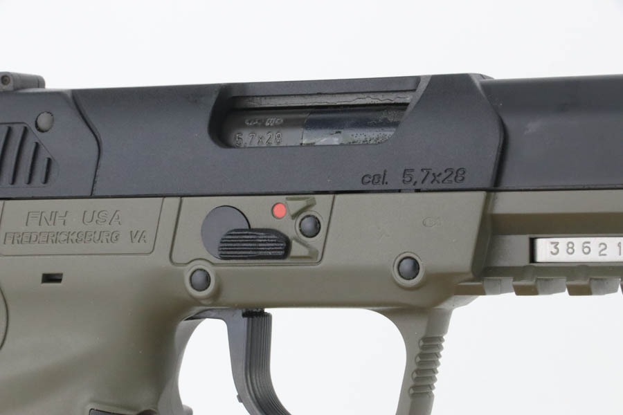 11/1/24 – This is a mint FN Five-Seven pistol, that is compete with 3 20-round mags, paperwork and accessories. Considered by many to be a truly innovative design, it is made from light weight composite materials and chambered in very potent bottle-neck 5.7MM cartridge. This cartridge is able to attain very high muzzle velocities, more comparable to carbines, than the handguns. Very ergonomic and light with 20-shot capacity, it became a favorite self protection weapon of the civilian contractors working in post-war Iraq. This one has a two-tone black and olive green finish. Comes with an extra slide.