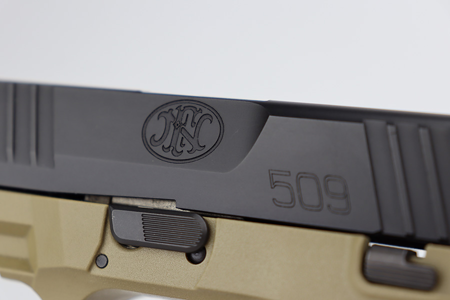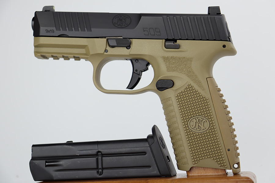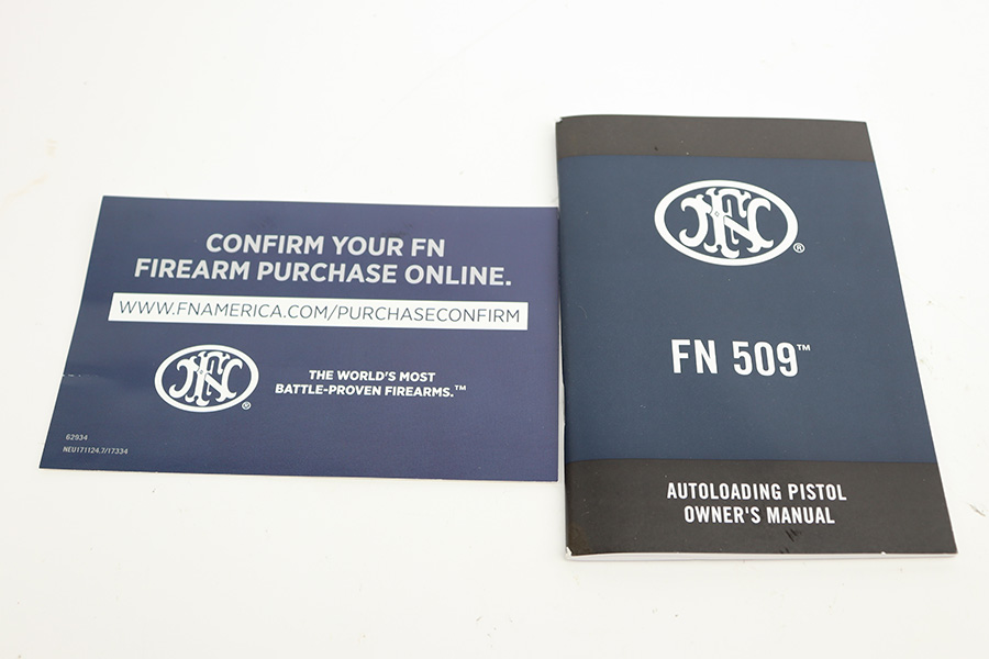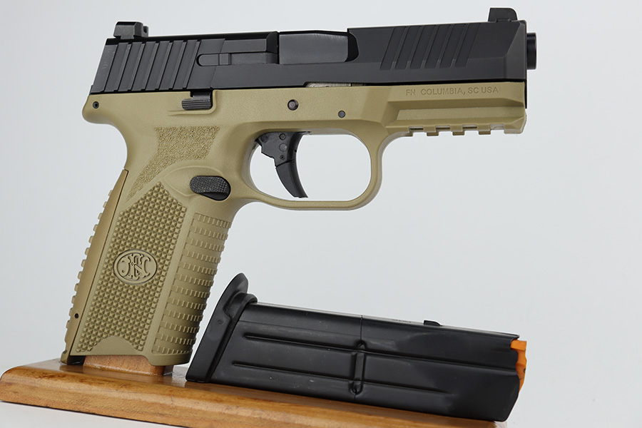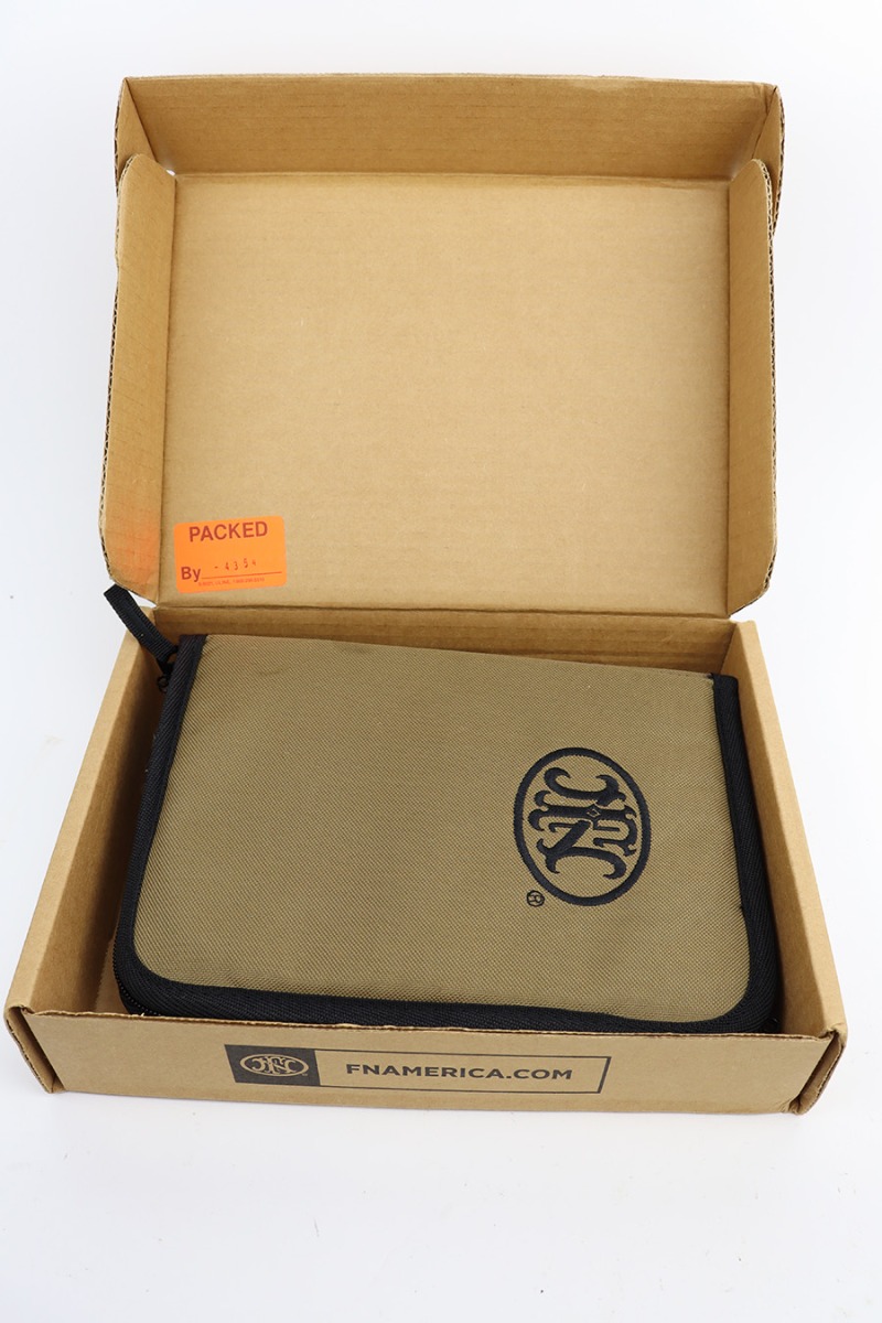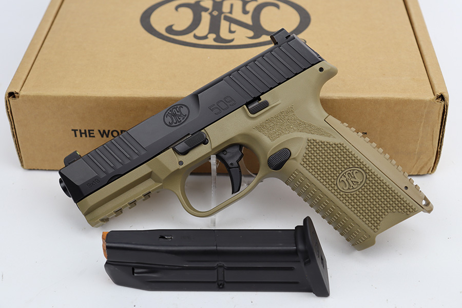 8/2/23 – This is a like-new example of an FN Model 509 chambered in 9mm. It comes with its original matching box, soft case, one magazine, owners manual, gun lock, and spare grip. It has a blued slide with a desert tan frame. The gun is like-new with no signs of wear or use. Minty bore.