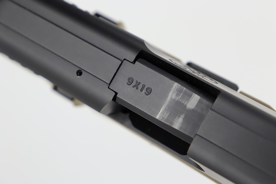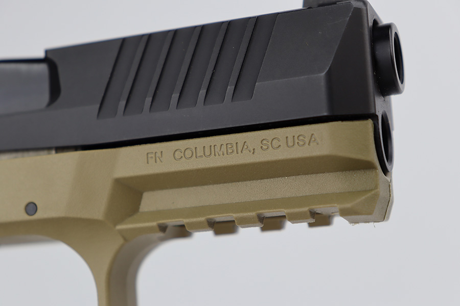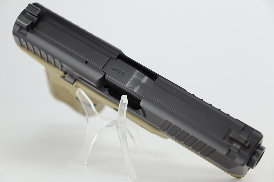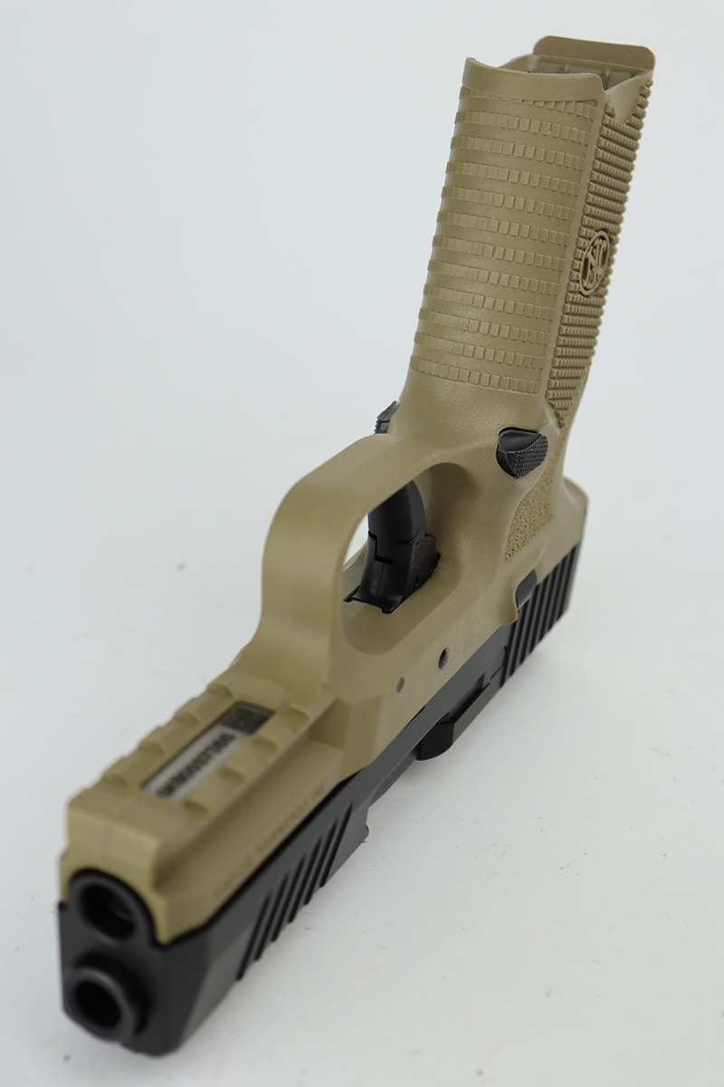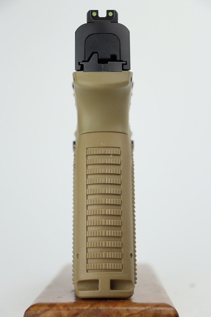 8/2/23 – This is a like-new example of an FN Model 509 chambered in 9mm. It comes with its original matching box, soft case, one magazine, owners manual, gun lock, and spare grip. It has a blued slide with a desert tan frame. The gun is like-new with no signs of wear or use. Minty bore.
