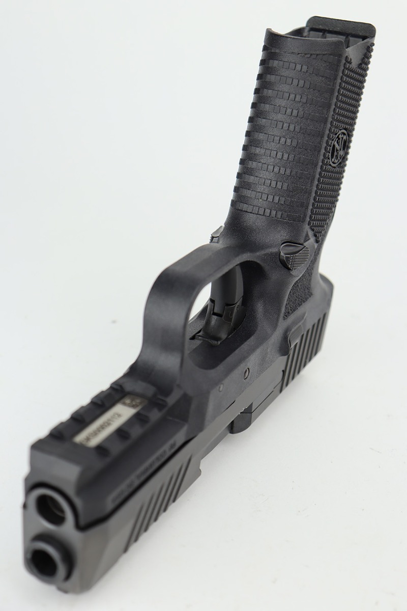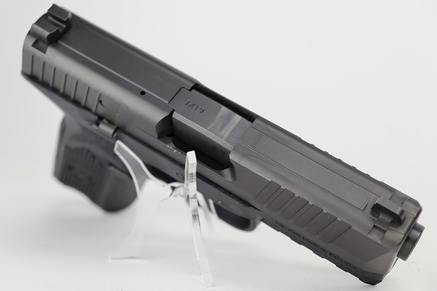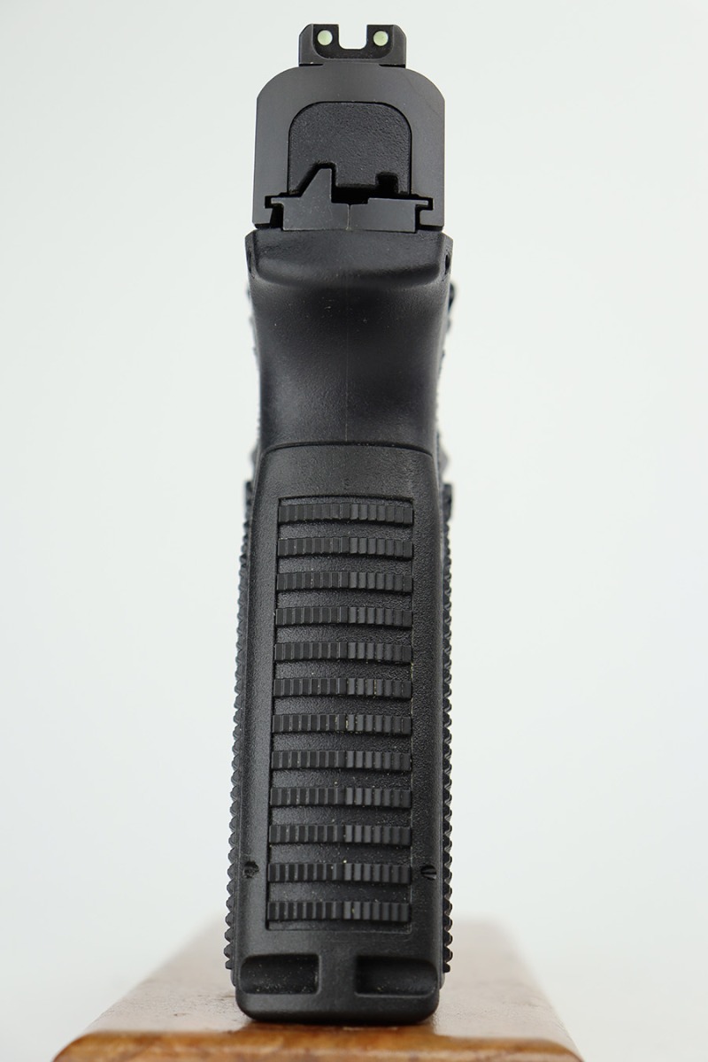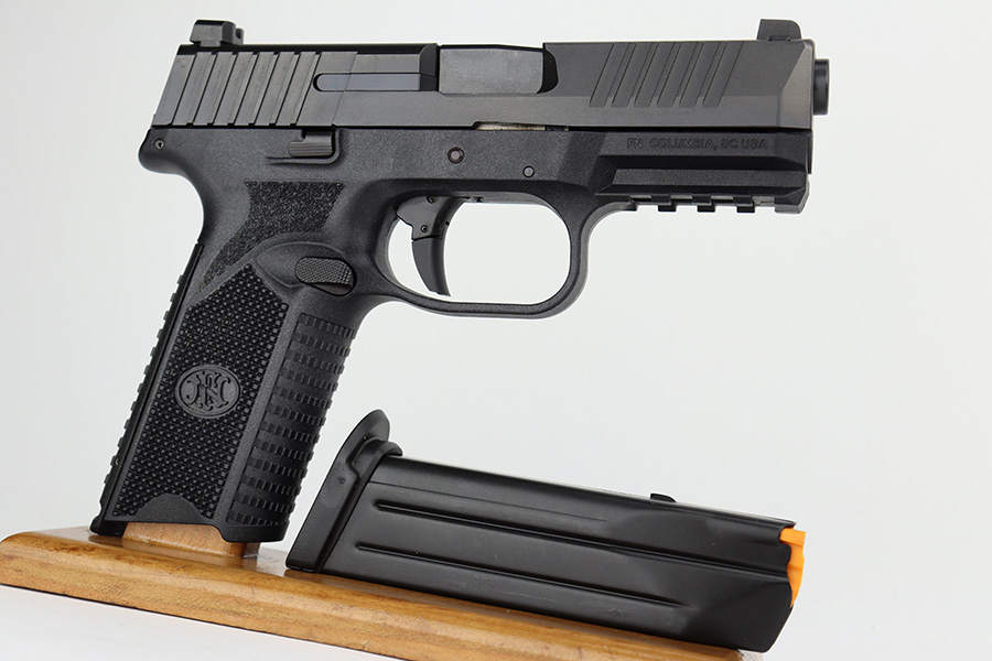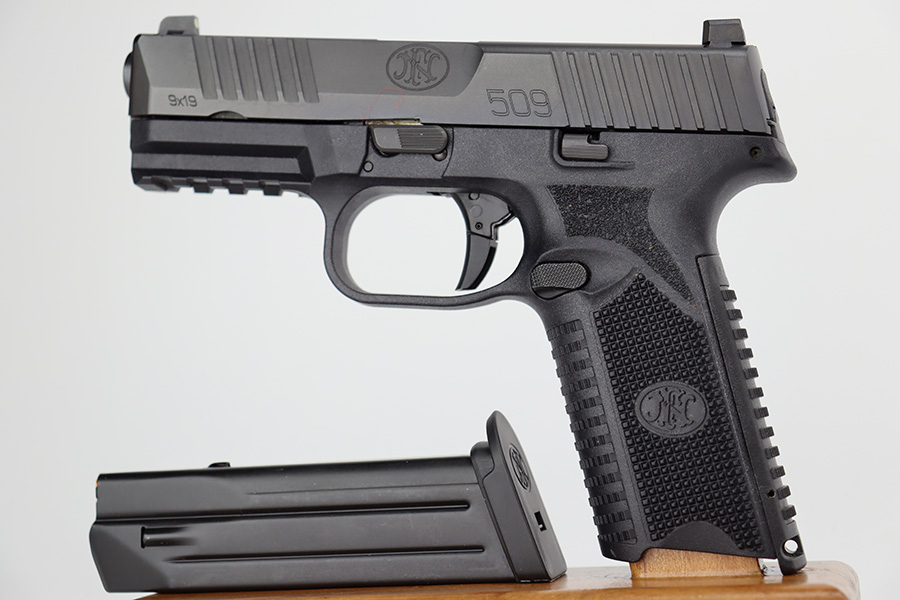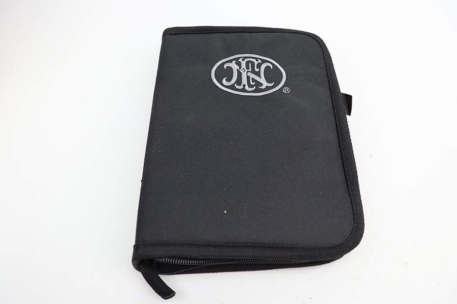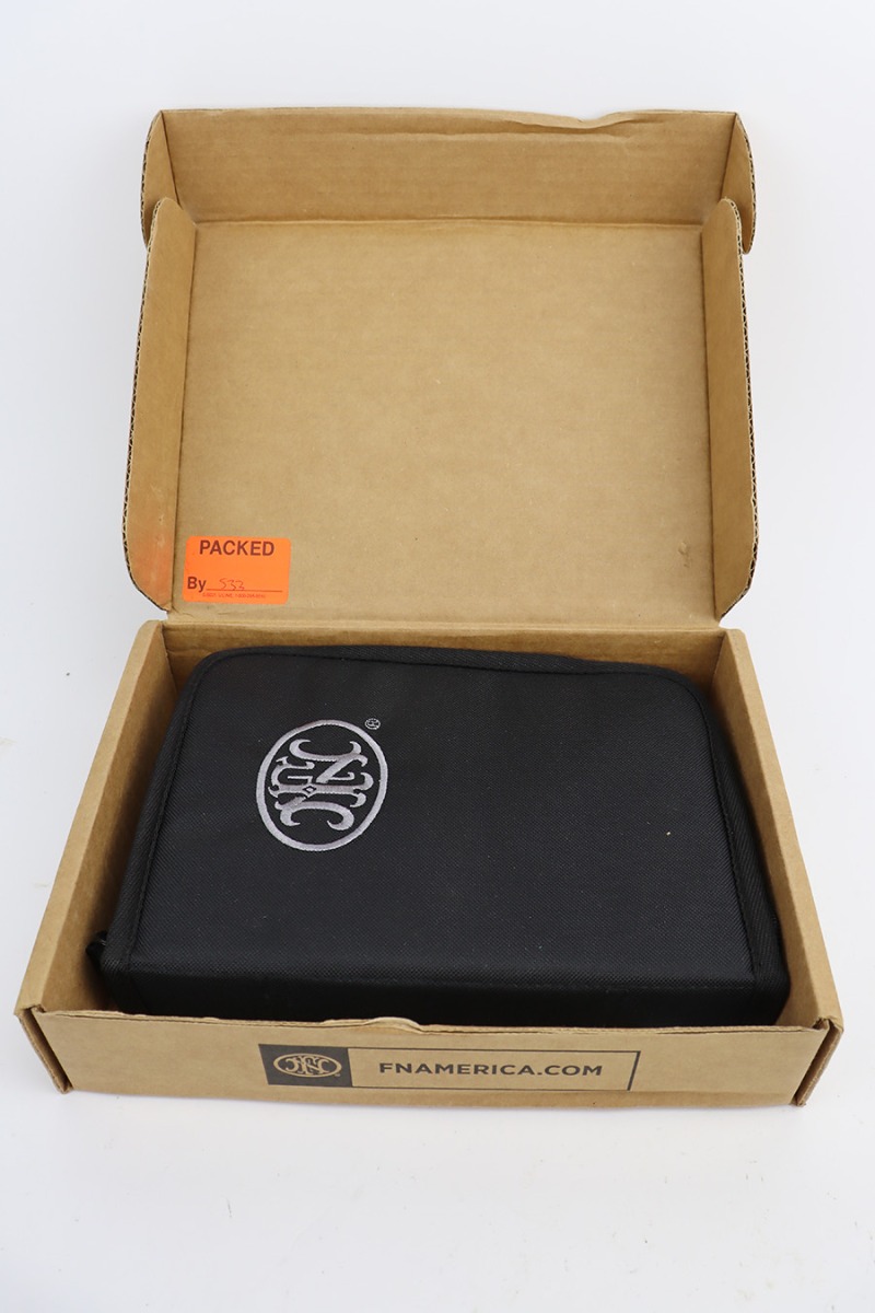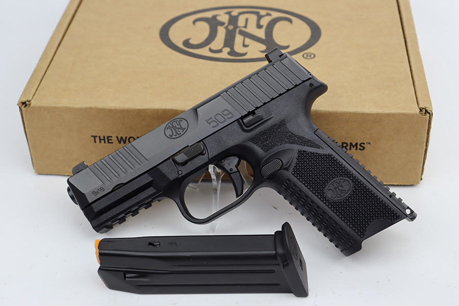 8/3/23 – This is a like-new example of an FN Model 509 chambered in 9mm. It comes with its original matching box, soft case, one magazine, gun lock, and spare grip. It has a black slide and black frame. The gun is like-new with no signs of wear. Minty bore.