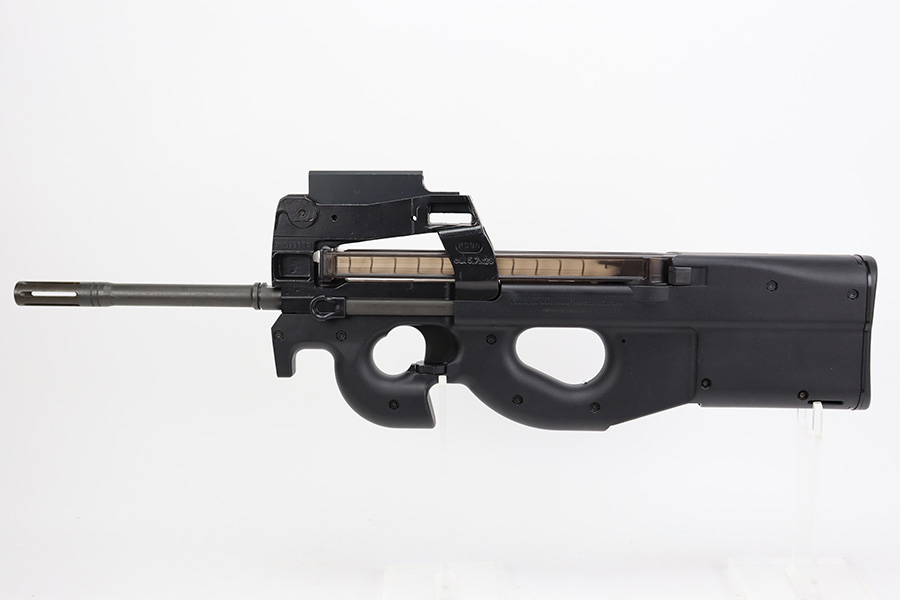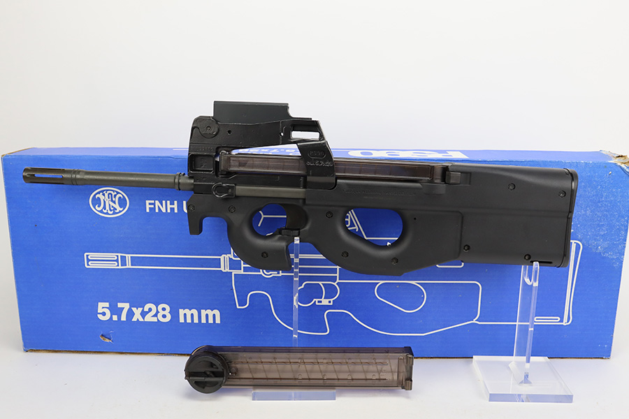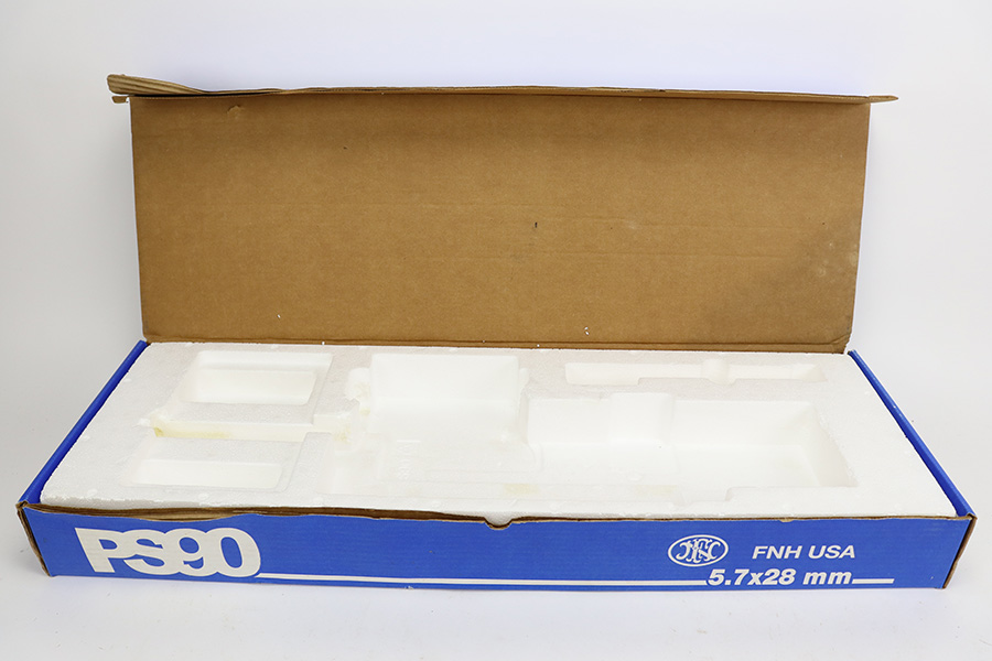 8/10/23 – This is an ANIB FNH PS90 with the secret service style sights. The gun shows no wear or notable signs of use with a minty bore. The rifle comes in the original, matching blue box with spare magazine, manual, and lock. It features the P90 ring sight that was used by hundreds of law enforcement agencies, including the secret service. 16in barrel, 30rd mags. The listing also includes 100rds of Federal American Eagle ammunition (40gr).