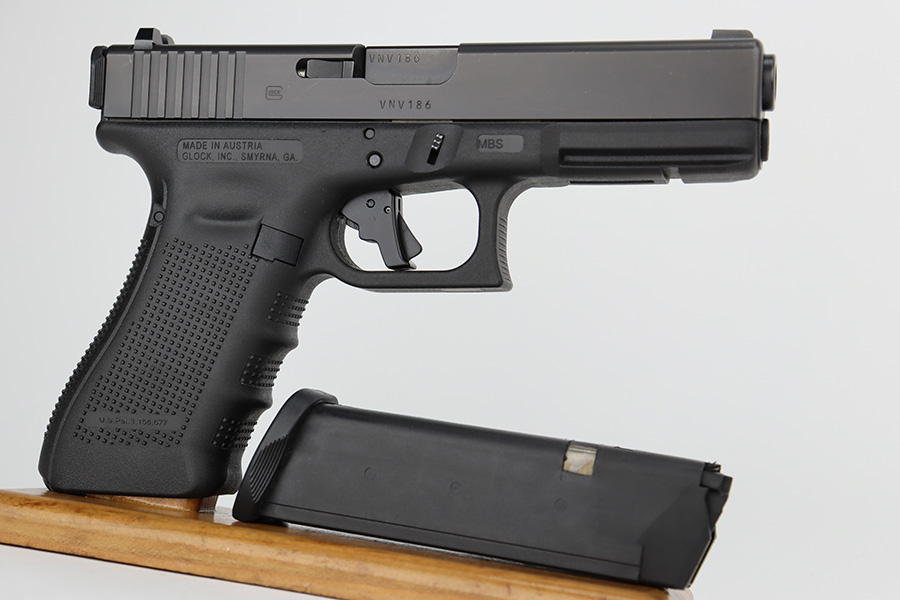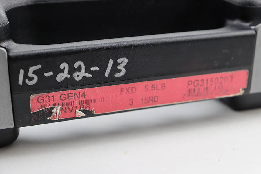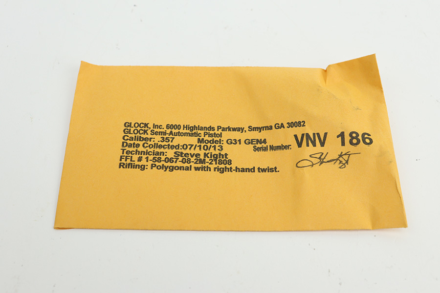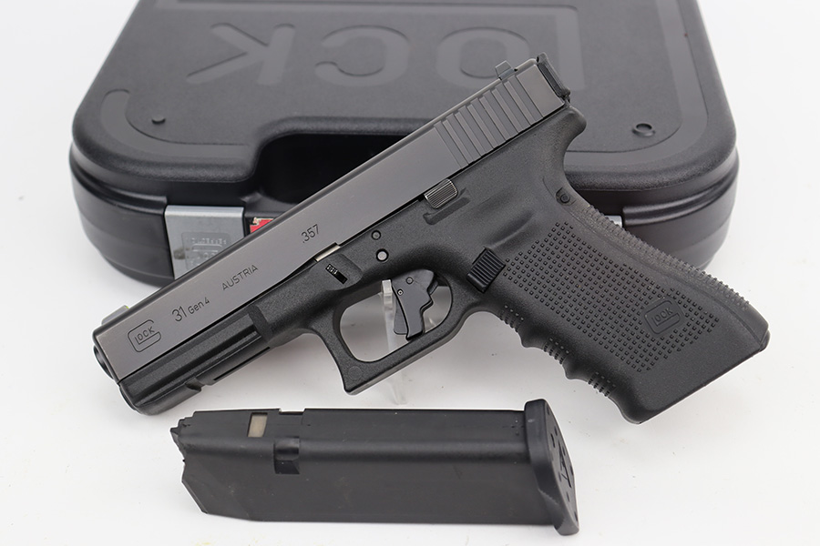 8/3/23 – This is a like-new example of a Gen 4 Glock 31, chambered in .357. It is matching and comes with its original matching-numbered box, owners manual, sales papers, spare grips, loading tool, cleaning rod and brush, original test casing, and one magazine. Upgraded trigger. The gun is in like-new condition with no signs of wear or use. Mint bore.