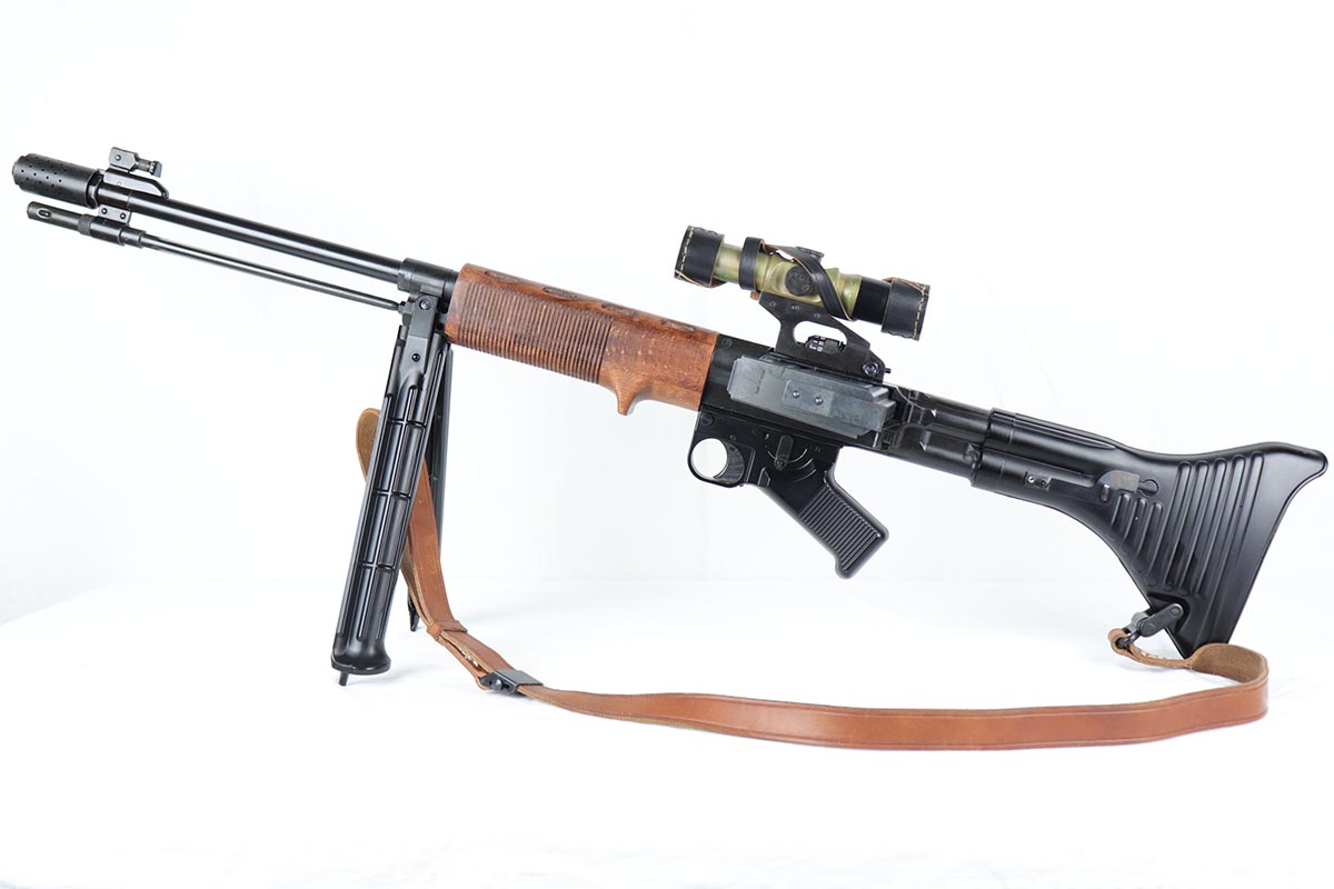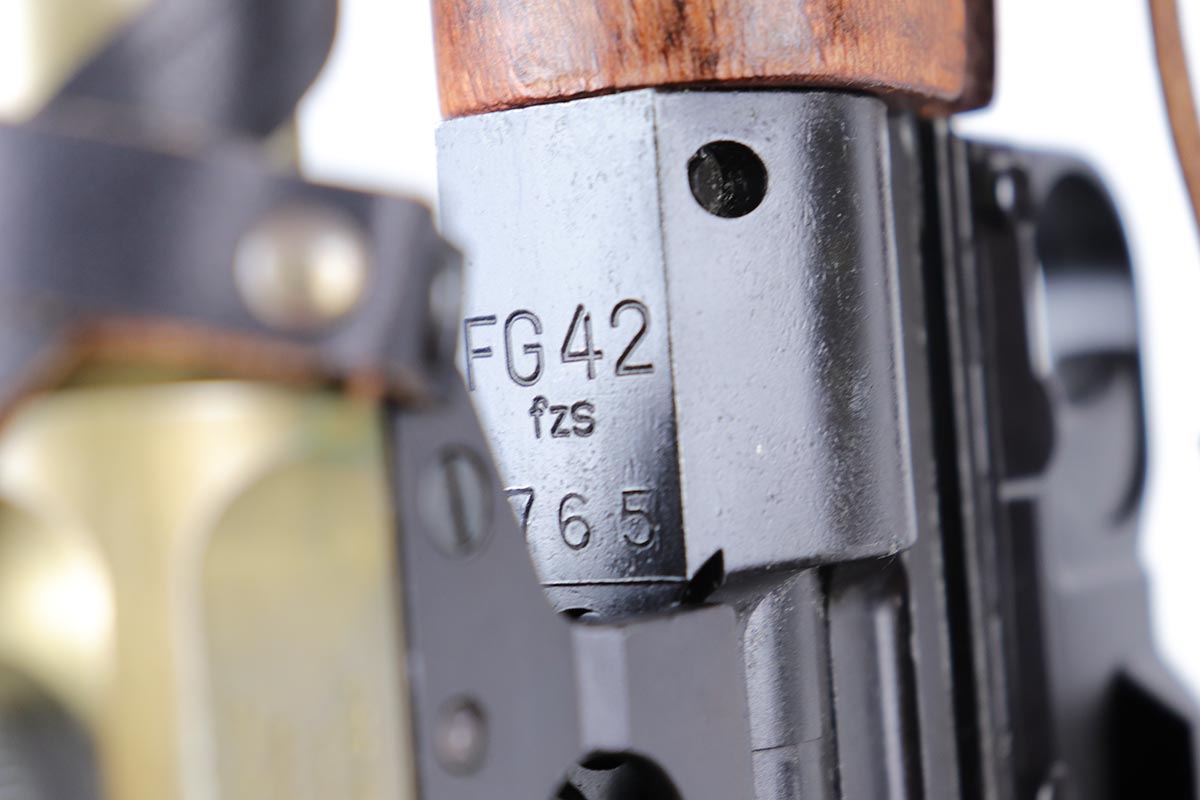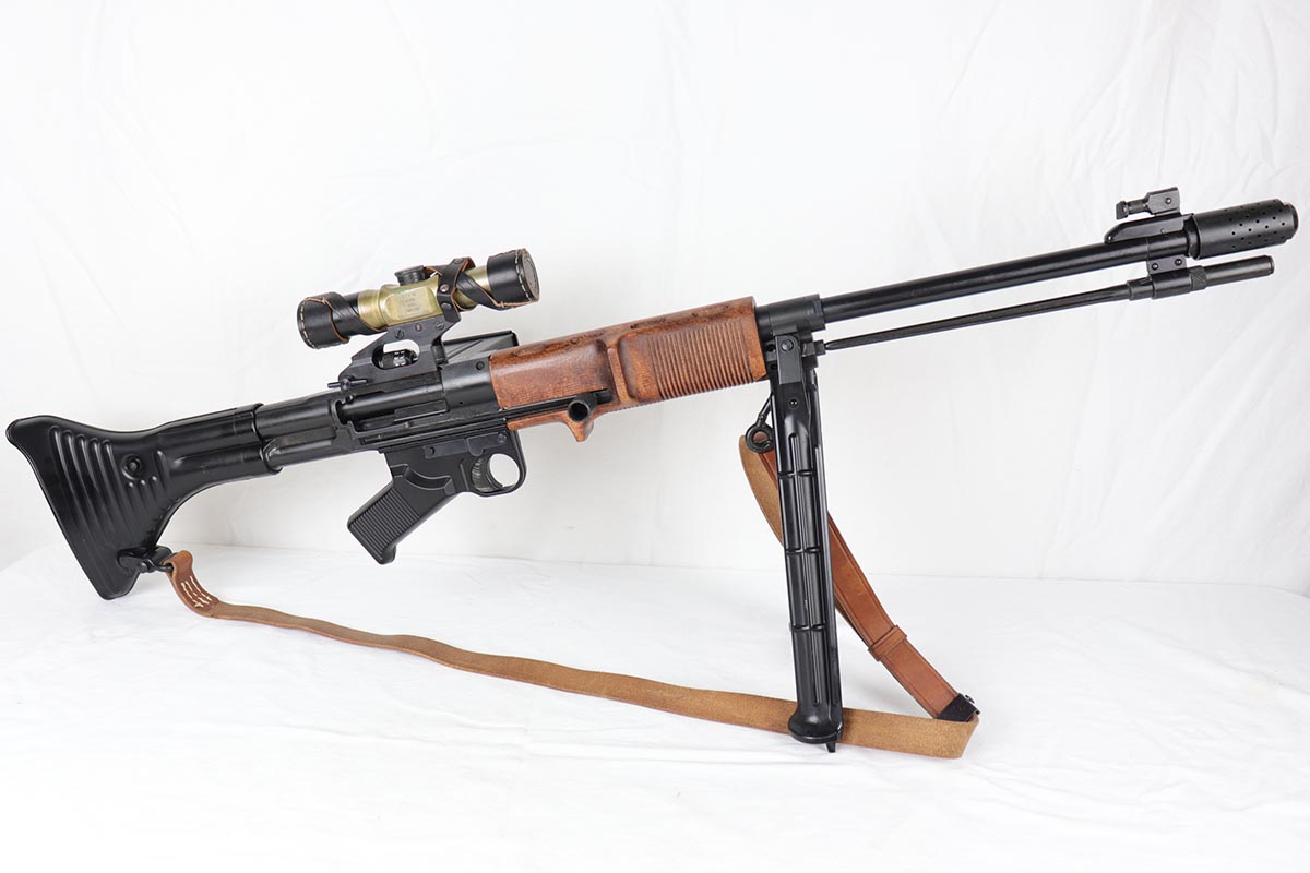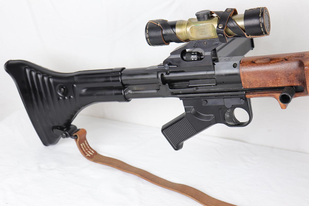 10/25/18 – This is a very cool Japanese reproduction of a German FG 42 from World War II in the original box. Manufactured by Shoei, it comes with a manual and canvas ammo belt, as well as reproduction scope and mount. This is a non-firing model that can be loaded and disassembled just like a real FG 42. It is a museum quality replica of a German WWII era FG 42. This replica is specifically designed to not be convertible to a real firearm. This reproduction is highly detailed and would satisfy re-enactors with its detail and quality.
